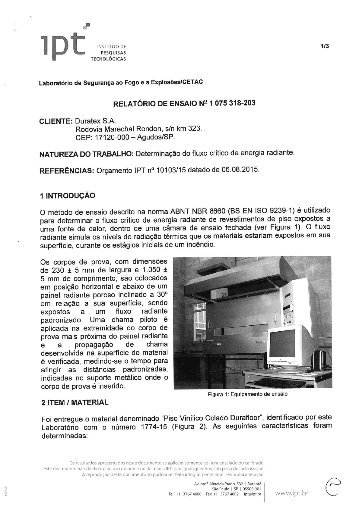 INSTITUTO DE 1/3 PESQUISAS TECNOLÓGICAS Laboratório de Segurança ao Fogo e a Explosões/CETAC RELATÓRIO DE ENSAIO № 1 075 318-203 CLIENTE: Duratex S.A. Rodovia Marechal Rondon, s/n km 323. CEP: 17120-000 Agudos/SP. NATUREZA DO TRABALHO: Determinação do fluxo crítico de energia radiante. REFERÊNCIAS: Orçamento IPT n° 10103/15 datado de 06.08.2015. 1 INTRODUÇÃO método de ensaio descrito na norma ABNT NBR 8660 (BS EN ISO 9239-1) é utilizado para determinar o fluxo crítico de energia radiante de revestimentos de piso expostos a uma fonte de calor, dentro de uma câmara de ensaio fechada (ver Figura 1). fluxo radiante simula os níveis de radiação térmica que os materiais estariam expostos em sua superfície, durante os estágios iniciais de um incêndio. Os corpos de prova, com dimensões de 230 ± 5 mm de largura e 1.050 ± 5 mm de comprimento, são colocados em posição horizontal e abaixo de um painel radiante poroso inclinado a 30° em relação a sua superfície, sendo expostos a um fluxo radiante padronizado. Uma chama piloto é aplicada na extremidade do corpo de prova mais próxima do painel radiante e a propagação de chama desenvolvida na superfície do material é verificada, medindo-se o tempo para atingir as distâncias padronizadas, indicadas no suporte metálico onde o corpo de prova é inserido. Figura 1: Equipamento de ensaio 2 ITEM / MATERIAL Foi entregue o material denominado "Piso Vinílico Colado Durafloor", identificado por este Laboratório com número 1774-15 (Figura 2). As seguintes características foram determinadas: Os resultados apresentados neste documento se aplicam somente ao item ensaiado ou calibrado. Este documento não dá direito ao uso do nome ou da marca IPT, para quaisquer fins, sob pena de indenização. A reprodução deste documento só poderá ser feita integralmente, sem nenhuma alteração. Av. prof. Almeida Prado, 532 Butantã São Paulo SP 05508-901 Tel 11 3767 4000 Fax 11 3767 4002 ipt@ipt.br www.ipt.brINSTITUTO DE Relatório de Ensaio 1 075 318-203 2/3 PESQUISAS TECNOLÓGICAS Laboratório de Segurança ao Fogo e a Explosões/CETAC espessura média dos corpos de prova: 3,0 mm; aspecto: revestimento de piso de vinílico; coloração: marrom (face aparente e exposta ao fogo). material foi colado a placas padrão de fibrocimento com 6 mm de espessura com auxílio de adesivo não identificado. Figura 2: Material ensaiado 3 MÉTODO UTILIZADO BS EN ISO 9239-1: 2010 Reaction to fire tests for floorings - Part 1: Determination of the burning behavior using a radiant heat source. ABNT NBR 8660: 2013 "Revestimento de piso Determinação da densidade crítica de fluxo de energia térmica Método de Procedimento de Ensaio 108 "Ensaios de reação ao fogo Determinação do comportamento na queima utilizando uma fonte radiante de calor". 4 EQUIPAMENTOS UTILIZADOS Equipamento de ensaio de propagação superficial de chama horizontal marca FTT (identificação: EQ-038). Balança HF-6000G (identificação: BL-005, última calibração: 16.04.2014, certificado 137300-101, órgão calibrador: IPT/CME/LMM, próxima calibração: 04.2016). Paquímetro Universal (identificação: PQ-007, última calibração: 10.03.2014; certificado órgão calibrador: IPT/CME/LMM, próxima calibração: 03.2016). Trena Stanley (identificação: RG-030; última calibração: 30.04.2014, certificado de calibração D6424 14, órgão calibrador: Feinmess, próxima calibração: 04.2016). 5 RESULTADOS DE ENSAIO Ensaio realizado em 24.09.2015. Os resultados apresentados neste documento se aplicam somente ao item ensaiado ou calibrado. Este documento não dá direito ao uso do nome ou da marca IPT, para quaisquer fins, sob pena de indenização. A reprodução deste documento só poderá ser feita integralmente, sem nenhuma alteração. Av. prof. Almeida Prado, 532 Butantã 1057b São Paulo SP 05508-901 Tel 11 3767 4000 Fax 11 3767 4002 ipt@ipt.br www.ipt.brINSTITUTO DE Relatório de Ensaio 1 075 318-203 3/3 PESQUISAS TECNOLÓGICAS Laboratório de Segurança ao Fogo e a Explosões/CETAC 5.1 Tempos médios para a chama atingir as marcas definidas na norma Distância (mm) Tempo (s) Distância (mm) Tempo (s) 60 140 510 110 162 560 160 204 610 210 259 660 260 710 310 760 360 810 410 860 460 910 5.2 Resultados Gerais do Ensaio Resultados obtidos Média Tempo para ignição (s) 125 Tempo para extinção da chama durante o ensaio (s) 337 Propagação máxima da chama (mm) 235 Propagação de chama em 10 min (mm) 235 Propagação de chama em 20 min (mm) 235 Propagação de chama em 30 min (mm) 235 HF-10 8,7 HF-20 8,7 HF-30 8,7 CHF 8,7 Nota 1: Os resultados relatam somente o comportamento do material ensaiado sob as condições destes métodos e resultados não devem ser usados para indicar o risco ao fogo em outra forma ou sob outras condições. 6 CONCLUSÃO valor do fluxo crítico médio de energia radiante (CHF) atingido pelo material foi de 8,7 São Paulo, 03 de novembro de 2015. CENTRO TECNOLÓGICO DO AMBIENTE CONSTRUÍDO CENTRO TECNOLÓGICO DO AMBIENTE CONSTRUÍDO Laboratório de Segurança Fogo e a Explosões Laboratório de Segurança ao Fogo e a Explosões Mestre Carlos Roberto Metzker de Oliveira Mestre Antônio Fernando Berto Supervisor Ensaio Chefe do Laboratório CREA 5061453656 RE n° 08632 CREA 0600745569 RE 2467.9 Os resultados apresentados neste documento se aplicam somente ao item ensaiado ou calibrado. Este documento não dá direito ao uso do nome ou da marca IPT, para quaisquer fins, sob pena de indenização. A reprodução deste documento só poderá ser feita integralmente, sem nenhuma alteração. Av. prof. Almeida Prado, 532 São Paulo SP 05508-901 Tel 11 3767 4000 Fax 11 3767 4002 ipt@ipt.br www.ipt.br