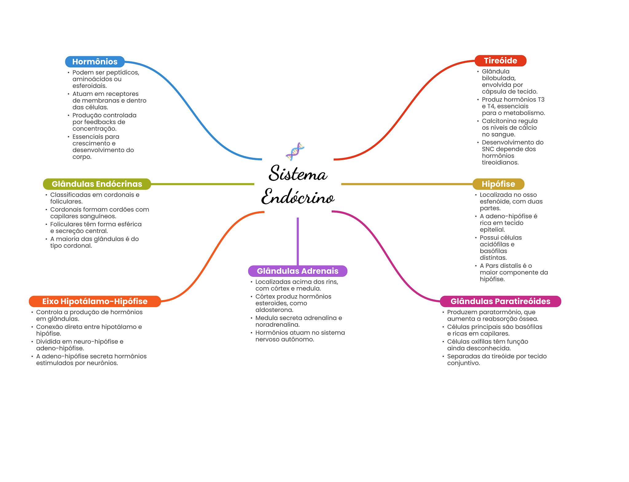 Hormônios Tireóide Podem ser peptídicos, Glândula aminoácidos ou bilobulada, esferoidais. envolvida por Atuam em receptores cápsula de tecido. de membranas e dentro Produz hormônios das células. e essenciais Produção controlada para metabolismo. por feedbacks de Calcitonina regula concentração. níveis de cálcio Essenciais para no sangue. crescimento e Desenvolvimento do desenvolvimento do SNC depende dos corpo. hormônios tireoidianos. Sistema Glândulas Endócrinas Hipófise Classificadas em cordonais e Endócrino Localizada no foliculares. esfenóide, com duas Cordonais formam cordões com partes. capilares sanguíneos. A adeno-hipófise é Foliculares têm forma esférica rica em tecido e secreção central. epitelial. A maioria das glândulas é do Possui células tipo cordonal. acidófilas e basófilas distintas. A Pars distalis é Glândulas Adrenais maior componente da Localizadas acima dos rins, hipófise. com córtex e medula. Córtex produz hormônios Eixo Hipotálamo-Hipófise esteroides, como Glândulas Paratireóides Controla a produção de hormônios aldosterona. Produzem paratormônio, que em glândulas. Medula secreta adrenalina e aumenta a reabsorção óssea. Conexão direta entre hipotálamo e noradrenalina. Células principais são basófilas hipófise. Hormônios atuam no sistema e ricas em capilares. Dividida em neuro-hipófise e nervoso autônomo. Células oxífilas têm função adeno-hipófise. ainda desconhecida. A adeno-hipófise secreta hormônios Separadas da tireóide por tecido estimulados por neurônios. conjuntivo.