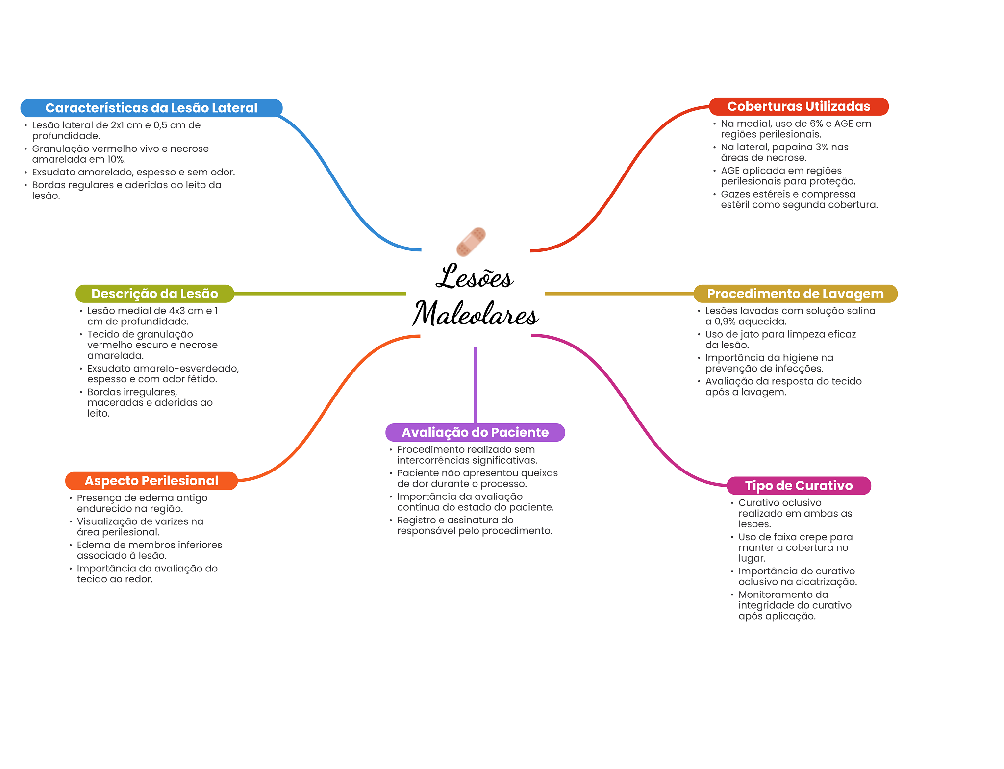 Características da Lesão Lateral Coberturas Utilizadas Lesão lateral de 2x1 cm e 0,5 cm de Na medial, uso de 6% e AGE em profundidade. regiões perilesionais. Granulação vermelho vivo e necrose Na lateral, papaina 3% nas amarelada em 10%. áreas de necrose. Exsudato amarelado, espesso e sem odor. AGE aplicada em regiões Bordas regulares e aderidas ao leito da perilesionais para proteção. lesão. Gazes estéreis e compressa estéril como segunda cobertura. Lesões Descrição da Lesão Procedimento de Lavagem Lesão medial de 4x3 cm e 1 Maleolares Lesões lavadas com solução salina cm de profundidade. a 0,9% aquecida. Tecido de granulação Uso de jato para limpeza eficaz vermelho escuro e necrose da lesão. amarelada. Importância da higiene na Exsudato amarelo-esverdeado, prevenção de infecções. espesso e com odor fétido. Avaliação da resposta do tecido Bordas irregulares, após a lavagem. maceradas e aderidas ao leito. Avaliação do Paciente Procedimento realizado sem intercorrências significativas. Paciente não apresentou queixas Aspecto Perilesional de dor durante processo. Tipo de Curativo Presença de edema antigo Importância da avaliação Curativo oclusivo endurecido na região. contínua do estado do paciente. realizado em ambas as Visualização de varizes na Registro e assinatura do lesões. área perilesional. responsável pelo procedimento. Uso de faixa crepe para Edema de membros inferiores manter a cobertura no associado à lesão. lugar. Importância da avaliação do Importância do curativo tecido ao redor. oclusivo na cicatrização. Monitoramento da integridade do curativo após aplicação.