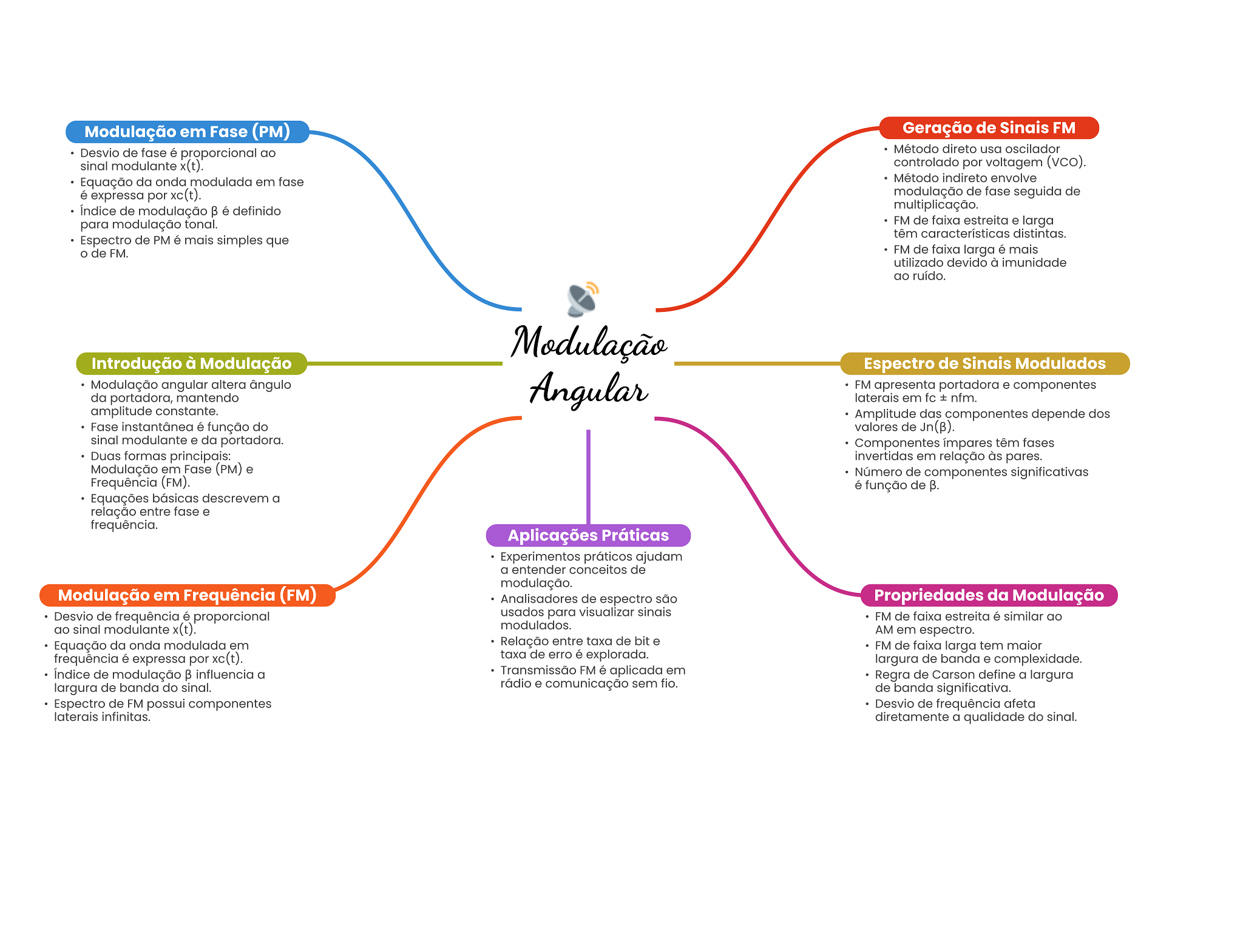 Modulação em Fase Geração de Sinais FM Desvio de fase é proporcional ao Método direto usa oscilador sinal modulante x(t). controlado por voltagem (vco). Equação da onda modulada em fase Método indireto envolve é expressa por xc(t). modulação de fase seguida de Indice de modulação é definido multiplicação. para modulação tonal. FM de faixa estreita e larga têm características distintas. Espectro de PM é mais simples que de FM. FM de faixa larga é mais utilizado devido à imunidade ao ruído. Modulação Introdução à Modulação Espectro de Sinais Modulados Modulação angular altera ângulo da portadora, mantendo Angular FM apresenta portadora e componentes laterais em fc nfm. amplitude constante. Amplitude das componentes depende dos Fase instantânea é função do valores de sinal modulante e da portadora. Componentes têm fases Duas formas principais: invertidas em relação às pares. Modulação em Fase (PM) e Número de componentes significativas Frequência (FM). é função de Equações básicas descrevem a relação entre fase e frequência. Aplicações Práticas Experimentos práticos ajudam a entender conceitos de modulação. Modulação em Frequência (FM) Analisadores de espectro são Propriedades da Modulação Desvio de frequência é proporcional usados para visualizar sinais FM de faixa estreita é similar ao ao sinal modulante x(t). modulados. AM em espectro. Equação da onda modulada em Relação entre taxa de bit e FM de faixa larga tem maior frequência é expressa por xc(t). taxa de erro é explorada. largura de banda e complexidade. Indice de modulação influencia a Transmissão FM é aplicada em Regra de Carson define a largura largura de banda do sinal. rádio e comunicação sem fio. de banda significativa. Espectro de FM possui componentes Desvio de frequência afeta laterais infinitas. diretamente a qualidade do sinal.