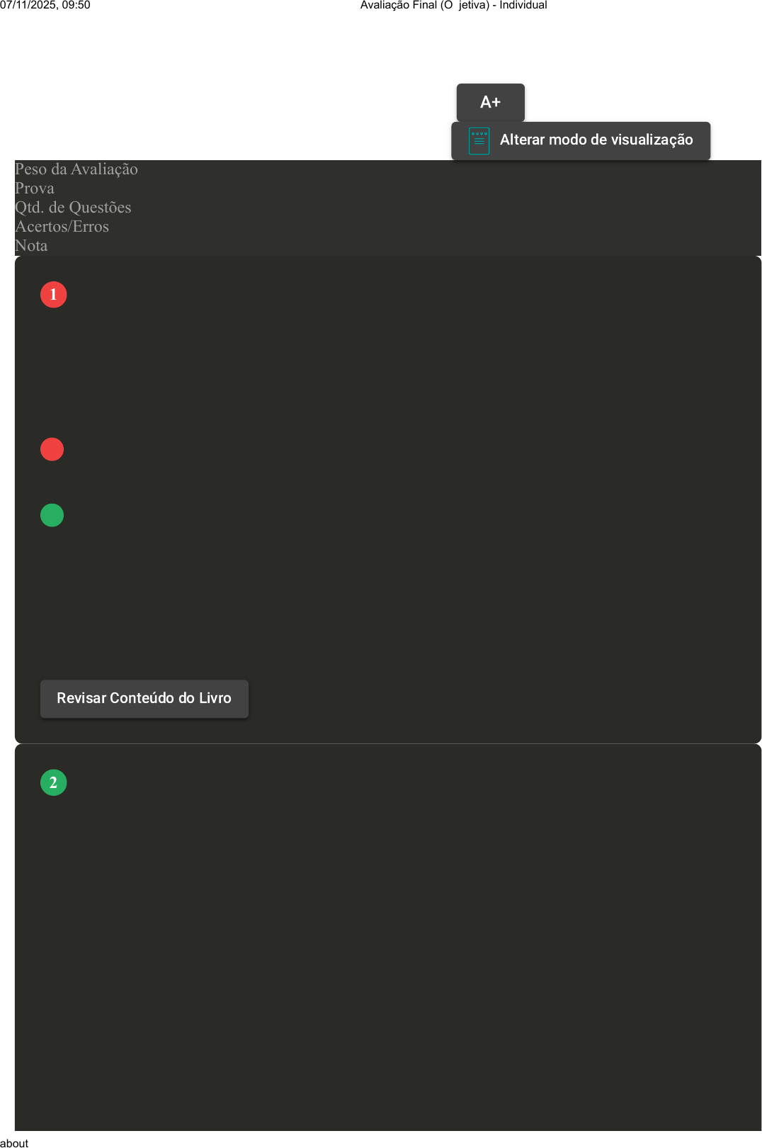 Prova Impressa GABARITO | Avaliação Final (Objetiva) - Individual (Cod.:1526190) Peso da Avaliação 4,00 Prova 103701412 Qtd. de Questões 10 Acertos/Erros 7/3 Nota 7,00 Tem como significado conviver à mesa e envolve além do padrão alimentar (o que se come) também como se come. Com base nessa definição, assinale a alternativa CORRETA: A Cultura. B Comensalidade. C Comida. D Alimentação. Uma abordagem aplicada na Prática Baseada em Evidências, para prevenção de vieses, é a denominada “PICO”. Com base na estrutura dessa abordagem, associe os itens, utilizando o código a seguir: I- Intervenção (I). II- Outcome (desfecho) (O). VOLTAR A+ Alterar modo de visualização 1 Revisar Conteúdo do Livro 2 07/11/2025, 09:50 Avaliação Final (Objetiva) - Individual about:blank 1/9 III- Paciente ou população (P). IV- Comparação (C). ( ) É o resultado de interesse para o profissional e para o paciente. Por exemplo: sobrevivência, sintomas, qualidade de vida, efeitos colaterais. ( ) Tratamento, etiologia ou teste de diagnóstico que se tem interesse em aplicar para o paciente ou população. ( ) Características do grupo populacional ou do paciente para o qual se deseja uma informação. ( ) É a intervenção contra qual a intervenção será confrontada. Assinale a alternativa que apresenta a sequência CORRETA: A II - I - III - IV. B IV - I - II - III. C II - III - IV - I. D III - II - I - IV. Os padrões alimentares, como elementos intrínsecos da rotina diária, manifestam escolhas, tradições e influências culturais. Essas práticas exercem um impacto relevante na saúde e bem-estar dos indivíduos. Investigar os hábitos alimentares oferece uma compreensão mais aprofundada das interconexões entre alimentação, cultura e saúde. Sobre os hábitos alimentares, classifique V para as afirmativas verdadeiras e F para as falsas: ( ) Os padrões alimentares são inteiramente fixos, sendo determinados exclusivamente por fatores genéticos e biológicos. 3 07/11/2025, 09:50 Avaliação Final (Objetiva) - Individual about:blank 2/9 ( ) A cultura tem uma influência mínima na formação dos hábitos alimentares, os quais são predominantemente moldados por fatores individuais. ( ) Os padrões alimentares desenvolvidos na infância têm pouca importância na vida adulta, visto que as preferências alimentares são completamente reconfiguradas ao longo do tempo. ( ) A presença do ambiente social e cultural desempenha um papel relevante na criação e perpetuação dos padrões alimentares ao longo da vida. Assinale a alternativa que apresenta a sequência CORRETA: A V - V - V - F. B F - F - F - V. C F - F - V - V. D V - V - F - F. Ao analisar criticamente um artigo científico, é fundamental identificar aspectos que podem comprometer a qualidade e validade da pesquisa. Com base nesse contexto, analise as sentenças a seguir: Ao analisar criticamente um artigo científico, é fundamental identificar aspectos que podem comprometer a qualidade e validade da pesquisa. Com base nesse contexto, analise as sentenças a seguir: I- Para garantir a eficácia do cuidado em saúde baseado na Saúde Baseada em Evidências (SBE), é essencial realizar uma leitura crítica e sistemática, que identifique elementos que indicam a qualidade e confiabilidade das informações. II- A omissão de um aspecto científico importante no artigo pode ser interpretada como uma estratégia intencional para se obter o resultado esperado. III- A testagem da hipótese do autor representa uma limitação significativa do estudo, comprometendo a validade dos resultados e a interpretação das conclusões. Por isso, não se deve testar a hipótese 4 07/11/2025, 09:50 Avaliação Final (Objetiva) - Individual about:blank 3/9 antes e ir diretamente para a execução do estudo. IV- Dificuldades práticas, como o recrutamento da amostra, que resultaram em mudança do protocolo original, podem ser vistas como desafios inerentes à pesquisa. Assinale a alternativa que apresenta a sequência CORRETA: A As sentenças I e II estão corretas. B As sentenças II e IV estão corretas. C As sentenças I, II e III estão corretas. D A sentença I está correta. As áreas da ciência que estudam o comportamento humano são a Psicologia, as Ciências Sociais, a Sociologia e a Antropologia. Com base no objetivo da Nutrição Comportamental, assinale a alternativa CORRETA: A Na nutrição comportamental, objetiva-se a adequação de peso, consumo e comportamentos. B Tem intuito de estabelecer condutas rigorosas e adequadas para mudança de comportamento e adequação da ingestão alimentar. C Objetiva compreender os motivos dos comportamentos inadequados e instituir procedimentos para correção das compulsões e transtornos alimentares. D Busca problematizar a forma de intervenção tradicional do nutricionista a fim de incluir aspectos fisiológicos, sociais e emocionais da alimentação e mudar a forma de relacionamento e a comunicação com o paciente e a mídia. Revisar Conteúdo do Livro 5 Revisar Conteúdo do Livro 07/11/2025, 09:50 Avaliação Final (Objetiva) - Individual about:blank 4/9 Os eventos epigenômicos causados pelos alimentos e sua associação com o câncer são extensivamente estudados. De acordo com os nutrientes e suas possíveis ações epigenéticas protetivas no câncer, associe os itens, utilizando o código a seguir: I- Vitamina B12. II- Betaína. III- Genisteína. IV- Resveratrol. ( ) Quebra subprodutos tóxicos produzidos pela síntese de S-adenosilmetionina (SAM). ( ) Aumento da metilação. ( ) Síntese de metionina. ( ) Remove grupos acetil das histonas. Assinale a alternativa que apresenta a sequência CORRETA: A II - IV - III - I. B IV - II - III - I. C II - III - I - IV. 6 07/11/2025, 09:50 Avaliação Final (Objetiva) - Individual about:blank 5/9 D III - II - I - IV. O cuidado em saúde deve ser pautado em evidências científicas e afastado das doutrinas dogmáticas. Com base na anális