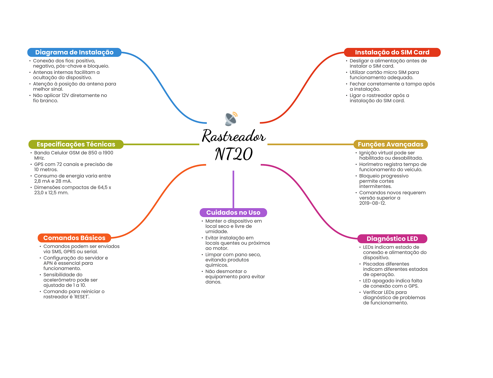 Diagrama de Instalação Instalação do SIM Card Conexão dos fios: positivo, Desligar a alimentação antes de negativo, pós-chave e bloqueio. instalar SIM card. Antenas internas facilitam a Utilizar cartão micro SIM para ocultação do dispositivo. funcionamento adequado. Atenção à posição da antena para Fechar corretamente a tampa após melhor sinal. a instalação. Não aplicar 12V diretamente no Ligar rastreador após a fio branco. instalação do SIM card. Rastreador Especificações Técnicas Funções Avançadas Banda Celular GSM de 850 a 1900 MHz. NT20 Ignição virtual pode ser habilitada ou desabilitada. GPS com 72 canais e precisão de Horímetro registra tempo de 10 metros. funcionamento do veículo. Consumo de energia varia entre Bloqueio progressivo 2,8 mA e 28 mA. permite cortes Dimensões compactas de 64,5 X intermitentes. 23,0 X 12,5 mm. Comandos novos requerem versão superior a 2019-08-12. Cuidados no Uso Manter O dispositivo em local seco e livre de umidade. Comandos Básicos Evitar instalação em Diagnóstico LED locais quentes ou próximos Comandos podem ser enviados ao motor. LEDs indicam estado de via SMS, GPRS ou serial. Limpar com pano seco, conexão e alimentação do Configuração do servidor e evitando produtos dispositivo. APN é essencial para químicos. Piscadas diferentes funcionamento. Não desmontar indicam diferentes estados Sensibilidade do equipamento para evitar de operação. acelerômetro pode ser danos. LED apagado indica falta ajustada de 1 a 10. de conexão com GPS. Comando para reiniciar Verificar LEDs para rastreador é 'RESET'. diagnóstico de problemas de funcionamento.