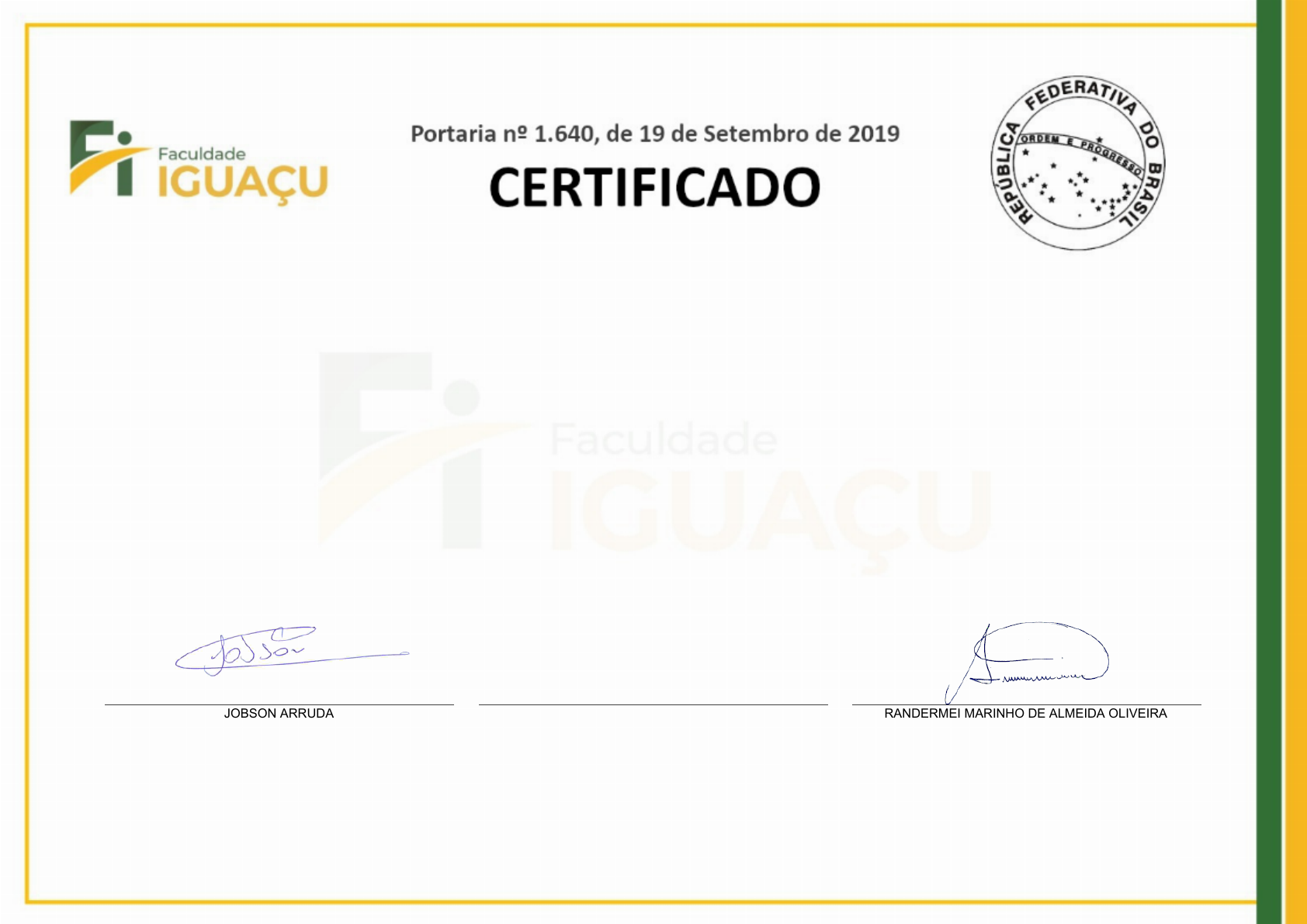 O Diretor da Faculdade Iguaçu, no uso de suas atribuições, confere o título de Especialista a Luisa Teresa da Rocha Rodrigues de nacionalidade brasileira, natural de PICOS/PI, portador (a) do CPF 001.771.553-96, tendo em vista a conclusão do Curso de Pós-Graduação Lato Sensu em PSICOPEDAGOGIA integralizado no período de 17 de junho de 2025 a 15 de outubro de 2025, em conformidade com as disposições previstas na Resolução CNE/ CES nº 1, de 06/04/2018, outorgando-lhe o presente CERTIFICADO, para que possa gozar de todos os direitos e prerrogativas legais. Capanema/PR, 15 de outubro de 2025 JOBSON ARRUDA Diretor geral LUISA TERESA DA ROCHA RODRIGUES Especialista RANDERMEI MARINHO DE ALMEIDA OLIVEIRA Secretário HISTÓRICO ESCOLAR DE CURSO DE PÓS-GRADUAÇÃO LATO SENSU FACULDADE IGUAÇU Credenciada pela portaria número 1.640 do MEC, de 19/09/2019 REGISTRO Certificado registrado em conformidade com a resolução CNE/CES nº1, de 06/04/2018, publicada no DOU em 09/04/2018. Registro nº 49251, folha nº 93, livro nº 5/IGU. CAPANEMA/PR, 15 de outubro de 2025 RANDERMEI MARINHO DE ALMEIDA OLIVEIRA Secretário AUTENTICIDADE EVCODE: bdf37fdd-9913-40cf-99b9-f229992683f8 Curso PSICOPEDAGOGIA Área de conhecimento EDUCAÇÃO Carga horária total 570 H/A Período de realização 17-06-2025 a 15-10-2025 Aluno(a) LUISA TERESA DA ROCHA RODRIGUES CPF 001.771.553-96 DISCIPLINA CH (H/A) FREQ NOTA PROFESSOR TITULAÇÃO ÉTICA GERAL E PROFISSIONAL 40 100% 100 SILVIA CRISTINA DA SILVA MESTRA METODOLOGIA CIENTÍFICA 40 100% 100 MARCELA FARIA DE ALMEIDA MESTRA DIREITOS HUMANOS 40 100% 100 RAMON OLÍMPIO DE OLIVEIRA DOUTOR LÍNGUA BRASILEIRA DE SINAIS – LIBRAS 40 100% 100 ALINE PEDRO FEZA ESPECIALISTA INOVAÇÕES TECNOLÓGICAS 40 100% 90 TIAGO RIBEIRO DE ARAÚJO DOUTOR APRENDIZAGEM E COMPORTAMENTO 40 100% 90 CRISTINA SPENGLER AZAMBUJA MESTRE DESENVOLVIMENTO COGNITIVO 40 100% 80 HÉLLIDA ALCÂNTARA ARAÚJO MESTRA FUNDAMENTOS HISTÓRICOS, CONCEITUAIS E ÁREAS DE ATUAÇÃO DO PROFISSIONAL 40 100% 100 MYLLENA SILVA DE FREITAS MORAIS ESPECIALISTA DIFICULDADE DE APRENDIZAGEM-REEDUCAÇÃO NO TRABALHO 40 100% 100 JOANA ÁUREA CORDEIRO BARBOSA DOUTORA INTERVENÇÕES PSICOPEDAGÓGICAS E NECESSIDADES ESPECIAS 40 100% 100 ÉDERSON DA CRUZ DOUTOR CONTRIBUIÇÃO DA PSICANÁLISE PARA PSICOPEDAGOGIA E PSICOMOTROCIDADE 40 100% 70 JOANA ÁUREA CORDEIRO BARBOSA DOUTORA PSICOPEDAGOGIA INSTITUCIONAL 40 100% 80 DANIEL BUSSINGER DE SOUZA PENNA DOUTOR NOÇÕES DE PSICOLOGIA CLÍNICA 40 100% 100 DANIEL BUSSINGER DE SOUZA PENNA DOUTOR DOCÊNCIA DO ENSINO SUPERIOR 50 100% 100 MARIA LUIZA PEREIRA LEITE DOUTORA Observações: Média mínima para aprovação: 70.00; frequência mínima para aprovação: 75%. TRABALHO DE CONCLUSÃO DE CURSO TÍTULO: "A IMPORTÂNCIA DO PSICOPEDAGOGO NO AMBIENTE ESCOLAR" NOTA: 90