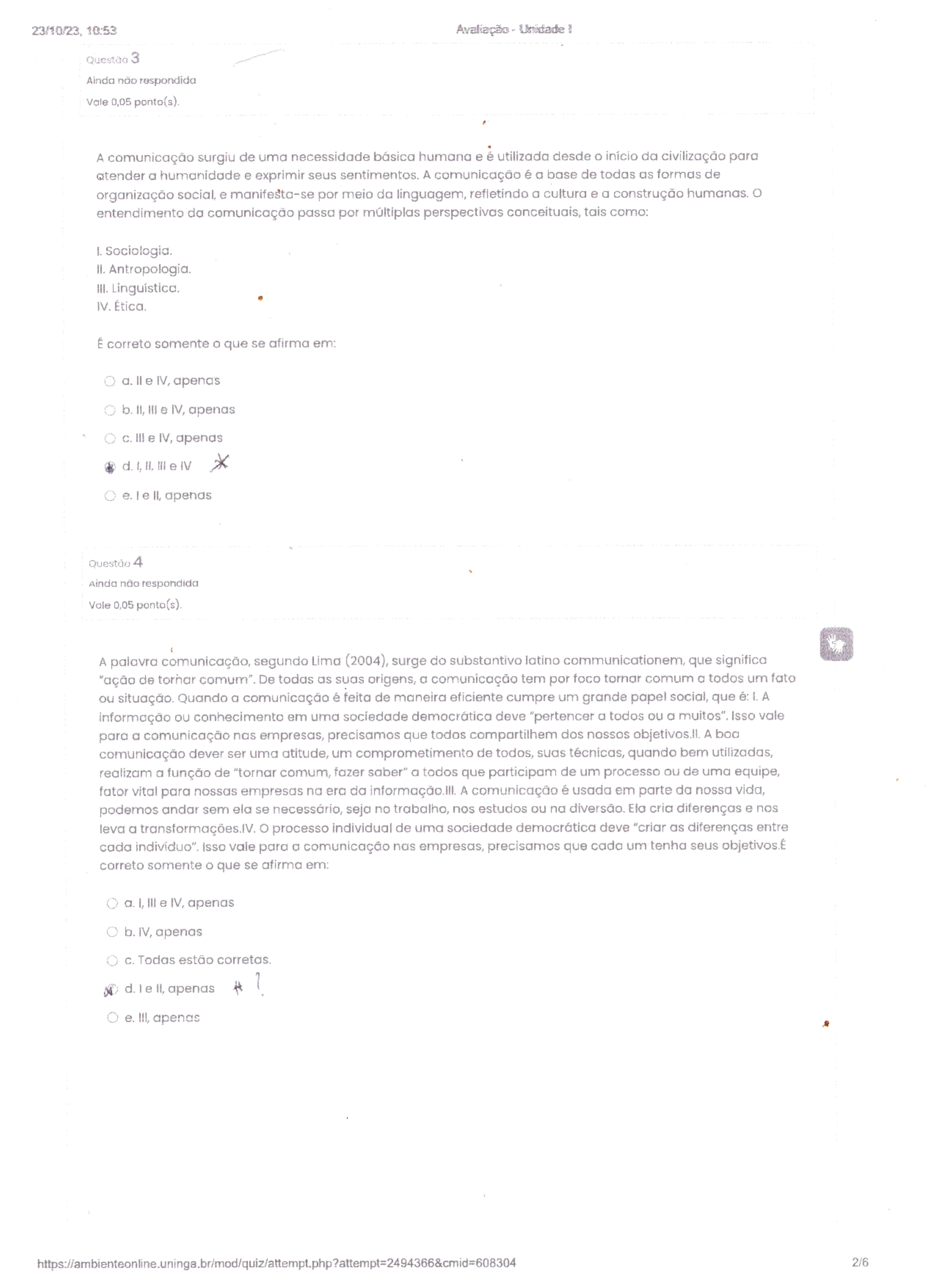 23/10/23, 10:53 Avaliação Unidade Questão 3 Ainda não respondida Vale 0,05 ponto(s) A comunicação surgiu de uma necessidade básica humana e é utilizada desde o início da civilização para a humanidade e exprimir seus sentimentos. A comunicação é a base de todas as formas de organização social, e manifesta-se por meio da linguagem, refletindo a cultura e a construção humanas. entendimento da comunicação passa por múltiplas perspectivas tais como: Sociologia. II. Antropologia. III. IV. Ética. É correto somente o que se afirma em: a. II e IV, apenas b. II, III e IV, apenas C. III e IV, apenas d. I, II. III e IV e. le II, 4 Ainda não respondida Vale 0,05 ponto(s). A palavra comunicação, segundo Lima (2004), surge do substantivo latino communicationem, que significa "ação de torhar comum". De todas as suas origens, a comunicação tem por foco tornar comum a todos um fato ou situação. Quando a comunicação é feita de maneira eficiente cumpre um grande papel social, que é: A informação ou conhecimento em uma sociedade democrática deve "pertencer a todos ou a muitos". Isso vale para a comunicação nas empresas, precisamos que todos compartilhem dos nossos A boa comunicação dever ser uma atitude, um comprometimento de todos, técnicas, quando bem utilizadas, realizam a função de "tornar comum, fazer saber" a todos que participam de um processo ou de uma equipe, fator vital para nossas empresas na era da A comunicação é usada em parte da nossa vida, podemos andar sem ela se necessário, seja no trabalho, nos estudos ou na diversão. Ela cria diferenças e nos leva a transformações.IV. processo individual de uma sociedade democrática deve "criar as diferenças entre cada Isso vale para a comunicação nas empresas, precisamos que cada um tenha seus correto somente que se afirma em: a. I, III e IV, apenas b. IV, apenas C. Todas estão corretas. d. e II, apenas e. III, apenas 2/6