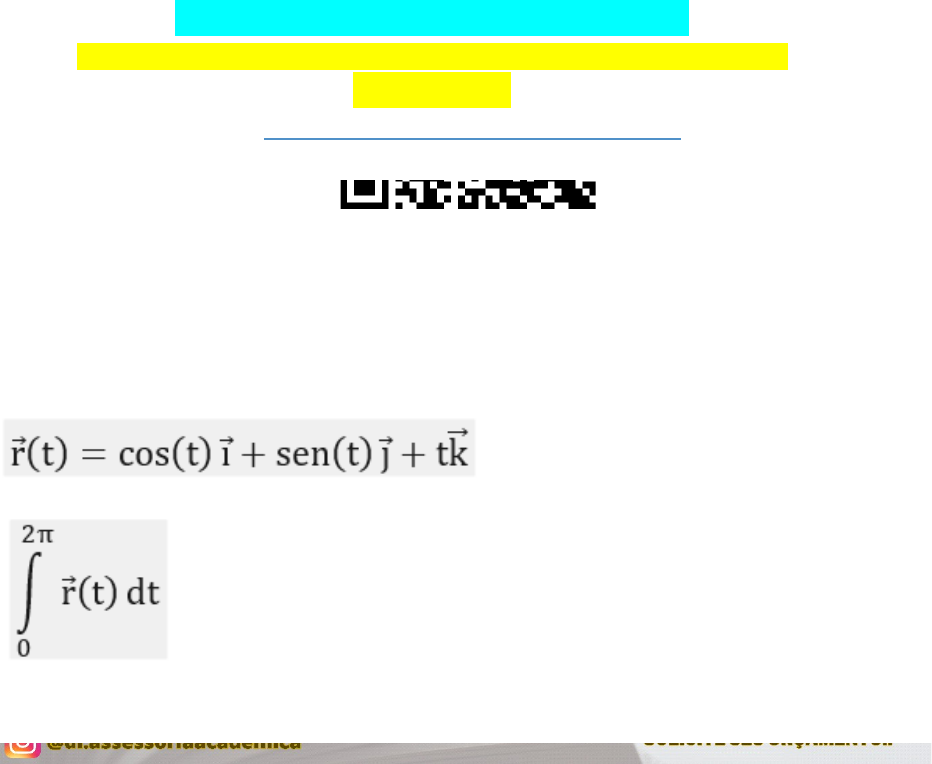 MAPA - CÁLCULO II - 54_2025 Assessoria nos seus TRABALHOS entre em contato com a DL ASSESSORIA E-mail: assessoriaacademicadl@gmail.com · (15) 99143-3322 QUESTÃO 1 Uma função vetorial é uma função que atribui a cada número real um vetor em um espaço vetorial. Geralmente, uma ela é representada como uma combinação linear das funções coordenadas, em que cada uma das quais é uma função escalar do parâmetro. Essas funções são extremamente úteis na física e na engenharia, pois podem descrever trajetórias, velocidades e forças em espaços tridimensionais. Fonte: elaborado pelo professor, 2025. Considere que r(t), definida a seguir, é a posição de uma partícula no plano xy no instante t. Nessa situação, considere que você esteja acompanhando um estudo sobre função vetorial e seu coordenador pediu para você calcular os seguintes intens: A) encontre o vetor velocidade e o módulo desse vetor, quando t = 0. B) encontre o vetor aceleração e o módulo desse vetor, quando t = 0. C) encontre o comprimento da trajetória dessa partícula entre t = 0 e t = 2π, ou seja, determine o valor de Com base nessa situação, resolva esses itens como sua atividade MAPA. 7 image0.wmf image1.wmf image2.wmf image3.wmf