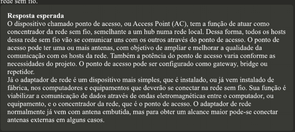 sem no. Resposta esperada dispositivo chamado ponto de acesso, ou Access Point (AC), tem a função de atuar como concentrador da rede sem fio, semelhante a um hub numa rede local. Dessa forma, todos os hosts dessa rede sem fio vão se comunicar uns com os outros através do ponto de acesso. ponto de acesso pode ter uma ou mais antenas, com objetivo de ampliar e melhorar a qualidade da comunicação com os hosts da rede. Também a potência do ponto de acesso varia conforme as necessidades do projeto. ponto de acesso pode ser configurado como gateway, bridge ou repetidor. Já o adaptador de rede é um dispositivo mais simples, que é instalado, ou já vem instalado de fábrica, nos computadores e equipamentos que deverão se conectar na rede sem fio. Sua função é viabilizar a comunicação de dados através de ondas eletromagnéticas entre o computador, ou equipamento, e concentrador da rede, que é o ponto de acesso. adaptador de rede normalmente já vem com antena embutida, mas para obter um alcance maior pode-se conectar antenas externas em alguns casos.