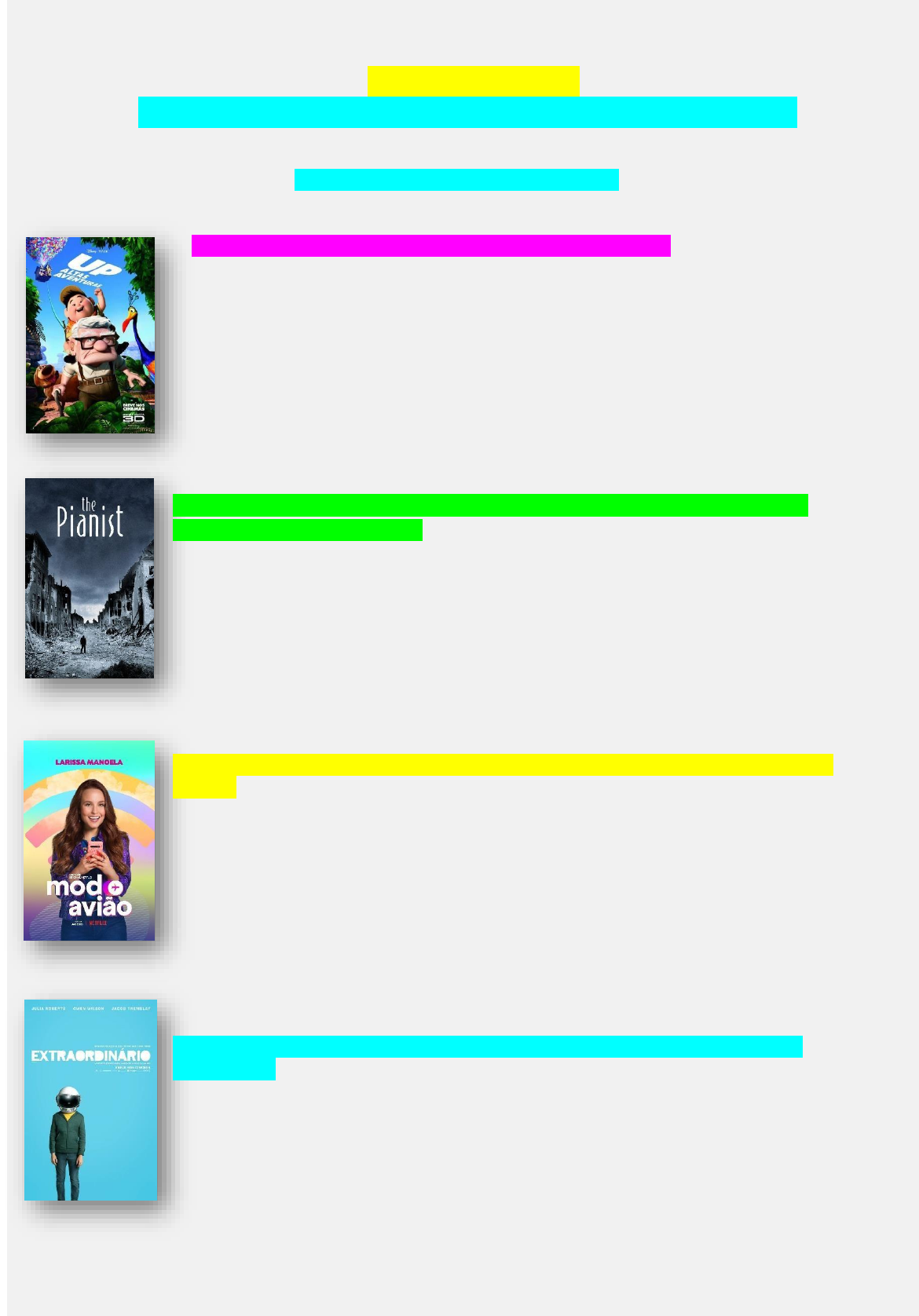 7 INTRODUÇÕES COMO USAR FILMES E SÉRIES NA REDAÇÃO DO ENEM PROFESSORA: CÍNTIA CARDOSO ♥ TEMA 1 – O problema da desvalorização do idoso No filme “Up, altas aventuras”, o protagonista Carl é um idoso que vive sozinho e isolado, rodeado por pessoas que almejam enviá-lo a um asilo. Embora seja uma obra ficcional, o longa-metragem retrata características que se assemelham à atual conjuntura, pois, assim como na obra, a figura do idoso se encontra marginalizada, o que se mostra grave problema. Assim, os desafios a serem superados passam não só pela indiferença social, mas também pela omissão do Estado. TEMA 2 – A importância da participação social e do direito ao voto em questão no Brasil A dramática produção ficcional "O Pianista" narra o drama de uma nação tomada pelo Nazismo e ilustra como um governo opressivo pode prejudicar a coletividade. Com efeito, para que os brasileiros não protagonizem a história d"O Pianista", há de se desenvolver responsabilidade por meio da participação social e do voto, sob pena de prejuízos irreparáveis aos cidadãos. TEMA 3 – O problema da superexposição nas redes sociais entre os jovens A produção ficcional “Modo Avião”, embora seja uma comédia, faz uma crítica a um dos mais graves comportamentos entre os jovens: o uso excessivo das redes sociais. Com efeito, o filme reproduz o comportamento de Ana, protagonista adolescente que consome internet de forma exagerada, tal como ocorre com diversas “anas”, fora da ficção. Assim, há de ser desestimular a ansiedade vinculada à “web”, bem como intensificar o autocuidado entre os usuários. TEMA 4 – A importância de se combater o “bullying” nas escolas brasileiras O filme norte-americano “Extraordinário”, embora seja uma produção ficcional, tece uma crítica a um dos mais graves comportamentos presentes nas escolas brasileiras: o “bullying”. Com efeito, essa prática se mostra grave problema na realidade dos alunos, de sorte que, para mitigar essa forma de assédio, a omissão do Estado e a cultura de hostilidade devem ser combatidas. TEMA 5 - Crianças abandonadas: a importância de solucionar esse problema no Brasil A produção ficcional “Desventuras em Série” narra o drama de Violet, Sunny e Klaus: crianças que perderam seus pais e vivem os obstáculos na busca por um lar. Entretanto, milhares de órfãos fora da ficção enfrentam a cruel realidade do abandono em abrigos e lares de acolhimento. Com efeito, para mitigar o problema, há de se combater não só o preconceito em torno da adoção, mas também a burocracia dos processos, sob pena de prejuízo para a infância e para a adolescência. TEMA 6 - O papel dos jovens na resolução dos problemas sociais Eleven – personagem da produção ficcional “Stranger Things” – é uma jovem dotada de superpoderes e que não mede esforços para salvar não só seus amigos, mas também toda a sociedade. Ocorre que fora da ficção não é comum que atitudes como as da protagonista da série sejam reproduzidas na juventude. Nesse sentido, o altruísmo e a ousadia de Eleven deveriam ser a realidade entre os jovens contemporâneos. TEMA 7 – O desaparecimento de crianças no Brasil A produção infantil “Procurando Nemo”, embora seja uma animação lúdica, ilustra um sério problema presente entre os indivíduos fora da ficção: o desaparecimento de pessoas. Com efeito, a situação se torna ainda mais cruel quando as crianças protagonizam a triste história de Nemo. Nesse viés, para que os sumiços não sejam uma regra, há de se desconstruir a omissão estatal, bem como a indiferença da sociedade. PROFESSORA: CÍNTIA CARDOSO ♥