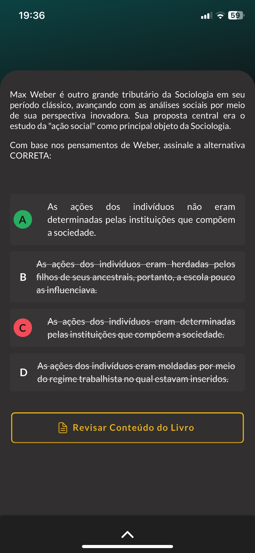 19:36 59 Max Weber é outro grande tributário da Sociologia em seu período clássico, avançando com as análises sociais por meio de sua perspectiva inovadora. Sua proposta central era o estudo da "ação social" como principal objeto da Sociologia. Com base nos pensamentos de Weber, assinale a alternativa CORRETA: As ações dos indivíduos não eram A determinadas pelas instituições que compõem a sociedade. As ações dos indivíduos eram herdadas pelos filhos de seus ancestrais, portanto, a escola pouco as influenciava. As ações dos indivíduos eram determinadas pelas instituições que compõem a sociedade. As ações dos indivíduos eram moldadas por meio D do regime trabalhista no qual estavam inseridos. Revisar Conteúdo do Livro