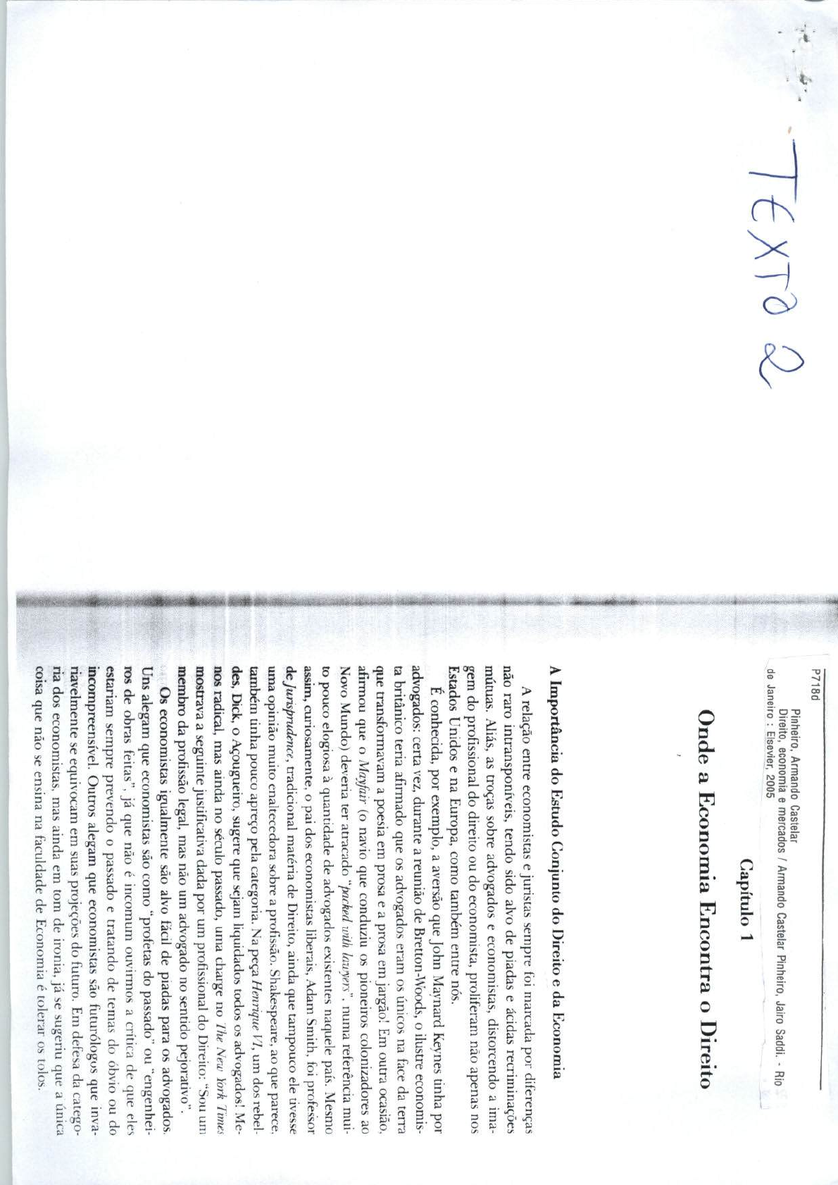 P718d Pinheiro, Armando Castelar TEXTO 2 Direito, economia e mercados / Armando Castelar Pinheiro, Jairo Saddi. Rio de Janeiro Elsevier, 2005 Capítulo 1 Onde a Economia Encontra Direito A Importância do Estudo Conjunto do Direito e da Economia A relação entre economistas e juristas sempre foi marcada por diferenças não raro intransponíveis, tendo sido alvo de piadas e ácidas recriminações mútuas. Aliás, as troças sobre advogados e economistas, distorcendo a ima- gem do profissional do direito ou do economista, proliferam não apenas nos Estados Unidos e na Europa, como também entre nós. É conhecida, por exemplo, a aversão que John Maynard Keynes tinha por advogados: certa vez, durante a reunião de Bretton-Woods, ilustre economis- ta britânico teria afirmado que os advogados eram os únicos na face da terra que transformavam a poesia em prosa e a prosa em jargão! Em outra ocasião, afirmou que o Mayfair (o navio que conduziu pioneiros colonizadores ao Novo Mundo) deveria ter atracado "packed with numa referência mui- to pouco elogiosa à quantidade de advogados existentes naquele país. Mesmo assim, pai dos economistas liberais, Adam Smith, foi professor de Jurisprudence, tradicional matéria de Direito, ainda que tampouco ele tivesse uma opinião muito enaltecedora sobre a profissão. Shakespeare, ao que também tinha pouco apreço pela categoria. Na peça Henrique VI, um dos rebel- des, Dick, o Açougueiro, sugere que sejam liquidados todos os advogados! Me- nos radical, mas ainda no século passado, uma charge no The New York Times mostrava a seguinte justificativa dada por um profissional do Direito: "Sou um membro da profissão legal, mas não um advogado no sentido Os economistas igualmente são alvo fácil de piadas para advogados. Uns alegam que economistas são como "profetas do passado" ou "engenhei- ros de obras feitas", já que não é incomum ouvirmos a crítica de que eles estariam sempre prevendo passado e tratando de temas do óbvio ou do incompreensível. Outros alegam que economistas são futurólogos que inva- riavelmente se equivocam em suas projeções do futuro. Em defesa da catego- ria dos economistas, mas ainda em tom de ironia, já se sugeriu que a única coisa que não se ensina na faculdade de Economia é tolerar tolos.Direito, Economia Mercados ELSEVIER Capítulo 1: Onde a Economia Encontra Direito 5 ELSEVIER Todos conhecemos outras piadas com evidente sentido de diversão; no do sistema judicial é aplicar direito, ele só está preparado para decidir entre entanto, conflito entre as duas profissões é sério e merece reflexão. É certo legal e o ilegal. Evidentemente, sistema judicial não pode ser insensível ao que ocorre no sistema econômico. Mas só pode traduzir essa sensibilidade nos limi- que, na opinião dos juristas, foram os economistas (e, na opinião dos econo- tes de sua capacidade operativa. Quando acionado, máximo que pode fazer é mistas, juristas) que alargaram as divisões e diferenças entre as duas profis- julgar se decisões econômicas são legalmente válidas. Se for além disso, a Justiça sões. George Stigler faz um alerta sobre a dificuldade de comunicação que exorbitará, justificando retaliações que ameaçam sua autonomia. Como os juízes existe entre as duas disciplinas: poderão preservá-la, se abandonarem limites da ordem jurídica? Por isso, "Enquanto a eficiência se constitui no problema fundamental dos a quando os tribunais incorporam elementos estranhos ao direito, eles rompem justiça é o tema que norteia os professores de Direito (...) é profunda a diferença sua lógica operativa e comprometem os marcos legais para funcionamento da entre uma disciplina que procura explicar a vida econômica (e, de fato, toda a ação própria racional) e outra que pretende alcançar a justiça como elemento regulador de todos Além disso, não se pode ignorar que os sistemas jurídico e econômico estão os aspectos da conduta humana. Essa diferença significa, basicamente, que eco- umbilicalmente ligados ao sistema político. E nosso sistema político privile- nomista e o advogado vivem em mundos diferentes e falam diferentes giou a confusão reinante entre Direito e Economia. Por exemplo, até por consi- Mais recentemente, foram os planos de estabilização econômica que au- derar os nossos tribunais superiores não como Cortes da federação com a fun- mentaram ainda mais o fosso entre advogados e economistas. É corrente a ção de controlar sistema constitucional, mas como simples tribunais de justi- crítica aos economistas que trabalharam para governos que, nos seus dife- ça de terceira ou quarta instância às partes, sistema judicial brasileiro apre- rentes planos de estabilização da moeda e programas de desenvolvimento, senta uma disfunção intrínseca grave. Num sistema democrático, resolver (e sistematicamente desprezaram as liberdades públicas e os direitos reformar) tal estrutura de solução de conflitos é imperativo e urgente. É comum dizer, por exemplo, que os economistas do governo sempre geram Inspirado em preceitos do século XIX, nossos tribunais ainda tendem a emprego para pelo menos uma profissão a dos advogados! Estes, por outro entender e interpretar os conflitos de modo arcaico. De acordo com Wald, lado, são vistos por aqueles como interesseiros e desprovidos de espírito cívi- precisamos de uma economia de mercado inspirada com direito, e um direito quando buscam na Justiça forçar governo a realizar pagamentos total- que considere as regras do mercado, na exata medida em que, "se houver um mente fora do alcance das contas públicas, ou entulhando Judiciário com mercado sem direito, teremos uma selva selvagem. Se, ao contrário, tivermos disputas já pacificadas pelos tribunais superiores, prejudicando todo país um direito sem o funcionamento do mercado, haverá a paralisação do país, e em busca de gordos honorários. não haverá Além disso, segundo esse auto
