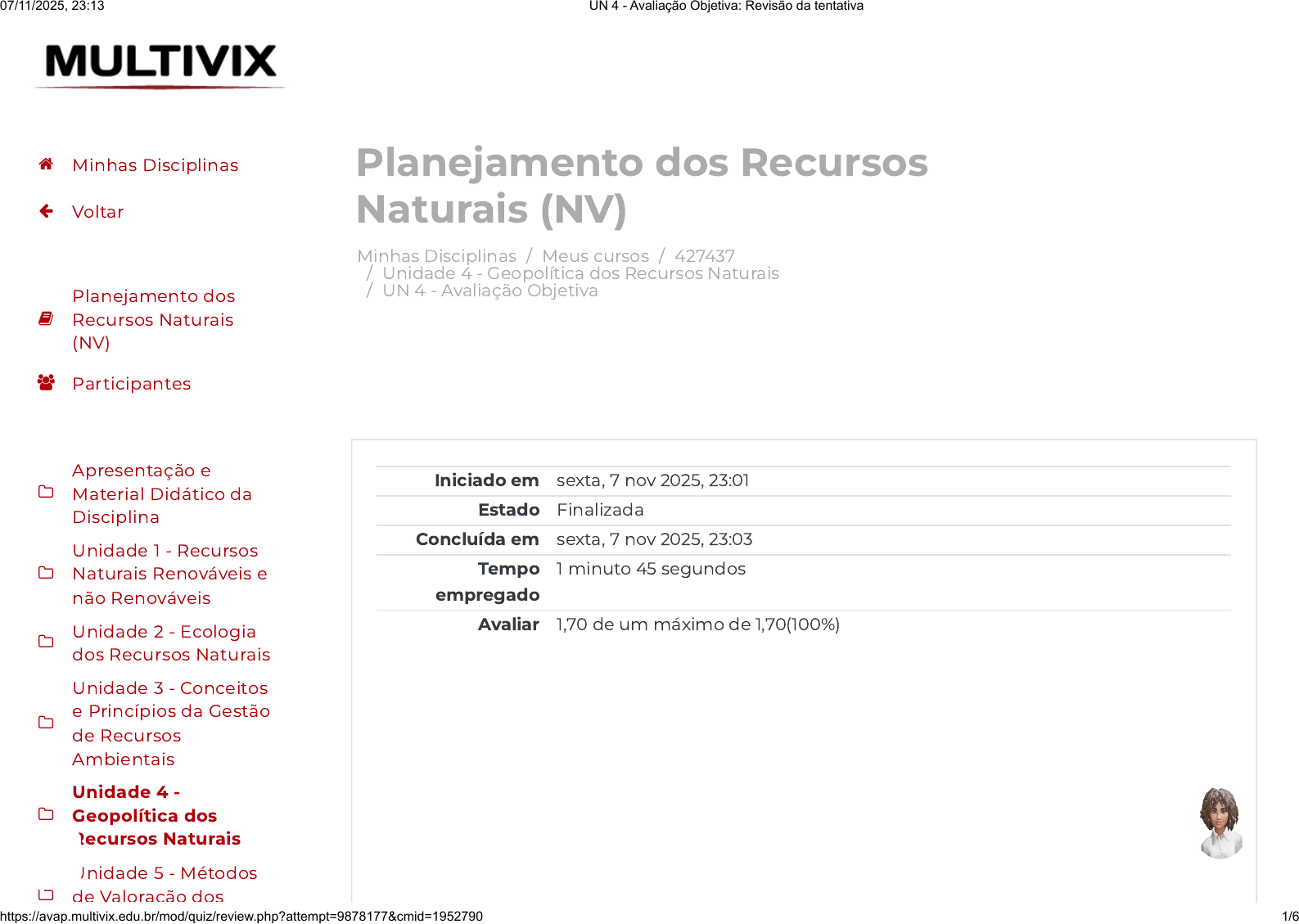 Minhas Disciplinas / Meus cursos / 427437 / Unidade 4 - Geopolítica dos Recursos Naturais / UN 4 - Avaliação Objetiva Planejamento dos Recursos Naturais (NV) Iniciado em sexta, 7 nov 2025, 23:01 Estado Finalizada Concluída em sexta, 7 nov 2025, 23:03 Tempo empregado 1 minuto 45 segundos Avaliar 1,70 de um máximo de 1,70(100%) Minhas Disciplinas Voltar Planejamento dos Recursos Naturais (NV) Participantes Apresentação e Material Didático da Disciplina Unidade 1 - Recursos Naturais Renováveis e não Renováveis Unidade 2 - Ecologia dos Recursos Naturais Unidade 3 - Conceitos e Princípios da Gestão de Recursos Ambientais Unidade 4 - Geopolítica dos Recursos Naturais Unidade 5 - Métodos de Valoração dos 07/11/2025, 23:13 UN 4 - Avaliação Objetiva: Revisão da tentativa https://avap.multivix.edu.br/mod/quiz/review.php?attempt=9878177&cmid=1952790 1/6 https://avap.multivix.edu.br/my/ https://avap.multivix.edu.br/course/view.php?id=35884 https://avap.multivix.edu.br/course/view.php?id=35884§ion=5 https://avap.multivix.edu.br/mod/quiz/view.php?id=1952790 https://avap.multivix.edu.br/my/ https://avap.multivix.edu.br/course/view.php?id=35884 https://avap.multivix.edu.br/user/index.php?id=35884 https://avap.multivix.edu.br/course/view.php?id=35884§ion=1 https://avap.multivix.edu.br/course/view.php?id=35884§ion=2 https://avap.multivix.edu.br/course/view.php?id=35884§ion=3 https://avap.multivix.edu.br/course/view.php?id=35884§ion=4 https://avap.multivix.edu.br/course/view.php?id=35884§ion=5 https://avap.multivix.edu.br/course/view.php?id=35884§ion=6 https://avap.multivix.edu.br/ https://avap.multivix.edu.br/ https://avap.multivix.edu.br/ https://avap.multivix.edu.br/ https://avap.multivix.edu.br/ https://avap.multivix.edu.br/ https://avap.multivix.edu.br/ Questão 1 Correto Atingiu 0,34 de 0,34 A escassez de água potável em algumas regiões tem provocado conflitos sociais e tensões entre nações. O uso descontrolado, a poluição e as mudanças climáticas contribuem para agravar esse quadro. Em certos contextos, a água é tratada como bem estratégico, influenciando acordos bilaterais e políticas de segurança nacional. Considerando esse cenário, qual medida é mais coerente com uma abordagem geopolítica preventiva em relação aos recursos hídricos? Escolha uma opção: a. Priorizar o uso da água para fins industriais em regiões desérticas. b. Reduzir o uso de tecnologias de monitoramento hídrico para diminuir gastos. c. Impor tarifas elevadas ao uso da água em regiões urbanas. d. Estimular o uso ilimitado da água como direito fundamental em qualquer contexto. e. Estabelecer políticas de cooperação internacional e gestão compartilhada de bacias hidrográficas transfronteiriças. Minhas Disciplinas Voltar Planejamento dos Recursos Naturais (NV) Participantes Apresentação e Material Didático da Disciplina Unidade 1 - Recursos Naturais Renováveis e não Renováveis Unidade 2 - Ecologia dos Recursos Naturais Unidade 3 - Conceitos e Princípios da Gestão de Recursos Ambientais Unidade 4 - Geopolítica dos Recursos Naturais Unidade 5 - Métodos de Valoração dos 07/11/2025, 23:13 UN 4 - Avaliação Objetiva: Revisão da tentativa https://avap.multivix.edu.br/mod/quiz/review.php?attempt=9878177&cmid=1952790 2/6 https://avap.multivix.edu.br/my/ https://avap.multivix.edu.br/course/view.php?id=35884 https://avap.multivix.edu.br/user/index.php?id=35884 https://avap.multivix.edu.br/course/view.php?id=35884§ion=1 https://avap.multivix.edu.br/course/view.php?id=35884§ion=2 https://avap.multivix.edu.br/course/view.php?id=35884§ion=3 https://avap.multivix.edu.br/course/view.php?id=35884§ion=4 https://avap.multivix.edu.br/course/view.php?id=35884§ion=5 https://avap.multivix.edu.br/course/view.php?id=35884§ion=6 https://avap.multivix.edu.br/ https://avap.multivix.edu.br/ https://avap.multivix.edu.br/ https://avap.multivix.edu.br/ https://avap.multivix.edu.br/ https://avap.multivix.edu.br/ https://avap.multivix.edu.br/ Questão 2 Correto Atingiu 0,34 de 0,34 As disputas por recursos naturais ao longo da história estão diretamente ligadas ao poder geopolítico. Grandes potências estabeleceram políticas de controle e domínio territorial com base na disponibilidade de petróleo, água, minérios e biodiversidade. Esse cenário reflete a crescente importância da geopolítica dos recursos, na qual o acesso e o controle de tais recursos se tornaram elementos centrais de conflitos e alianças estratégicas. Como a geopolítica contemporânea influencia a gestão dos recursos naturais? Escolha uma opção: a. Ao consolidar o poder de nações com baixos níveis de industrialização. b. Ao estimular disputas estratégicas entre nações pelo controle de áreas ricas em recursos naturais. c. Ao eliminar a necessidade de planejamento ambiental nas regiões mais ricas. d. Ao desconsiderar os aspectos ambientais em decisões políticas internacionais. e. Ao promover acordos universais de distribuição equitativa dos recursos entre os países. Minhas Disciplinas Voltar Planejamento dos Recursos Naturais (NV) Participantes Apresentação e Material Didático da Disciplina Unidade 1 - Recursos Naturais Renováveis e não Renováveis Unidade 2 - Ecologia dos Recursos Naturais Unidade 3 - Conceitos e Princípios da Gestão de Recursos Ambientais Unidade 4 - Geopolítica dos Recursos Naturais Unidade 5 - Métodos de Valoração dos 07/11/2025, 23:13 UN 4 - Avaliação Objetiva: Revisão da tentativa https://avap.multivix.edu.br/mod/quiz/review.php?attempt=9878177&cmid=1952790 3/6 https://avap.multivix.edu.br/my/ https://avap.multivix.edu.br/course/view.php?id=35884 https://avap.multivix.edu.br/user/index.php?id=35884 https://avap.multivix.edu.br/course/view.php?id=35884§ion=1 https://avap.multivix.edu.br/course/view.php?id=35884§ion=2 https://avap.multivix.edu.br/course/view.php?id=35884§ion=3 https://avap.multivix.edu.br/course/view.php?id=35884§ion=4 https://avap.mul