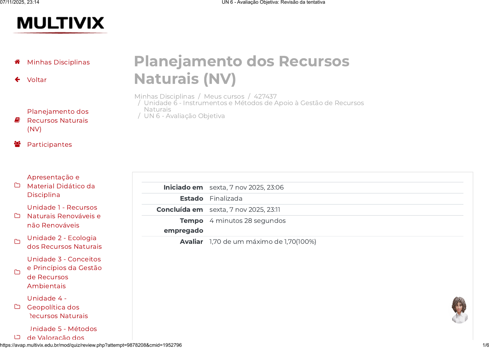 Minhas Disciplinas / Meus cursos / 427437 / Unidade 6 - Instrumentos e Métodos de Apoio à Gestão de Recursos Naturais / UN 6 - Avaliação Objetiva Planejamento dos Recursos Naturais (NV) Iniciado em sexta, 7 nov 2025, 23:06 Estado Finalizada Concluída em sexta, 7 nov 2025, 23:11 Tempo empregado 4 minutos 28 segundos Avaliar 1,70 de um máximo de 1,70(100%) Minhas Disciplinas Voltar Planejamento dos Recursos Naturais (NV) Participantes Apresentação e Material Didático da Disciplina Unidade 1 - Recursos Naturais Renováveis e não Renováveis Unidade 2 - Ecologia dos Recursos Naturais Unidade 3 - Conceitos e Princípios da Gestão de Recursos Ambientais Unidade 4 - Geopolítica dos Recursos Naturais Unidade 5 - Métodos de Valoração dos 07/11/2025, 23:14 UN 6 - Avaliação Objetiva: Revisão da tentativa https://avap.multivix.edu.br/mod/quiz/review.php?attempt=9878208&cmid=1952796 1/6 https://avap.multivix.edu.br/my/ https://avap.multivix.edu.br/course/view.php?id=35884 https://avap.multivix.edu.br/course/view.php?id=35884§ion=7 https://avap.multivix.edu.br/mod/quiz/view.php?id=1952796 https://avap.multivix.edu.br/my/ https://avap.multivix.edu.br/course/view.php?id=35884 https://avap.multivix.edu.br/user/index.php?id=35884 https://avap.multivix.edu.br/course/view.php?id=35884§ion=1 https://avap.multivix.edu.br/course/view.php?id=35884§ion=2 https://avap.multivix.edu.br/course/view.php?id=35884§ion=3 https://avap.multivix.edu.br/course/view.php?id=35884§ion=4 https://avap.multivix.edu.br/course/view.php?id=35884§ion=5 https://avap.multivix.edu.br/course/view.php?id=35884§ion=6 https://avap.multivix.edu.br/ https://avap.multivix.edu.br/ https://avap.multivix.edu.br/ https://avap.multivix.edu.br/ https://avap.multivix.edu.br/ https://avap.multivix.edu.br/ https://avap.multivix.edu.br/ Questão 1 Correto Atingiu 0,34 de 0,34 A gestão sustentável dos recursos naturais exige a adoção de instrumentos técnicos e legais que orientem o uso, o monitoramento e a conservação desses recursos. Entre esses instrumentos estão os planos de bacia hidrográfica, os sistemas de informação geográfica (SIGs) e os estudos de impacto ambiental. Qual das alternativas apresenta corretamente uma ferramenta técnica utilizada na gestão ambiental? Escolha uma opção: a. Licitação pública para compra de insumos. b. Declaração de isenção tributária rural. c. Sistema de Informação Geográfica (SIG), que permite mapear e analisar áreas sob diferentes pressões ambientais. d. Planilhas orçamentárias do setor industrial. e. Relatório de produtividade agrícola sem dados ambientais. Minhas Disciplinas Voltar Planejamento dos Recursos Naturais (NV) Participantes Apresentação e Material Didático da Disciplina Unidade 1 - Recursos Naturais Renováveis e não Renováveis Unidade 2 - Ecologia dos Recursos Naturais Unidade 3 - Conceitos e Princípios da Gestão de Recursos Ambientais Unidade 4 - Geopolítica dos Recursos Naturais Unidade 5 - Métodos de Valoração dos 07/11/2025, 23:14 UN 6 - Avaliação Objetiva: Revisão da tentativa https://avap.multivix.edu.br/mod/quiz/review.php?attempt=9878208&cmid=1952796 2/6 https://avap.multivix.edu.br/my/ https://avap.multivix.edu.br/course/view.php?id=35884 https://avap.multivix.edu.br/user/index.php?id=35884 https://avap.multivix.edu.br/course/view.php?id=35884§ion=1 https://avap.multivix.edu.br/course/view.php?id=35884§ion=2 https://avap.multivix.edu.br/course/view.php?id=35884§ion=3 https://avap.multivix.edu.br/course/view.php?id=35884§ion=4 https://avap.multivix.edu.br/course/view.php?id=35884§ion=5 https://avap.multivix.edu.br/course/view.php?id=35884§ion=6 https://avap.multivix.edu.br/ https://avap.multivix.edu.br/ https://avap.multivix.edu.br/ https://avap.multivix.edu.br/ https://avap.multivix.edu.br/ https://avap.multivix.edu.br/ https://avap.multivix.edu.br/ Questão 2 Correto Atingiu 0,34 de 0,34 A energia, como recurso natural limitado, é um dos temas centrais no planejamento ambiental. O uso racional da energia passa por estratégias como a diversificação da matriz energética, o incentivo às fontes renováveis e a promoção de eficiência energética. Qual das medidas a seguir está mais alinhada à gestão sustentável da energia? Escolha uma opção: a. Desativação de programas de eficiência energética em edifícios públicos. b. Estímulo à produção de combustíveis fósseis em áreas costeiras. c. Ampliação de usinas termelétricas movidas a carvão mineral. d. Subsídio à importação de gás natural. e. Incentivo à geração distribuída por meio da energia solar fotovoltaica. Minhas Disciplinas Voltar Planejamento dos Recursos Naturais (NV) Participantes Apresentação e Material Didático da Disciplina Unidade 1 - Recursos Naturais Renováveis e não Renováveis Unidade 2 - Ecologia dos Recursos Naturais Unidade 3 - Conceitos e Princípios da Gestão de Recursos Ambientais Unidade 4 - Geopolítica dos Recursos Naturais Unidade 5 - Métodos de Valoração dos 07/11/2025, 23:14 UN 6 - Avaliação Objetiva: Revisão da tentativa https://avap.multivix.edu.br/mod/quiz/review.php?attempt=9878208&cmid=1952796 3/6 https://avap.multivix.edu.br/my/ https://avap.multivix.edu.br/course/view.php?id=35884 https://avap.multivix.edu.br/user/index.php?id=35884 https://avap.multivix.edu.br/course/view.php?id=35884§ion=1 https://avap.multivix.edu.br/course/view.php?id=35884§ion=2 https://avap.multivix.edu.br/course/view.php?id=35884§ion=3 https://avap.multivix.edu.br/course/view.php?id=35884§ion=4 https://avap.multivix.edu.br/course/view.php?id=35884§ion=5 https://avap.multivix.edu.br/course/view.php?id=35884§ion=6 https://avap.multivix.edu.br/ https://avap.multivix.edu.br/ https://avap.multivix.edu.br/ https://avap.multivix.edu.br/ https://avap.multivix.edu.br/ https://avap.multivix.edu.br/ https://avap.multivix.edu.br/ Questão 3 Correto Atingiu 0,34 de 0,34 O arcabouço legal brasileiro referente à gestão