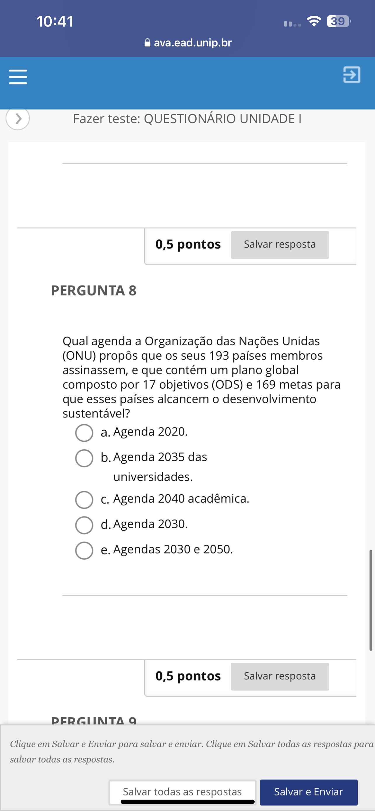 10:41 39 ava.ead.unip.br Fazer teste: QUESTIONÁRIO UNIDADE I 0,5 pontos Salvar resposta PERGUNTA 8 Qual agenda a Organização das Nações Unidas (ONU) propôs que os seus 193 países membros assinassem, e que contém um plano global composto por 17 objetivos (ODS) e 169 metas para que esses países alcancem desenvolvimento sustentável? a. Agenda 2020. b. Agenda 2035 das universidades. C. Agenda 2040 acadêmica. d. Agenda 2030. e. Agendas 2030 e 2050. 0,5 pontos Salvar resposta PERGUNTA 9 Clique em Salvar e Enviar para salvar e enviar. Clique em Salvar todas as respostas para salvar todas as respostas. Salvar todas as respostas Salvar e Enviar