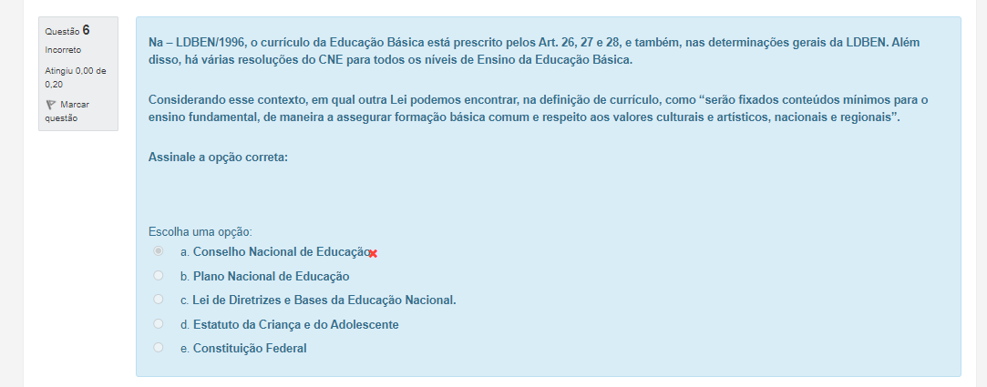 Questão 6 Na - LDBEN/1996, 0 currículo da Educação Básica está prescrito pelos Art. 26, 27 e 28, e também, nas determinações gerais da LDBEN. Além Incorreto disso, várias resoluções do CNE para todos de Ensino da Educação Básica. Atingiu de Marcar Considerando esse contexto, em qual outra Lei podemos encontrar, na definição de currículo, como "serão fixados conteúdos mínimos para 0 questão ensino fundamental, de maneira a assegurar formação básica comum e respeito aos valores culturais e artísticos, nacionais e regionais". Assinale a opção correta: Escolha uma opção: a. Conselho Nacional de b. Plano Nacional de Educação C. Lei de Diretrizes e Bases da Educação Nacional. d. Estatuto da Criança e do Adolescente e. Constituição Federal