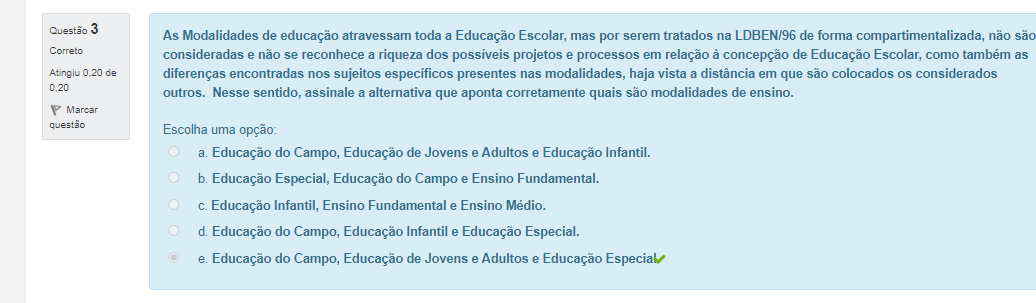 Questão 3 As Modalidades de educação atravessam toda a Educação Escolar, mas por serem tratados na LDBEN/96 de forma compartimentalizada, não são Correto consideradas e não se reconhece a riqueza dos possíveis projetos e processos em relação à concepção de Educação Escolar, como também as Atingiu 0.20 de diferenças encontradas nos sujeitos específicos presentes nas modalidades, haja vista a distância em que são colocados considerados 0.20 outros. Nesse sentido, assinale a alternativa que aponta corretamente quais são modalidades de ensino. P Marcar questão Escolha uma opção: a. Educação do Campo, Educação de Jovens e Adultos e Educação Infantil. b. Educação Especial, Educação do Campo e Ensino Fundamental. C. Educação Infantil, Ensino Fundamental e Ensino Médio. d. Educação do Campo, Educação Infantil e Educação Especial. e. Educação do Campo, Educação de Jovens e Adultos e Educação Especial/