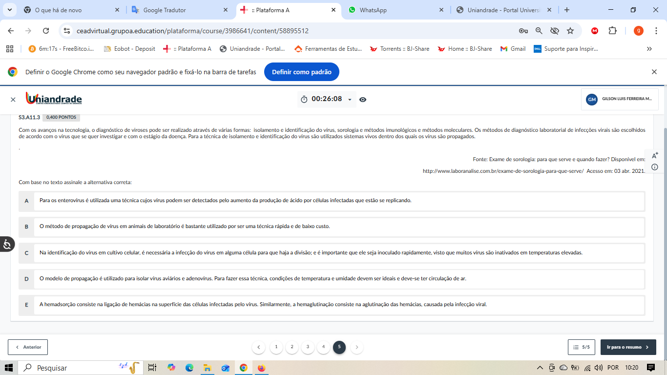 que ha de novo Google Tradutor + Plataforma A X WhatsApp Uniandrade Portal Universi X + X ceadvirtual.grupoa.education/plataforma/course/3986641/content/58895512 - g 6m:17s Eobot Deposit Plataforma A Uniandrade Portal... Ferramentas de Estu... Torrents BJ-Share Home BJ-Share Gmail Suporte para Inspir... » Definir Google Chrome como seu navegador padrão e fixá-lo na barra de tarefas Definir como padrão X Uniandrade 00:26:08 GM GILSON LUIS FERREIRA M... S3.A11.3 0,400 PONTOS Com os avanços na diagnóstico de viroses pode ser realizado através de varias formas: isolamento e identificação do sorologia e métodos imunológicos e métodos moleculares. Os métodos de diagnóstico laboratorial de infecções virais são escolhidos de acordo com virus que se quer investigar e com da doença. Para a técnica de isolamento e identificação do são utilizados sistemas vivos dentro dos quais os virus são propagados. Fonte: Exame de sorologia: para que serve e quando fazer? Disponível em: http://www.laboranalise.com.br/exame-de-sorologia-para-que-serve/ Acesso em: 03 abr. 2021. Com base no texto assinale a alternativa correta: A Para os enterovirus é utilizada uma técnica cujos virus podem ser detectados pelo aumento da produção de ácido por células infectadas que estão se replicando. B O método de propagação de virus em animais de laboratório é bastante utilizado por ser uma técnica e de baixo custo. C Na identificação do virus em cultivo celular, é necessária a infecção do virus em alguma célula para que haja a divisão; e é importante que ele seja inoculado visto que muitos virus são inativados em temperaturas elevadas. D O modelo de propagação é utilizado para isolar virus Para fazer essa técnica, condições de temperatura e umidade devem ser ideais e deve-se ter circulação de ar. E A hemadsorção consiste na ligação de na superficie das células infectadas pelo Similarmente, a hemaglutinação consiste na aglutinação das causada pela infecção viral. 5/5 Ir para 0 resumo > Pesquisar POR 10:20