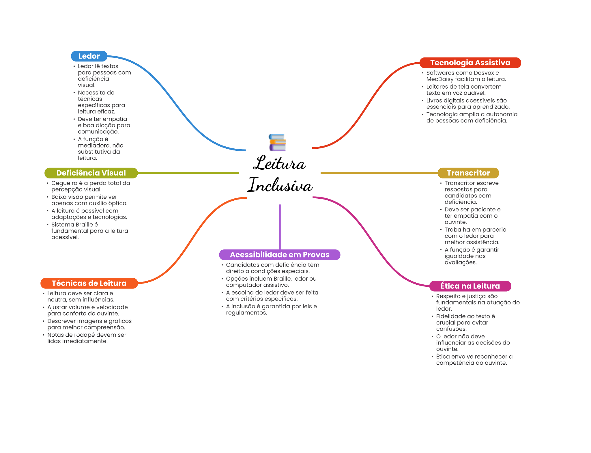 Ledor Ledor lê textos Tecnologia Assistiva para pessoas com Softwares como Dosvox e deficiência MecDaisy facilitam a leitura. visual. Leitores de tela convertem Necessita de texto em audível. técnicas Livros digitais acessíveis são específicas para essenciais para aprendizado. leitura eficaz. Tecnologia amplia a autonomia Deve ter empatia de pessoas com deficiência. e boa dicção para comunicação. A função é mediadora, não substitutiva da leitura. Leitura Deficiência Visual Transcritor Cegueira é a perda total da percepção visual. Inclusiva Transcritor escreve respostas para Baixa visão permite ver candidatos com apenas com auxílio óptico. deficiência. A leitura é possível com Deve ser paciente e adaptações e tecnologias. ter empatia com Sistema Braille é ouvinte. fundamental para a leitura Trabalha em parceria acessível. com ledor para melhor assistência. A função é garantir Acessibilidade em Provas igualdade nas Candidatos com deficiência têm avaliações. direito a condições especiais. Opções incluem Braille, ledor ou Técnicas de Leitura computador assistivo. Ética na Leitura Leitura deve ser clara e A escolha do ledor deve ser feita neutra, sem influências. com critérios específicos. Respeito e justiça são fundamentais na atuação do Ajustar volume e velocidade A inclusão é garantida por leis e ledor. para conforto do ouvinte. regulamentos. Fidelidade ao texto é Descrever imagens e gráficos crucial para evitar para melhor compreensão. confusões. Notas de rodapé devem ser O ledor não deve lidas imediatamente. influenciar as decisões do ouvinte. Ética envolve reconhecer a competência do ouvinte.