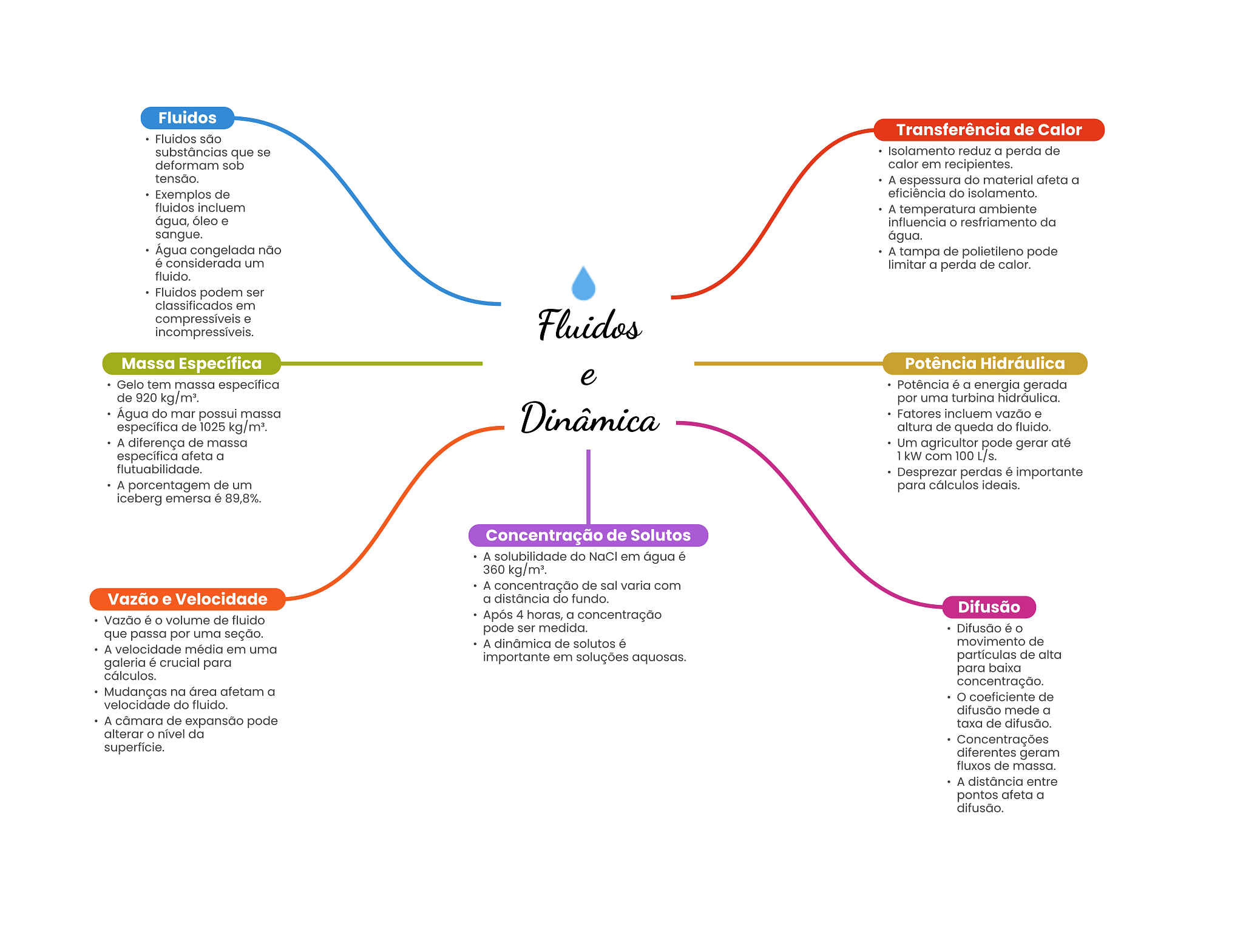 Fluidos Transferência de Calor Fluidos são substâncias que se Isolamento reduz a perda de deformam sob calor em recipientes. tensão. A espessura do material afeta a Exemplos de eficiência do isolamento. fluidos incluem A temperatura ambiente água, óleo e influencia resfriamento da sangue. água. Água congelada não A tampa de polietileno pode é considerada um limitar a perda de calor. fluido. Fluidos podem ser classificados em compressíveis e incompressíveis. Fluidos Massa Específica Potência Hidráulica e Gelo tem massa específica Potência é a energia gerada de 920 kg/m³. por uma turbina hidráulica. Água do mar possui massa específica de 1025 kg/m³. Dinâmica Fatores incluem vazão e altura de queda do fluido. A diferença de massa Um agricultor pode gerar até específica afeta a 1 kW com 100 L/s. flutuabilidade. Desprezar perdas é importante A porcentagem de um para cálculos ideais. iceberg emersa é 89,8%. Concentração de Solutos A solubilidade do NaCl em água é 360 A concentração de sal varia com Vazão e Velocidade a distância do fundo. Difusão Vazão é volume de fluido Após 4 horas, a concentração que passa por uma seção. pode ser medida. Difusão é A velocidade média em uma A dinâmica de solutos é movimento de importante em soluções aquosas. partículas de alta galeria é crucial para para baixa cálculos. concentração. Mudanças na área afetam a coeficiente de velocidade do fluido. difusão mede a A câmara de expansão pode taxa de difusão. alterar nível da Concentrações superfície. diferentes geram fluxos de massa. A distância entre pontos afeta a difusão.