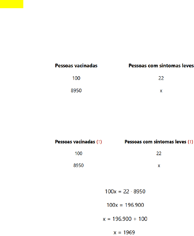 GABARITO DA LISTA DE REVISÃO 1 – MATEMÁTICA BÁSICA 1) Durante o ano de 2020, devido à pandemia de COVID-19, o mundo viu-se dependente da criação de uma vacina para imunizar a população. No Brasil não foi diferente, e a corrida por uma vacina eficaz só terminou no ano de 2021. A primeira delas foi a Coronavac, produzida pelo Instituto Butantan, que anunciou que a vacina possui 78% de eficácia em casos leves. Isso significa que, se 100 pessoas forem vacinadas, 78 pessoas não terão sintoma algum e 22 pessoas terão sintomas leves. A partir desse anúncio, iniciou-se a campanha de imunização. Supondo-se que a cidade de Abadia de Goiás (próxima da capital Goiânia) tenha conseguido vacinar toda a sua população, que é de 8.950 habitantes, e considerando-se que toda ela tenha contato com o vírus e que essa proporção seja mantida, a quantidade de pessoas que terão sintomas leves nessa população será de: A) 6979 B) 6780 C) 2170 D) 1969 E) 1852 Sabemos que 100 está para 22 assim como 8950 está para x, em que x é a quantidade de pessoas que terão sintomas leves nessa população. Agora, analisando a proporcionalidade entre essas grandezas, se se aumenta o número de pessoas vacinadas, é possível concluir que a quantidade de pessoas que apresentam sintomas leves também será maior, logo, estamos trabalhando com grandezas diretamente proporcionais. Quando isso ocorre, basta multiplicar cruzado: 2) Em um curso de idiomas, foi feita uma pesquisa com 50 alunos para verificar quais línguas estrangeiras eles gostariam de aprender. O resultado foi: 40 querem aprender inglês; 20 querem aprender espanhol; 15 querem aprender inglês e espanhol. Após a elaboração do diagrama de Venn, analise as seguintes afirmações: I- O número de alunos que não querem aprender nenhuma das duas línguas é 5. II- O número de alunos que querem aprender inglês ou espanhol é 40. III- O número de alunos que querem aprender somente inglês é 30. São corretas as afirmações: A) I, apenas B) I e II, apenas. C) II e III, apenas. D) TODAS as afirmações estão CORRETAS. E) TODAS as afirmações estão INCORRETAS. Temos que: U = 50; I = 40; E = 20; I ∩ E = 15 Colocando a interseção no centro, a subtraindo dos conjuntos I e E, temos: E subtraindo do total: 50 – 25 – 15 – 5 = 5, resultando em I- O número de alunos que não querem aprender nenhuma das duas línguas é 5, portanto afirmação I é verdadeira. II- O número de alunos que querem aprender inglês ou espanhol é 25 + 15 + 5 = 45, portanto a afirmação II é falsa. III- O número de alunos que querem aprender somente inglês é 25, portanto a afirmação III é falsa. 3) Considere a função a seguir: y = 3x – 5 Nesse caso, é correto afirmar que: A) Quando x = 10, a função vale y = 35. B) O par ordenado (6,13) é um ponto da função y = 3x – 5. C) O par ordenado (7,18) é um ponto da função y = 3x – 5. D) TODAS as alternativas anteriores estão CORRETAS. E) TODAS as alternativas anteriores estão INCORRETAS. A) Quando x = 10, a função vale y = 3·10 – 5 = 30 – 5 = 25. Portanto a alternativa A está errada. O correto seria “Quando x = 10, a função vale y = 25.” B) Quando x = 6, a função vale y = 3·6 – 5 = 18 – 5 = 13. Portanto (6,13) é um ponto da função, tornando B correto. C) Quando x = 7, a função vale y = 3·7 – 5 = 21 – 5 = 16. Portanto (7,18) não é um ponto da função, tornando C errada. O correto seria “O par ordenado (7,16) é um ponto da função y = 3x – 5.” Ou “O par ordenado (7,18) não é um ponto da função y = 3x – 5”. 4) Considere a função a seguir: y = 2x – 8 Dado x = -b/a. Nesse caso, é correto afirmar que: A) Essa função é de 1o grau e portanto o seu gráfico é uma reta. B) Essa função é crescente. C) O zero dessa função é x = 4. D) TODAS as alternativas anteriores estão CORRETAS. E) TODAS as alternativas anteriores estão INCORRETAS. A) De fato ela é uma função é de 1o grau e portanto o seu gráfico é uma reta. B) Como a = 2 (‘a’ é positivo), a função é crescente. C) Sabendo que a = 2 e b = – 4, temos que a raiz é: x = − b a = − −8 2 = −(−4) = 4 C) Logo, C também está correta. 5) Considere a função a seguir: y = x2 – 6x + 8 Dado: Analise as seguintes afirmações: I- Essa função é de 2o grau e portanto o seu gráfico é uma reta. II- As raízes dessa função são x = 2 e x = 4. III- Essa função tem um ponto de máximo em (3, -1). São corretas as afirmações: A) I, apenas B) II, apenas. C) I e III, apenas. D) II e III, apenas. E) TODAS as afirmações estão CORRETAS. I- Está errada. O correto seria “Essa função é de 2o grau e portanto o seu gráfico é uma parábola” II- Sabendo que a = 1, b = -6 e c = 8, temos que: ∆ = b2 − 4ac = (−6)2 − 4 ∙ 1 ∙ 8 = 36 − 32 = 4 x = −b ± √∆ 2a = −(−6) ± √4 2 ∙ 1 = 6 ± 2 2 x1 = 6 + 2 2 = 8 2 = 4 x2 = 6 − 2 2 = 4 2 = 2 Com isso, as raízes dessa função são x = 2 e x = 4 e portanto a afirmação II está correta. III- Como a = 1 (positivo), a concavidade está para cima. Portanto, a função deve ter um ponto de mínimo, e não de máximo. Logo, a afirmação III está errada. 6) Considere as seguintes funções: f(x) = 4x – 2 g(x) = 3x Nesse caso, a função g(f(x)) é dada por: A) g(f(x)) = 12x – 2 B) g(f(x)) = 4x – 6 C) g(f(x)) = 12x – 6 D) g(f(x)) = 3x – 2 E) g(f(x)) = 3x – 6 Para calcular g(f(x)), temos que colocar a função f(x) no lugar do x da função g(x). Assim: g(f(x)) = 3 f(x) = 3 (4x – 2) = 12x – 6 7) Na promoção de uma loja de eletrodomésticos, um aparelho de som que custava R$ 400,00 teve um desconto de 12%. Quanto o cliente que decidir comprar o equipamento pagará? A) R$ 352,00 B) R$ 359,00 C) R$ 365,00 D) R$ 371,00 E) R$ 378,00 f = 1 − 12 100 = 1 − 0,12 = 0,88 400 ∙ 0,88 = 352 8) O preço à vista de um produto é R$ 1.200,00. Ao pagar uma entrada de R$ 300,00, qual se