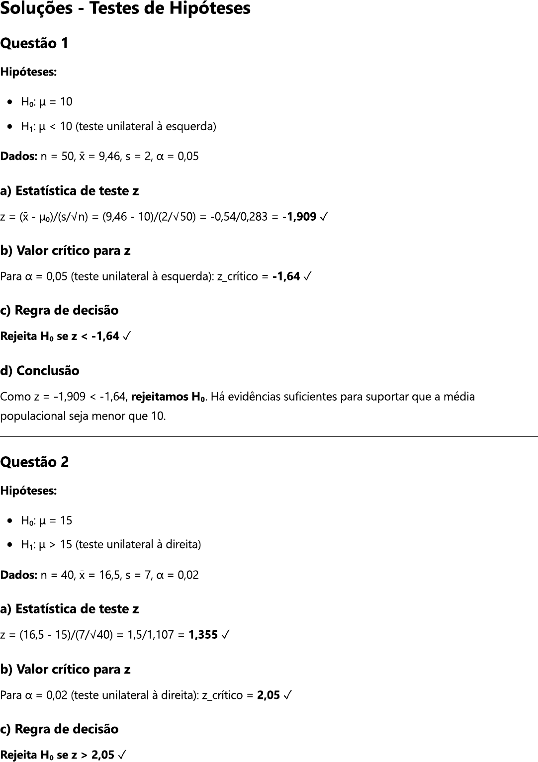 Soluções - Testes de Hipóteses Questão 1 Hipóteses: = 10 15 (teste unilateral à direita) Dados: n = 40, = 16,5, S = 7, = 0,02 a) Estatística de teste Z = (16,5 = 1,5/1,107 = 1,355 b) Valor crítico para Z Para = 0,02 (teste unilateral à direita): z_crítico = 2,05 c) Regra de decisão Rejeita se Z > 2,05d) Valor-p Para Z = 1,355: = P(Z > 1,355) = 0,9125 = 0,0875 e) Conclusão Como 1,355 0,02, não rejeitamos Não há evidências suficientes para suportar que a média populacional seja maior que 15. Questão 3 Hipóteses: = 25 # 25 (teste bilateral) Dados: n = 80, = 22, σ = 10, = 0,05 a) Estatística de teste Z Z = (22 = -3/1,118 = -2,683 b) Valor crítico para Z Para = = 0,05 (teste bilateral): z_crítico = ±1,96 c) Regra de decisão Rejeita H₀ se Z 1,96 d) Conclusão Como Z = -2,683b) Desvio padrão amostral S = = = = 1,414 c) Estatística de teste t t = = -2/0,577 = -3,464 d) Regra de decisão = 0,05) Para n = teste bilateral: t_crítico = ±2,571 Rejeita H₀ se t 2,571 e) Conclusão Como t = -3,464 1,96 c) Valor-p Para Z = -1,25: = 0,05, não rejeitamos Não há evidências suficientes para suportar que a proporção populacional seja diferente de 0,2. Questão 6 Hipóteses: = 0,75-1,96 e > 0,05, não rejeitamos H₀. Não há evidências suficientes para suportar que a proporção populacional seja menor que 0,75. Questão 7 Afirmação: A média da população é superior a 0,21 Hipóteses: = 0,21 > 0,21 Estatística de teste: Z = 14,6135 Regra de decisão: Rejeita H₀ se Z > 2,32 Conclusão: Como Z = 14,6135 > 2,32, rejeitamos Valor-p: ≈ Questão 8 Afirmação: A média da população é inferior a 1,39 dias Hipóteses: = 1,39Estatística de teste: Z = 1,367 Regra de decisão: Rejeita H₀ se Z > 1,64 Conclusão: Como Z = = 1,367 1,367) = 0,0853 Questão 10 Afirmação: O tempo médio é inferior a 7,5 anos Hipóteses: = 7,5 H1: -1,64, não rejeitamos Valor-p: P(Z 2,57 Conclusão: Como Z = -4,223 420 Estatística de teste: Z = -8,627 Regra de decisão: Rejeita H₀ se Z > 1,64 Conclusão: Como Z = -8,627 ≈ Resumo das Principais Fórmulas Para teste de média (n ≥ 30 ou σ conhecido): Z = (x ou Z = (x Para teste de média (n(p Regras de Decisão: Teste unilateral à direita: Rejeita H₀ Teste unilateral à esquerda: Rejeita H₀ Teste bilateral: Rejeita H₀ se |z|