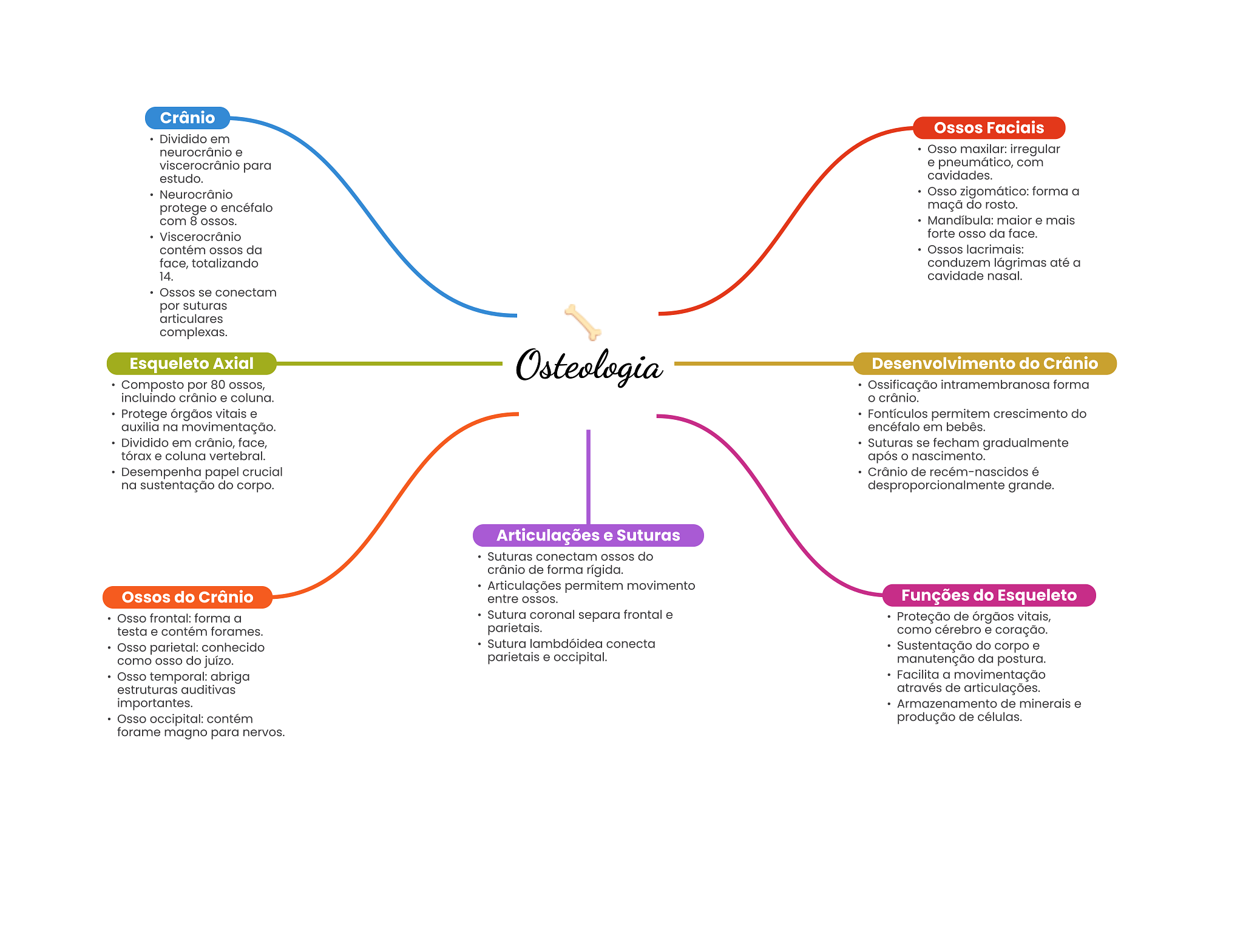 Crânio Ossos Faciais Dividido em neurocrânio e Osso maxilar: irregular viscerocrânio para e pneumático, com estudo. cavidades. Neurocrânio Osso zigomático: forma a protege encéfalo maçã do rosto. com 8 OSSOS. Mandíbula: maior e mais Viscerocrânio forte osso da face. contém da Ossos lacrimais: face, totalizando conduzem lágrimas até a 14. cavidade nasal. Ossos se conectam por suturas articulares complexas. Esqueleto Axial Osteologia Desenvolvimento do Crânio Composto por 80 Ossificação intramembranosa forma incluindo crânio e coluna. crânio. Protege órgãos vitais e Fontículos permitem crescimento do auxilia na movimentação. em bebês. Dividido em crânio, face, Suturas se fecham gradualmente tórax e coluna vertebral. após O nascimento. Desempenha papel crucial Crânio de recém-nascidos é na sustentação do corpo. desproporcionalmente grande. Articulações e Suturas Suturas conectam do crânio de forma rígida. Articulações permitem movimento Ossos do Crânio entre OSSOS. Funções do Esqueleto Osso frontal: forma a Sutura coronal separa frontal e Proteção de órgãos vitais, testa e contém forames. parietais. como cérebro e coração. Osso parietal: conhecido Sutura lambdóidea conecta Sustentação do corpo e como do juízo. parietais e occipital. manutenção da postura. Osso temporal: abriga Facilita a movimentação estruturas auditivas através de articulações. importantes. Armazenamento de minerais e Osso occipital: contém produção de células. forame magno para nervos.