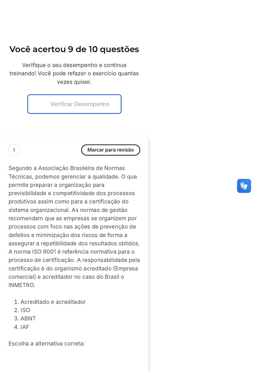 Você acertou 9 de 10 questões Verifique o seu desempenho e continue treinando! Você pode refazer o exercício quantas vezes quiser. Verificar Desempenho 1 Marcar para revisão Segundo a Associação Brasileira de Normas Técnicas, podemos gerenciar a qualidade. O que permite preparar a organização para previsibilidade e competitividade dos processos produtivos assim como para a certificação do sistema organizacional. As normas de gestão recomendam que as empresas se organizem por processos com foco nas ações de prevenção de defeitos e minimização dos riscos de forma a assegurar a repetibilidade dos resultados obtidos. A norma ISO 9001 é referência normativa para o processo de certificação. A responsabilidade pela certificação é do organismo acreditado (Empresa comercial) e acreditador no caso do Brasil o INMETRO. 1. Acreditado e acreditador 2. ISO 3. ABNT 4. IAF Escolha a alternativa correta: A B C D E I II II e III III e IV I, II, III e IV Resposta correta Parabéns, você selecionou a alternativa correta. Confira o gabarito comentado! Gabarito Comentado A norma ISO 9001 é referência normativa para o processo de certificação. A responsabilidade pela certificação é do organismo acreditado (Empresa comercial) e acreditador no caso do Brasil o INMETRO. 2 Marcar para revisão Segundo as Normas Técnicas, podemos gerenciar a qualidade. O que permite preparar a organização para previsibilidade e competitividade dos processos produtivos assim como para a certificação do sistema organizacional. A representação dos níveis de normalização é realizada através de uma pirâmide. No nível Nacional podemos dar como A B C D E exemplo a seguinte norma. Escolha a alternativa correta. Procedimentos Empresariais ABNT ABDID CEU ISO Resposta correta Parabéns, você selecionou a alternativa correta. Confira o gabarito comentado! Gabarito Comentado No nível Nacional podemos dar como exemplo a norma ABNT (Associação Brasileira de Normas Técnicas). ----- 3 Marcar para revisão Segundo a Associação Brasileira de Normas Técnicas, podemos gerenciar a qualidade. O que permite preparar a organização para previsibilidade e competitividade dos processos produtivos assim como para a certificação do sistema organizacional. Quanto aos agentes A B C D E econômicos a atividade de certificação pode ser classificada como: I. De primeira parte: quando é feita pelo fabricante ou pelo fornecedor; II. De segunda parte: quando é feita pelo comprador/cliente; III. De terceira parte: quando é feita por uma organização com independência em relação ao fornecedor e ao cliente. Escolha a alternativa correta: I II III II e III I, II e III Resposta correta Parabéns, você selecionou a alternativa correta. Confira o gabarito comentado! Gabarito Comentado Todas as alternativas estão corretas. A certificação de primeira parte é feita pelo fabricante ou pelo fornecedor; A certificação de segunda parte é feita pelo comprador/cliente; A certificação de terceira parte é feita por uma organização com independência em relação ao fornecedor e A B C D E ao cliente, não tendo, portanto, interesse na comercialização do produto. 4 Marcar para revisão Segundo a Associação Brasileira de Normas Técnicas, podemos gerenciar a qualidade. O que permite preparar a organização para previsibilidade e competitividade dos processos produtivos assim como para a certificação do sistema organizacional. Na Certificação voluntária a empresa é responsável por definir se deve ou não certificar o seu produto, partindo dos benefícios que identifique que essa certificação possa trazer ao seu negócio. Já na Certificação Compulsória, esta é regida por lei ou portaria de um órgão regulamentador. Ela dá prioridade às questões de _______________________________. Escolha a alternativa correta. I. Segurança, Saúde e Meio Ambiente. II. Qualidade, Custo, Prazo. III. Produção, Distribuição, Tecnologia da informação. I II III II, III I, III A B C Resposta correta Parabéns, você selecionou a alternativa correta. Confira o gabarito comentado! Gabarito Comentado A Certificação Compulsória é regida por lei ou portaria de um órgão regulamentador. Ela dá prioridade às questões de segurança, saúde e maio ambiente. Sendo assim, os produtos listados nas regulamentações só podem ser comercializados com a certificação. 5 Marcar para revisão Segundo a Associação Brasileira de Normas Técnicas, podemos gerenciar a qualidade. O que permite preparar a organização para previsibilidade e competitividade dos processos produtivos assim como para a certificação do sistema organizacional. Um dos benefícios a ser destacado pela normalização é que seu aprimoramento favorece a melhoria do processo de produção, propiciando maior qualidade, maior segurança e menor custo. Escolha a alternativa correta. Inspeção, Segurança e Custo. Qualidade, Segurança e Custo. Inspeção, Energia e Prazo. D E A B Custo, Prazo e Qualidade. Controle, Custo e Qualidade. Resposta correta Parabéns, você selecionou a alternativa correta. Confira o gabarito comentado! Gabarito Comentado Quando se atua nos processos da empresa praticando a normalização e a padronização temos como consequência: a melhoria da qualidade de conformidade, a melhoria da segurança e a redução dos defeitos e redução dos custos. 6 Marcar para revisão Segundo a Associação Brasileira de Normas Técnicas, a normalização é a atividade que estabelece, em relação a problemas existentes, prescrições destinadas à utilização comum e repetitiva com vistas à obtenção do grau ótimo de ordem em um dado contexto. Podemos considerar a normalização como a atividade sistemática de: Melhorar a Qualidade Planejar a Qualidade C D E Satisfazer os Clientes Controlar a Qualidade Estabelecer e utilizar padrões Resposta correta Parabéns, você selecionou a alternativa correta. Confira o gabarito comen