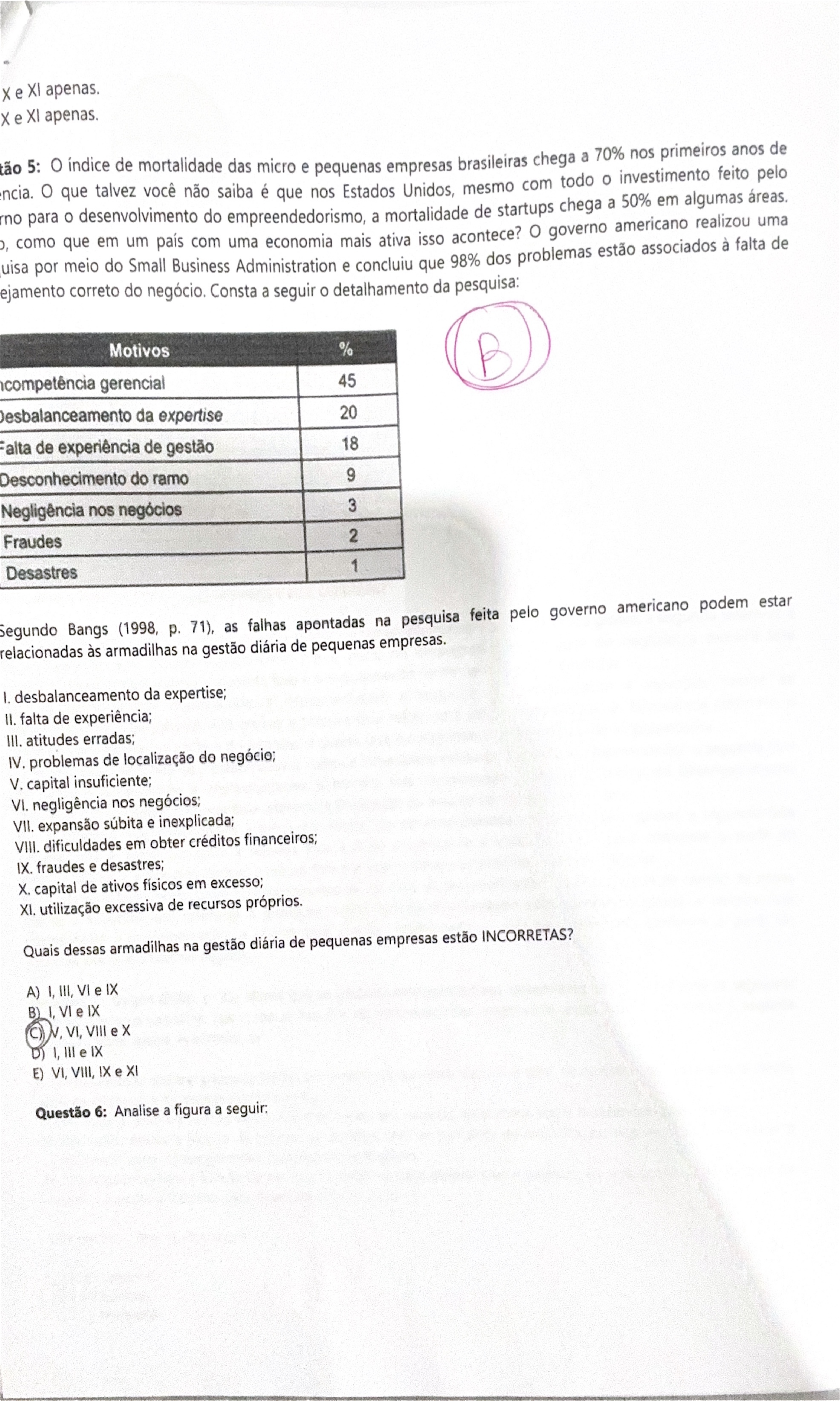 e XI apenas. e XI apenas. tão 5: O índice de mortalidade das micro e pequenas empresas brasileiras chega a 70% nos primeiros feito anos pelo de ncia. O que talvez você não saiba é que nos Estados Unidos, mesmo com todo investimento áreas. no para desenvolvimento do empreendedorismo, a mortalidade de startups chega a 50% em algumas realizou uma como que em um país com uma economia mais ativa isso acontece? governo americano à falta de uisa por meio do Small Business Administration e concluiu que 98% dos problemas estão associados ejamento correto do negócio. Consta a seguir detalhamento da pesquisa: Motivos % competência gerencial 45 da expertise 20 Falta de experiência de gestão 18 Desconhecimento do ramo 9 Negligência nos negócios 3 Fraudes 2 Desastres 1 Segundo Bangs (1998, 71), as falhas apontadas na pesquisa feita pelo governo americano podem estar relacionadas às armadilhas na gestão diária de pequenas empresas. 1. desbalanceamento da expertise; II. falta de experiência; III. atitudes erradas; IV. problemas de localização do negócio; V. capital insuficiente; VI. negligência nos negócios; VII. expansão súbita e inexplicada; VIII. dificuldades em obter créditos financeiros; IX. fraudes e desastres; X. capital de ativos físicos em excesso; XI. utilização excessiva de recursos próprios. Quais dessas armadilhas na gestão diária de pequenas empresas estão INCORRETAS? A) I, III, VI e IX B) I, VI e IX VI, VIII e X D) I, III e IX E) VI, VIII, IX e XI Questão 6: Analise a figura a seguir: