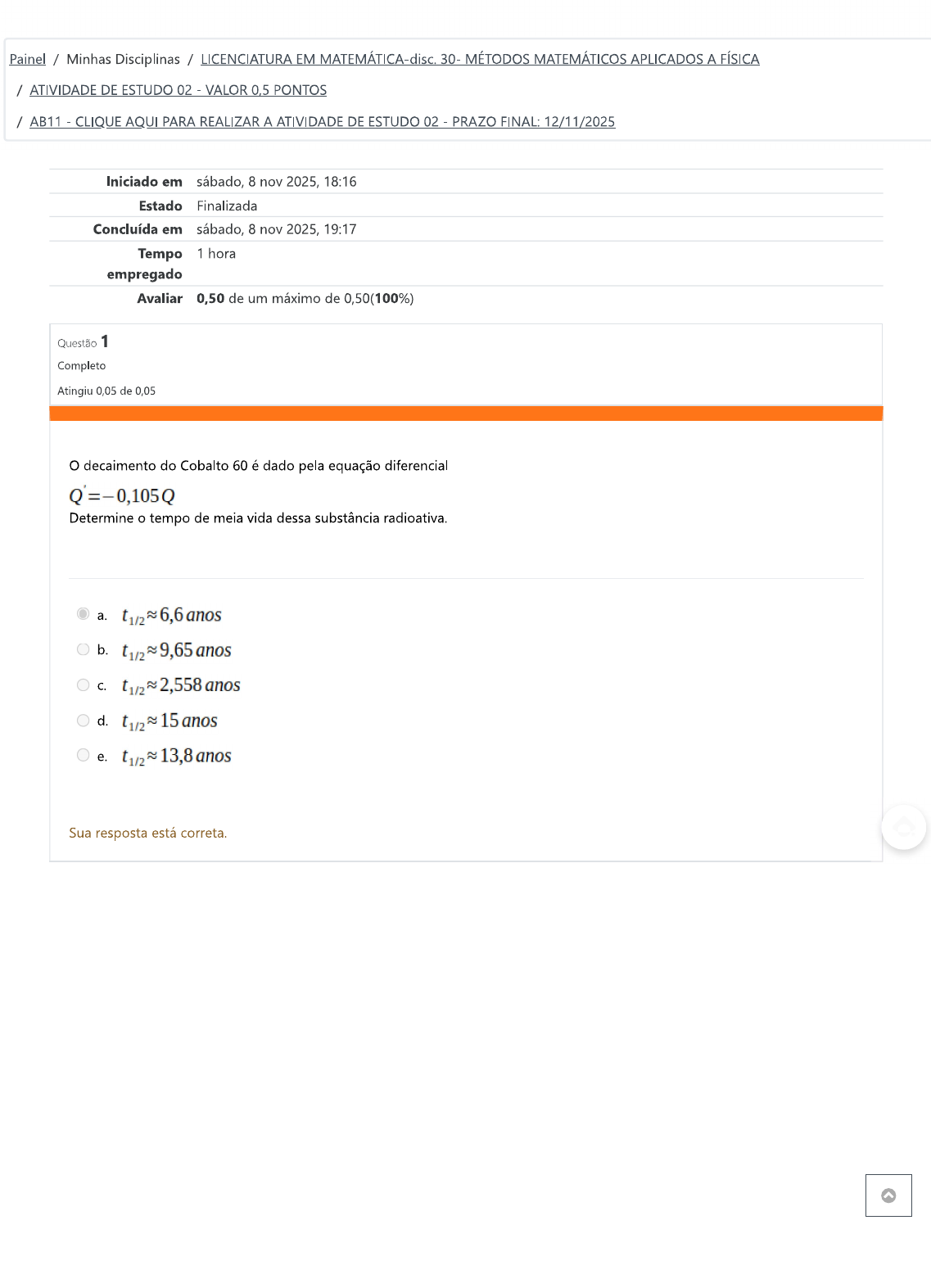Painel / Minhas Disciplinas / LICENCIATURA EM MATEMÁTICA-disc. 30- MÉTODOS MATEMÁTICOS APLICADOS A FÍSICA / ATIVIDADE DE ESTUDO 02 VALOR 0,5 PONTOS / AB11 CLIQUE AQUI PARA REALIZAR A ATIVIDADE DE ESTUDO 02 PRAZO FINAL: 12/11/2025 Iniciado em sábado, 8 nov 2025, 18:16 Estado Finalizada Concluída em sábado, 8 nov 2025, 19:17 Tempo 1 hora empregado Avaliar 0,50 de um máximo de 0,50(100%) Questão 1 Completo Atingiu 0,05 de 0,05 decaimento do Cobalto 60 é dado pela equação diferencial Q'=-0,105Q Determine o tempo de meia vida dessa substância radioativa. a. b. C. anos d. e. Sua resposta está correta.Questão 2 Completo Atingiu 0,05 de 0,05 Suponha que um dado elemento radioativo, inicialmente mensurado com uma massa de 60 mg. Admitindo que o tempo de meia vida seja de 500 anos, qual a equação de decaimento em função do tempo? a. b. C. d. e. Sua resposta está correta. Questão 3 Completo Atingiu 0,05 de 0,05 Um reservatório tem a equação diferencial homogênea de segunda ordem abaixo que descreve a variação do nível da água ao longo do tempo. 2 dx Qual seria a solução geral dessa equação? a. b. C. d. e. Sua resposta está correta.Questão 4 Completo Atingiu 0,05 de 0,05 Uma partícula é lançada em um campo gravitacional uniforme e a equação diferencial que descreve o movimento da partícula é uma equação diferencial homogênea de segunda ordem. dx Qual seria a solução dessa equação? a. b. C. d. e. y Sua resposta está correta. Questão 5 Completo Atingiu 0,05 de 0,05 Segundo dados de pesquisa, em 2000 a população do Paraguai era de aproximadamente 50 milhões de pessoas. Já nos anos 2010, a população subiu para 80 milhões de habitantes. Determine a equação de crescimento populacional. a. b. C. d. e. Sua resposta está correta.Questão 6 Completo Atingiu 0,05 de 0,05 Dada uma quantidade de líquido a uma temperatura de conteúdo se encontra em um copo o qual é deixado para descansar a uma temperatura ambiente de 20°C . Determine qual é a equação da temperatura em função do tempo (registrado em minutos). a. b. C. d. e. Sua resposta está correta. Questão 7 Completo Atingiu 0,05 de 0,05 Um circuito elétrico RLC é composto por um resistor, um capacitor e uma bobina, a EDO de segunda ordem é dada por: dx Qual seria a solução dessa equação? a. y b. C. y d. e. Sua resposta está correta.Questão 8 Completo Atingiu 0,05 de 0,05 Um elemento oscilante está preso em um corpo, permitindo uma oscilação. A equação diferencial que descreve o movimento da massa é uma equação diferencial homogênea de segunda ordem. Assinale qual seria a solução homogênea da EDO a seguir? 4 a. b. C. d. e. Sua resposta está correta. Questão 9 Completo Atingiu 0,05 de 0,05 Um pêndulo simples, constituído por uma bolinha de massa ml, ligada por um fio inextensível ao teto de uma sala, oscila executando um MHS e tem uma equação diferencial homogênea de segunda ordem que é dada por: dx Qual seria a solução dessa equação? a. b. C. d. e. Sua resposta está correta.Questão 10 Completo Atingiu 0,05 de 0,05 Imagine que uma quantidade de leite quente está a 80°C. conteúdo se encontra em um copo o qual é deixado para descansar a uma temperatura ambiente de 25°C . Determine qual é a equação da temperatura em função do tempo (registrado em minutos). a. b. C. d. e. Sua resposta está correta. CLIQUE AQUI PARA REALIZAR FÓRUM DE DISCUSSÃO Seguir para... ENQUETE DE SATISFAÇÃO EAD UNIFATECIE