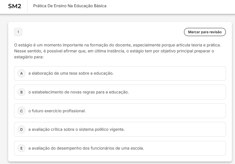 SM2 Prática De Ensino Na Educação Básica 1 Marcar para revisão é um momento importante na formação do docente, especialmente porque articula teoria e prática. Nesse sentido, é afirmar que, em última instância, tem por objetivo principal preparar 0 para: A a elaboração de uma tese sobre a educação. B estabelecimento de novas regras para a educação. C futuro exercício profissional. D a avaliação sobre sistema político vigente. E a avaliação do desempenho dos funcionários de uma escola.