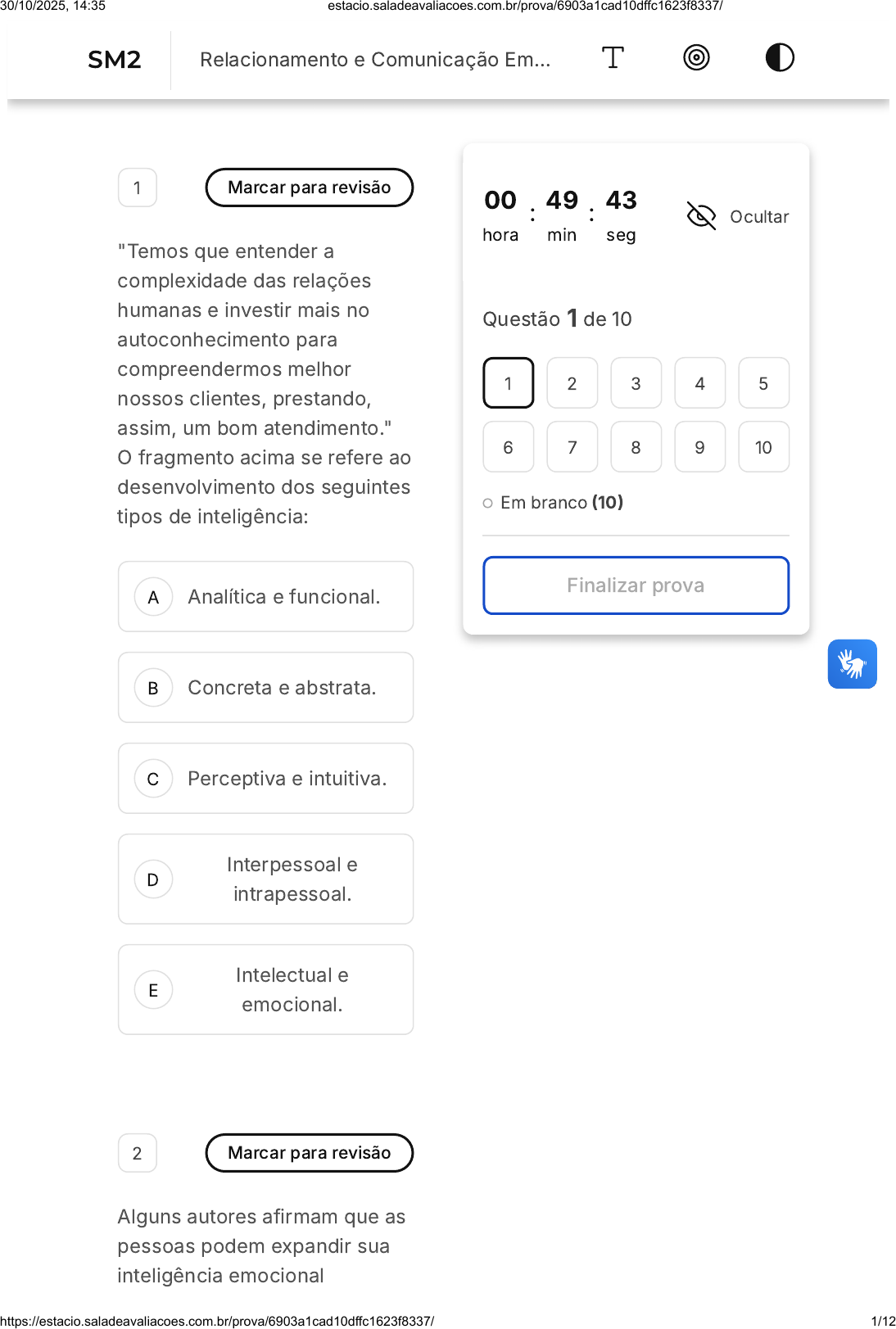 A B C D E 1 Marcar para revisão "Temos que entender a complexidade das relações humanas e investir mais no autoconhecimento para compreendermos melhor nossos clientes, prestando, assim, um bom atendimento." O fragmento acima se refere ao desenvolvimento dos seguintes tipos de inteligência: Analítica e funcional. Concreta e abstrata. Perceptiva e intuitiva. Interpessoal e intrapessoal. Intelectual e emocional. 2 Marcar para revisão Alguns autores afirmam que as pessoas podem expandir sua inteligência emocional 00 hora : 49 min : 43 seg Ocultar Questão 1 de 10 Em branco (10) Finalizar prova 1 2 3 4 5 6 7 8 9 10 SM2 Relacionamento e Comunicação Em… 30/10/2025, 14:35 estacio.saladeavaliacoes.com.br/prova/6903a1cad10dffc1623f8337/ https://estacio.saladeavaliacoes.com.br/prova/6903a1cad10dffc1623f8337/ 1/12 A B C aprendendo a controlar suas emoções e a motivarem-se; podem também maximizar a eficácia da inteligência emocional desenvolvendo a capacidade de comunicação, a destreza interpessoal e a habilidade como mentores emocionais. A respeito desse assunto, assinale a alternativa correta. O conhecimento subjetivo a respeito da natureza da própria personalidade desfavorece escolhas melhores. A consciência de si leva à consciência dos outros, mas desfavorece um melhor relacionamento. Não é necessário que um indivíduo compreenda o que o faz agir como age para que ele busque melhores resultados. 30/10/2025, 14:35 estacio.saladeavaliacoes.com.br/prova/6903a1cad10dffc1623f8337/ https://estacio.saladeavaliacoes.com.br/prova/6903a1cad10dffc1623f8337/ 2/12 D E A B A autoconsciência é o cerne das aptidões que expandem a inteligência emocional. A autoconsciência aguçada impede o monitoramento e a observação de si mesmo. 3 Marcar para revisão Segundo o referencial aplicado na enfermagem, as necessidades humanas básicas classificadas como psicossociais compreendem, dentre outros, gregarismo, que consiste, respectivamente, na necessidade do indivíduo de: Intercalar o trabalho ou atividade rotineira com atividades que propiciem divertimento e prazer para alívio da tensão. Exercitar-se e movimentar-se na senescência. 30/10/2025, 14:35 estacio.saladeavaliacoes.com.br/prova/6903a1cad10dffc1623f8337/ https://estacio.saladeavaliacoes.com.br/prova/6903a1cad10dffc1623f8337/ 3/12 C D E Conviver, participar e integrar-se com outras pessoas. Atingir o estágio de sono ortodoxo em um ambiente silencioso e na penumbra. Buscar a própria origem e a razão da própria existência. 4 Marcar para revisão O antropólogo inglês Edward Tylor (1832-1917) foi responsável por criar a primeira definição de cultura. Segundo o estudioso, ela representa: (...) todo complexo que inclui conhecimentos, crenças, arte, moral, leis, costumes ou qualquer outra capacidade ou hábitos adquiridos pelo homem como membro de uma sociedade. (TYLOR, E. Primitive culture. Londres: John Mursay & Co, 1871). Sobre o conceito de cultura, é correto afirmar: 30/10/2025, 14:35 estacio.saladeavaliacoes.com.br/prova/6903a1cad10dffc1623f8337/ https://estacio.saladeavaliacoes.com.br/prova/6903a1cad10dffc1623f8337/ 4/12 A B C D E A cultura é universal e definida pela política, economia e educação das sociedades em que se desenvolve. A cultura é sinônimo de educação e envolve o saber sobre a arte, as leis e a moral. A cultura é conjunto de tradições, crenças e costumes de determinado grupo social. A cultura representa uma rede de significados que foi imposta pelos povos da antiguidade. A cultura gera determinados padrões que são considerados corretos e utilizados por todos. 5 Marcar para revisão Em relação à liderança de qualidade dos recursos humanos de enfermagem, julgue o item seguinte: 30/10/2025, 14:35 estacio.saladeavaliacoes.com.br/prova/6903a1cad10dffc1623f8337/ https://estacio.saladeavaliacoes.com.br/prova/6903a1cad10dffc1623f8337/ 5/12 A B C D E Na prática, o líder deve ser comunicador e motivador. Na equipe de enfermagem, para que o enfermeiro seja considerado um líder, ele deve ter atitudes adequadas, objetivando resultados positivos, além de conhecimento (que conheça o que faz) e habilidades (que faça corretamente). Qual das opções abaixo não é uma habilidade e/ou competência desejada em um Enfermeiro Líder? Impulsividade Fala clara e objetiva Postura acolhedora Escrita técnica Articulação de saberes 6 Marcar para revisão O enfermeiro é o profissional que tem como ferramenta de seu trabalho o Cuidado. Que ação não corresponde ao 30/10/2025, 14:35 estacio.saladeavaliacoes.com.br/prova/6903a1cad10dffc1623f8337/ https://estacio.saladeavaliacoes.com.br/prova/6903a1cad10dffc1623f8337/ 6/12 A B C D E trabalho desempenhado pelo enfermeiro? Atuar na ponta da linha de cuidado. Estabelecer uma relação próxima do paciente e seus familiares/cuidadores. Gerar a formação de vínculo. Estimular a confiança. Realizar a indicação cirúrgica. 7 Marcar para revisão O enfermeiro chefe da Unidade de Oncologia possui um estilo de liderança que se caracteriza pelo trabalho com excesso de liberdade permitida aos subordinados, possibilitando uma situação em que os trabalhadores não conhecem os objetivos e consequentemente acabam não desempenhando suas tarefas. Essa liderança é chamada de: 30/10/2025, 14:35 estacio.saladeavaliacoes.com.br/prova/6903a1cad10dffc1623f8337/ https://estacio.saladeavaliacoes.com.br/prova/6903a1cad10dffc1623f8337/ 7/12 A B C D E A B Autocrática Democrática Coercitiva Controladora Laissez-faire (Liberal) 8 Marcar para revisão (FEPESE - Pref. De Lages-SC - Enfermeiro - 2016) Integrando a Atenção Básica, a Política Nacional de Saúde Mental tem como diretriz principal a redução gradual e planejada de leitos em hospitais psiquiátricos, com a desinstitucionalização de pessoas com longo histórico de internações. Essa diretriz vem sendo cumprida com a criação de: Núcleos de Apoio à Saúde da Família Centros de Atenção Psicossocial (C