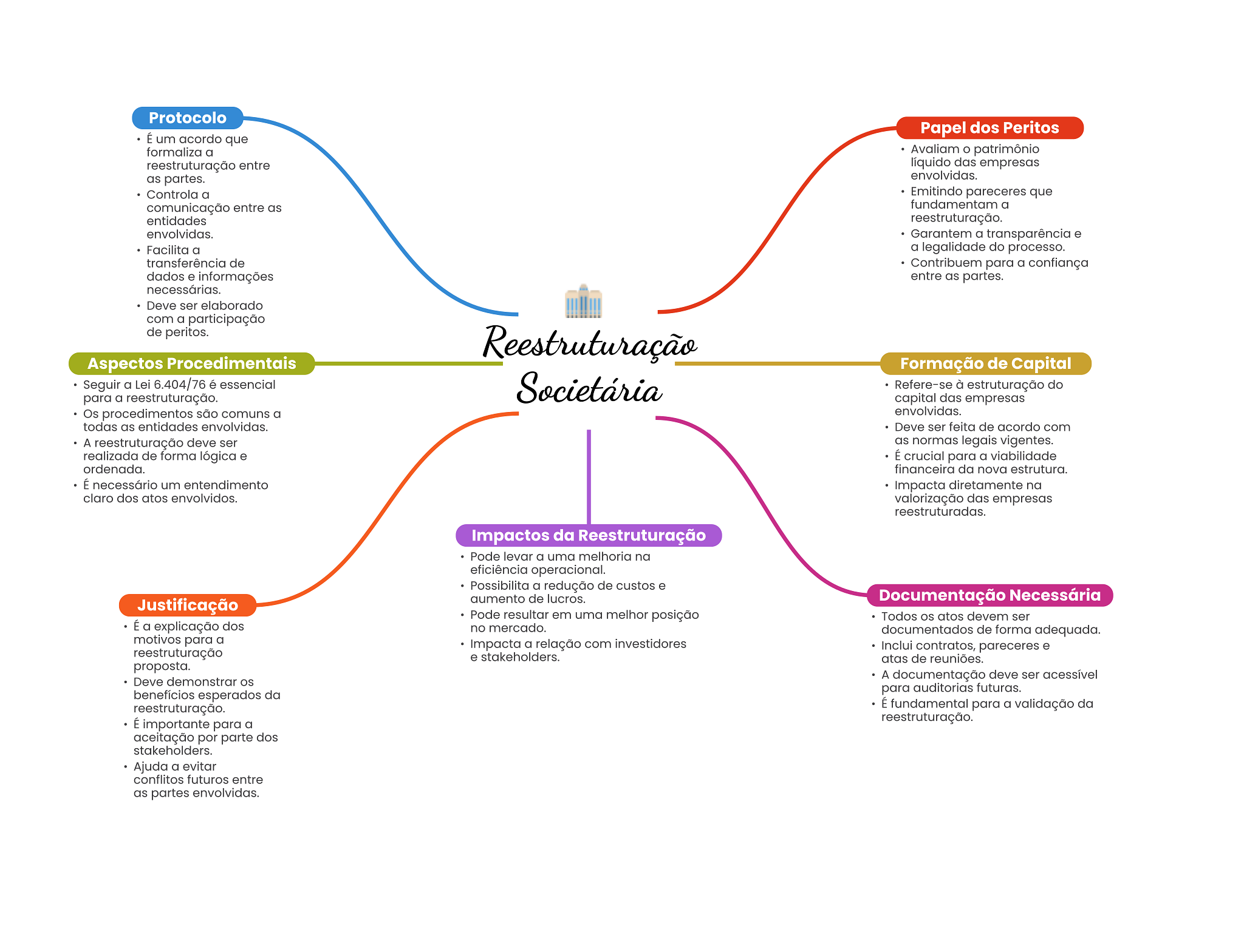 Protocolo Papel dos Peritos É um acordo que formaliza a Avaliam patrimônio reestruturação entre líquido das empresas as partes. envolvidas. Controla a Emitindo pareceres que comunicação entre as fundamentam a entidades reestruturação. envolvidas. Garantem a transparência e Facilita a a legalidade do processo. transferência de Contribuem para a confiança dados e informações entre as partes. necessárias. Deve ser elaborado com a participação de peritos. Reestruturação Aspectos Procedimentais Formação de Capital Seguir a Lei 6.404/76 é essencial Societária Refere-se à estruturação do para a reestruturação. capital das empresas Os procedimentos são comuns a envolvidas. todas as entidades envolvidas. Deve ser feita de acordo com A reestruturação deve ser as normas legais vigentes. realizada de forma lógica e É crucial para a viabilidade ordenada. financeira da nova estrutura. É necessário um entendimento Impacta diretamente na claro dos atos envolvidos. valorização das empresas reestruturadas. Impactos da Reestruturação Pode levar a uma melhoria na eficiência operacional. Possibilita a redução de custos e Justificação aumento de lucros. Documentação Necessária Pode resultar em uma melhor posição Todos atos devem ser É a explicação dos no mercado. documentados de forma adequada. motivos para a Impacta a relação com investidores Inclui contratos, pareceres e reestruturação e stakeholders. atas de reuniões. proposta. Deve demonstrar OS A documentação deve ser acessível benefícios esperados da para auditorias futuras. reestruturação. É fundamental para a validação da É importante para a reestruturação. aceitação por parte dos stakeholders. Ajuda a evitar conflitos futuros entre as partes envolvidas.