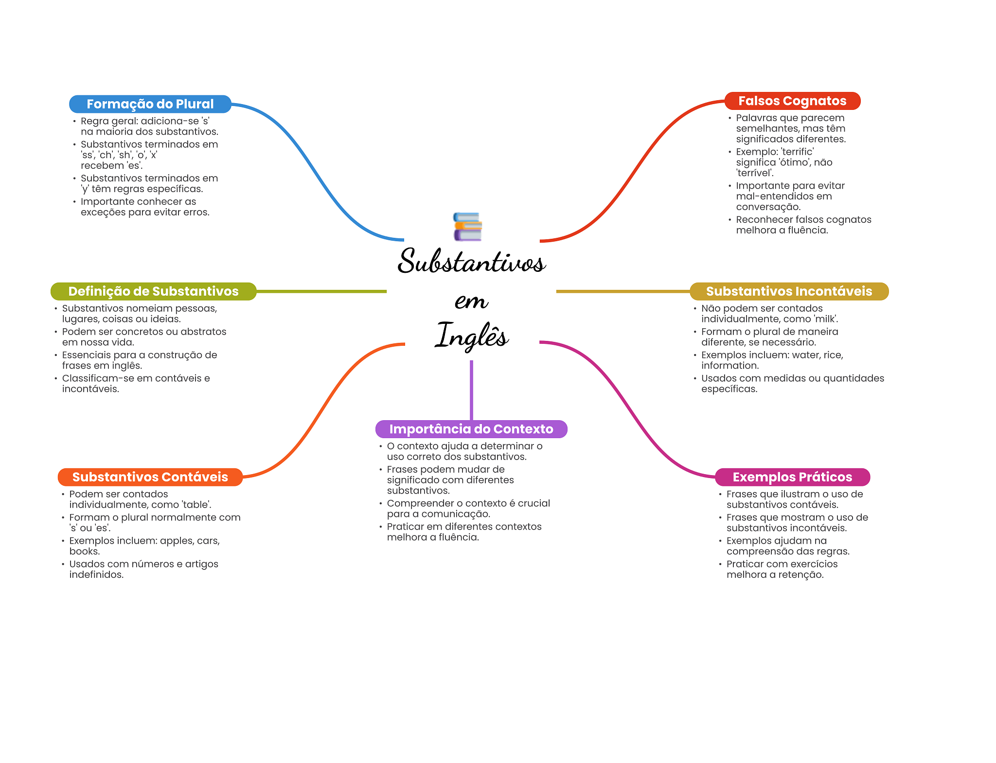 Formação do Plural Falsos Cognatos Regra geral: adiciona-se 's' Palavras que parecem na maioria dos substantivos. semelhantes, mas têm Substantivos terminados em significados diferentes. 'ss', 'ch', 'sh', 'o', 'x' Exemplo: recebem 'es'. significa 'ótimo', não 'terrível'. Substantivos terminados em 'y' têm regras específicas. Importante para evitar mal-entendidos em Importante conhecer as exceções para evitar erros. conversação. Reconhecer falsos cognatos melhora a fluência. Substantivos Definição de Substantivos Substantivos Incontáveis em Substantivos nomeiam pessoas, Não podem ser contados lugares, coisas ou ideias. individualmente, como 'milk'. Podem ser concretos ou abstratos em nossa vida. Inglês Formam O plural de maneira diferente, se necessário. Essenciais para a construção de Exemplos incluem: water, rice, frases em inglês. information. Classificam-se em contáveis e Usados com medidas ou quantidades incontáveis. específicas. Importância do Contexto contexto ajuda a determinar uso correto dos substantivos. Frases podem mudar de Substantivos Contáveis significado com diferentes Exemplos Práticos Podem ser contados substantivos. Frases que ilustram uso de individualmente, como 'table'. Compreender contexto é crucial substantivos contáveis. Formam plural normalmente com para a comunicação. Frases que mostram uso de 's' ou 'es'. Praticar em diferentes contextos substantivos incontáveis. Exemplos incluem: apples, cars, melhora a fluência. Exemplos ajudam na books. compreensão das regras. Usados com números e artigos Praticar com exercícios indefinidos. melhora a retenção.