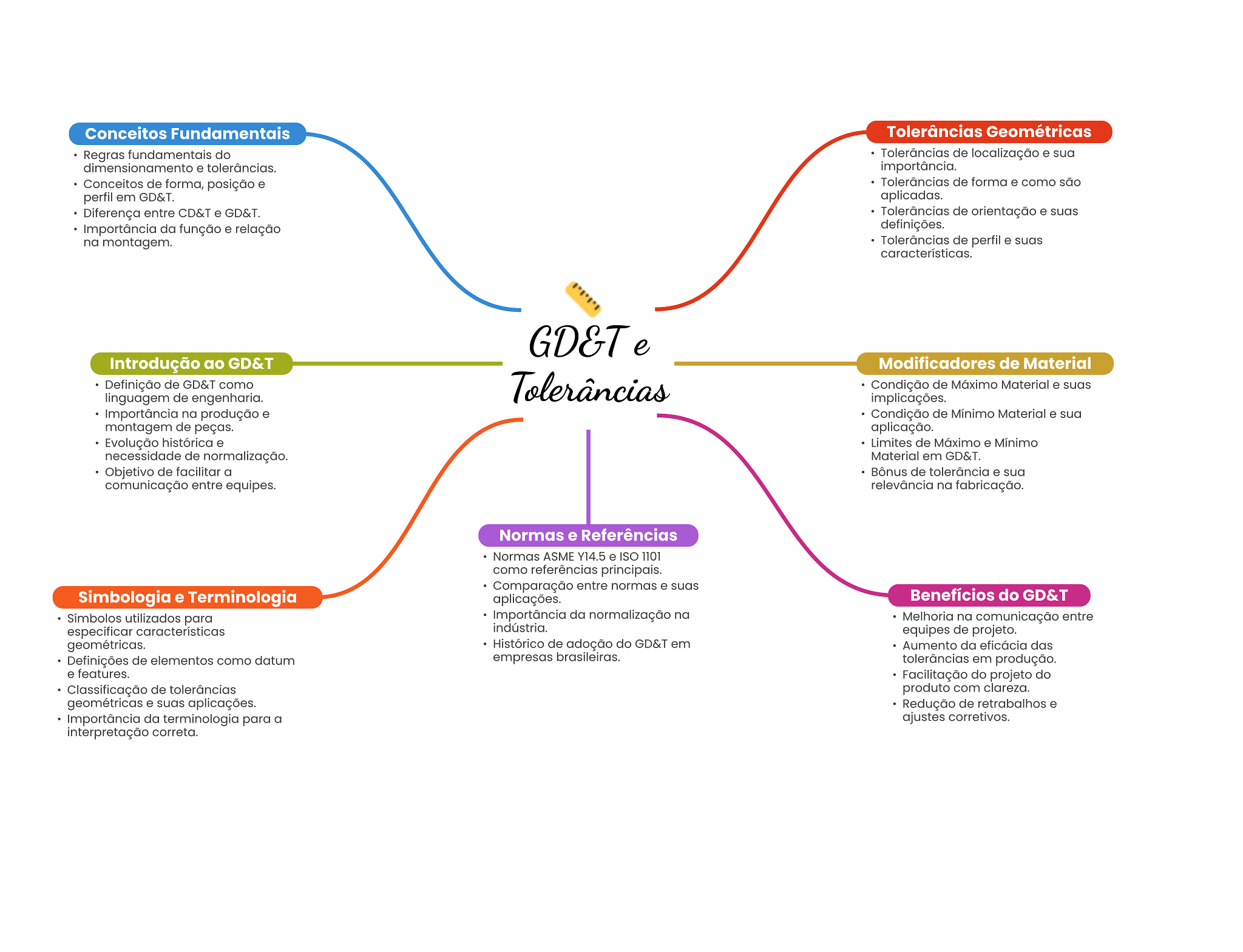 Conceitos Fundamentais Tolerâncias Geométricas Regras fundamentais do Tolerâncias de localização e sua dimensionamento e tolerâncias. importância. Conceitos de forma, posição e Tolerâncias de forma e como são perfil em GD&T. aplicadas. Diferença entre CD&T e GD&T. Tolerâncias de orientação e suas Importância da função e relação definições. na montagem. Tolerâncias de perfil e suas características. GD&Te Introdução ao GD&T Modificadores de Material Definição de GD&T como linguagem de engenharia. Tolerâncias Condição de Máximo Material e suas implicações. Importância na produção e Condição de Mínimo Material e sua montagem de peças. aplicação. Evolução histórica e Limites de Máximo e Mínimo necessidade de normalização. Material em GD&T. Objetivo de facilitar a Bônus de tolerância e sua comunicação entre equipes. relevância na fabricação. Normas e Referências Normas ASME Y14.5 e ISO 1101 como referências principais. Comparação entre normas e suas Simbologia e Terminologia aplicações. Benefícios do GD&T Símbolos utilizados para Importância da normalização na Melhoria na comunicação entre especificar características indústria. equipes de projeto. geométricas. Histórico de adoção do GD&T em Aumento da eficácia das Definições de elementos como datum empresas brasileiras. tolerâncias em produção. e features. Facilitação do projeto do Classificação de tolerâncias produto com clareza. geométricas e suas aplicações. Redução de retrabalhos e Importância da terminologia para a ajustes corretivos. interpretação correta.