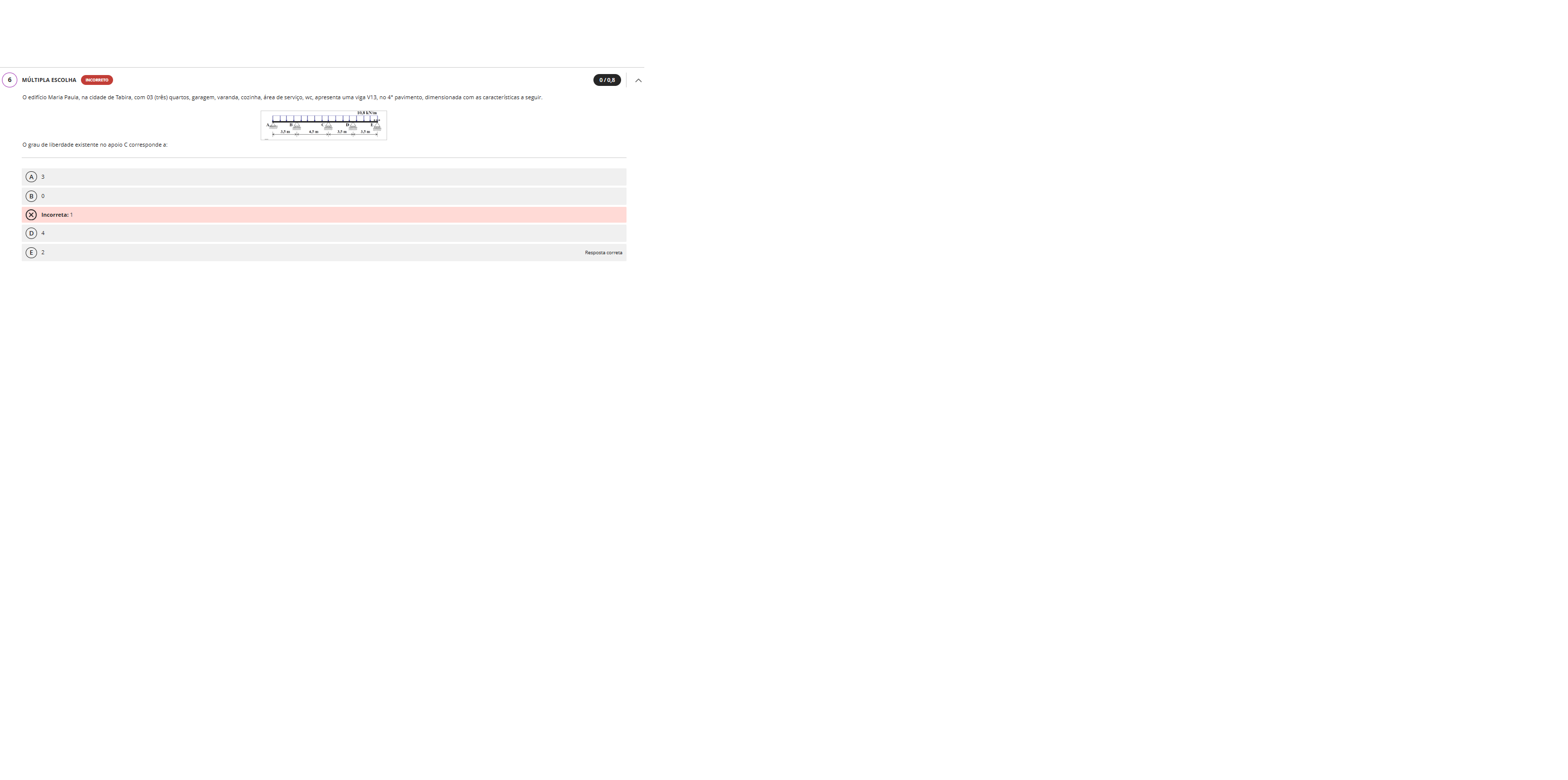 6 ESCOLHA INCORRETO edifício Maria Paula, na cidade de Tabira, com 03 quartos, garagem, varanda, cozinha, de serviço, WC, apresenta uma viga V13, no 4° pavimento, dimensionada com as a seguir. 10.8 B ( D grau de liberdade existente no apoio C corresponde a: A 3 B 0 Incorreta: 1 D 4 E 2 Resposta correta