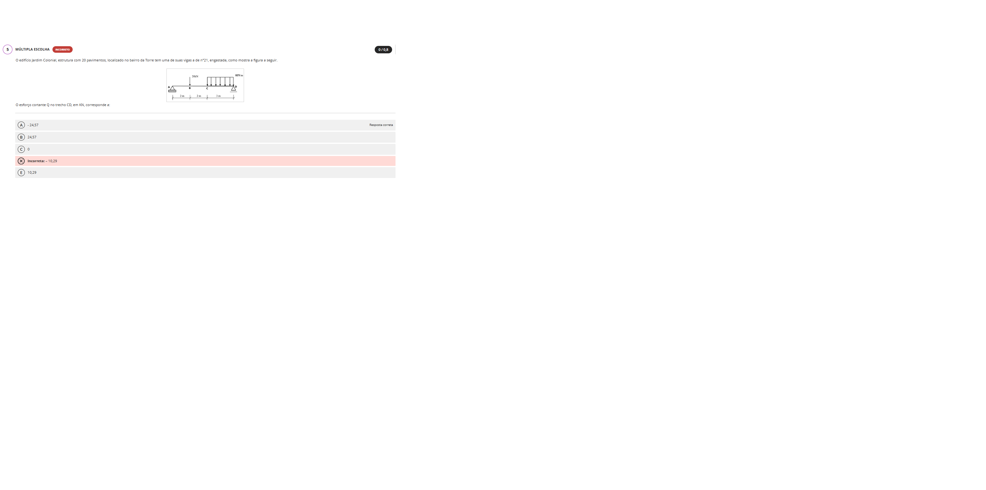 5 ESCOLHA INCORRETO 0/0,8 O edifício Jardim Colonial, estrutura com 20 pavimentos, localizado no bairro da Torre tem uma de suas vigas a de n°21, engastada, como mostra a figura a seguir. 20kN D 8 c 2m 2m O esforço cortante Q no trecho CD, em KN, corresponde a: A 24,57 Resposta correta B 24,57 C 0 Incorreta: 10,29 E 10,29