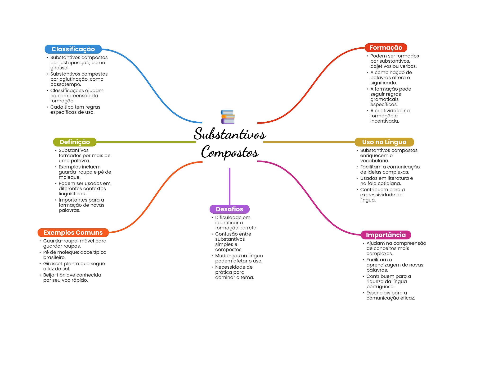 Classificação Formação Substantivos compostos Podem ser formados por justaposição, como por substantivos, girassol. adjetivos ou verbos. Substantivos compostos A combinação de por aglutinação, como palavras altera passatempo. significado. Classificações ajudam A formação pode na compreensão da seguir regras formação. gramaticais Cada tipo tem regras específicas. específicas de uso. A criatividade na formação é incentivada. Substantivos Definição Uso na Língua Substantivos Compostos Substantivos compostos formados por mais de enriquecem O uma palavra. vocabulário. Exemplos incluem Facilitam a comunicação guarda-roupa e pé de de ideias complexas. moleque. Usados em literatura e Podem ser usados em na fala cotidiana. diferentes contextos Contribuem para a linguísticos. expressividade da Importantes para a formação de novas palavras. Desafios Dificuldade em identificar a formação correta. Exemplos Comuns Confusão entre Importância Guarda-roupa: móvel para substantivos guardar roupas. simples e Ajudam na compreensão compostos. de conceitos mais Pé de moleque: doce típico Mudanças na língua complexos. brasileiro. podem afetar O uso. Facilitam a Girassol: planta que segue a luz do sol. Necessidade de aprendizagem de novas prática para palavras. Beija-flor: ave conhecida dominar O tema. Contribuem para a por seu VOO rápido. riqueza da língua portuguesa. Essenciais para a comunicação eficaz.