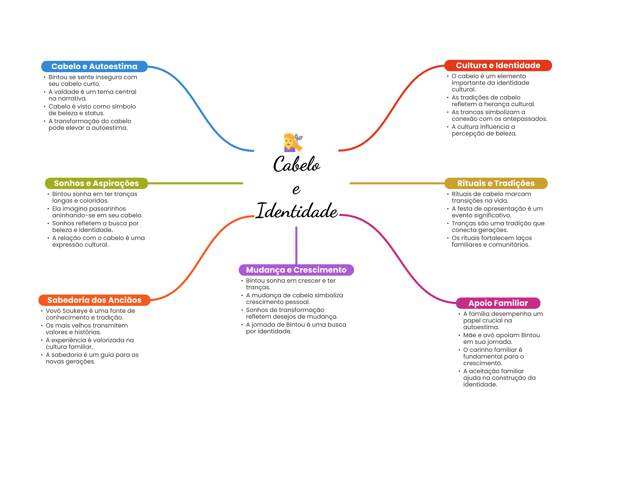 Cabelo e Autoestima Cultura e Identidade Bintou se sente insegura com cabelo é um elemento seu cabelo curto. importante da identidade A vaidade é um tema central cultural. na narrativa. As tradições de cabelo Cabelo é visto como símbolo refletem a herança cultural. de beleza e status. As trancas simbolizam a A transformação do cabelo conexão com antepassados. pode elevar a autoestima. A cultura influencia a percepção de beleza. Cabelo Sonhos e Aspirações Rituais e Tradições e Bintou sonha em ter tranças Rituais de cabelo marcam longas e coloridas. transições na vida. Ela imagina passarinhos Identidade A festa de apresentação é um aninhando-se em seu cabelo. evento significativo. Sonhos refletem a busca por Tranças são uma tradição que beleza e identidade. conecta gerações. A relação com cabelo é uma Os rituais fortalecem laços expressão cultural. familiares e comunitários. Mudança e Crescimento Bintou sonha em crescer e ter tranças. A mudança de cabelo simboliza Sabedoria dos Anciãos crescimento pessoal. Apoio Familiar Vovó Soukeye é uma fonte de Sonhos de transformação conhecimento e tradição. refletem desejos de mudança. A família desempenha um papel crucial na Os mais velhos transmitem A jornada de Bintou é uma busca autoestima. valores e histórias. por identidade. Mãe e avó apoiam Bintou A experiência é valorizada na em sua jornada. cultura familiar. O carinho familiar é A sabedoria é um guia para as fundamental para novas gerações. crescimento. A aceitação familiar ajuda na construção da identidade.