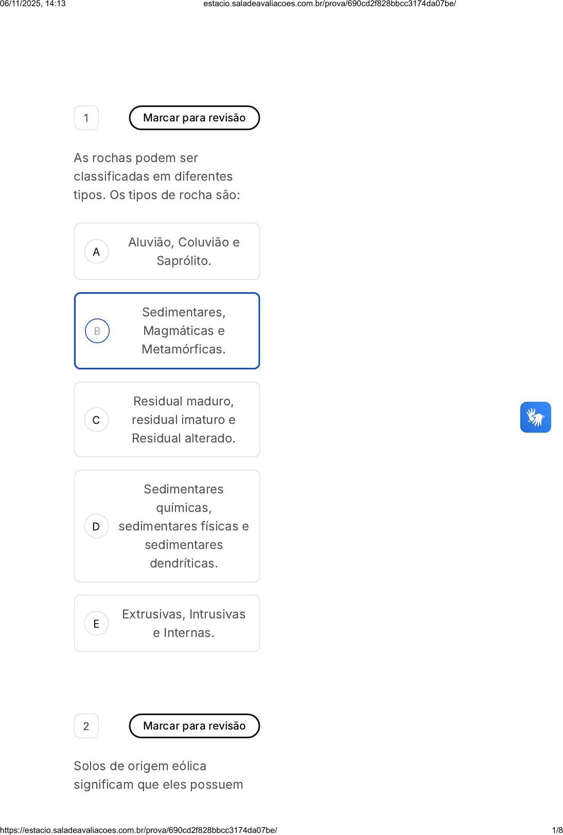 A B C D E 1 Marcar para revisão As rochas podem ser classificadas em diferentes tipos. Os tipos de rocha são: Aluvião, Coluvião e Saprólito. Sedimentares, Magmáticas e Metamórficas. Residual maduro, residual imaturo e Residual alterado. Sedimentares químicas, sedimentares físicas e sedimentares dendríticas. Extrusivas, Intrusivas e Internas. 2 Marcar para revisão Solos de origem eólica significam que eles possuem 06/11/2025, 14:13 estacio.saladeavaliacoes.com.br/prova/690cd2f828bbcc3174da07be/ https://estacio.saladeavaliacoes.com.br/prova/690cd2f828bbcc3174da07be/ 1/8 A B C D E A B C como agente transportador o (a): Gravidade. Água fluvial. Água pluvial. Gelo. Vento. 3 Marcar para revisão Fator decorrente da atividade humana, que não contribui para o surgimento de movimentos de massa e de desastres: Mudança dos regimes de drenagem Eliminação da cobertura vegetal Taludes mal dimensionados 06/11/2025, 14:13 estacio.saladeavaliacoes.com.br/prova/690cd2f828bbcc3174da07be/ https://estacio.saladeavaliacoes.com.br/prova/690cd2f828bbcc3174da07be/ 2/8 D E A B C D E Ocupação desordenada de encostas Uso ordenado e ocupação do solo. 4 Marcar para revisão São obras de estabilidade dos taludes com estrutura de contenção: Retaludamento. Muro de arrimo. Proteção com grama armada. Proteção com geomanta. Aterros compactados. 5 Marcar para revisão Entre os diferentes tipos de movimento de rocha, temos o 06/11/2025, 14:13 estacio.saladeavaliacoes.com.br/prova/690cd2f828bbcc3174da07be/ https://estacio.saladeavaliacoes.com.br/prova/690cd2f828bbcc3174da07be/ 3/8 A B C D E desplacamento, que consiste em: Movimento de blocos rochosos ao longo de superfícies inclinadas. Queda, relativamente livre, de reduzidas massas de fragmentos terrosos ou rochosos, em movimentos de pequena magnitude. Desprendimento de lascas ou placas de rocha que se formam a partir de uma estrutura rochosa ou talude. Uma ação de queda livre a partir de uma elevação, com ausência de superfície de movimentação. De terra, de água e de pó. Movimentos de blocos rochosos ao longo de encostas que geralmente ocorrem devido aos descalçamentos. 06/11/2025, 14:13 estacio.saladeavaliacoes.com.br/prova/690cd2f828bbcc3174da07be/ https://estacio.saladeavaliacoes.com.br/prova/690cd2f828bbcc3174da07be/ 4/8 A B C D E A B 6 Marcar para revisão A proteção superficial, natural ou artificial, possui um papel importante na estabilização. Para solos áridos é recomendado o revestimento com: Geocélula com solo compactado Vegetação arbórea Tela argamassada Alvenaria armada Emulsão asfáltica 7 Marcar para revisão Ao produto que pode ser utilizado para revestir um talude, que possui como um de seus componentes o asfalto, dá-se o nome de: Gasóleo Alvenaria armada 06/11/2025, 14:13 estacio.saladeavaliacoes.com.br/prova/690cd2f828bbcc3174da07be/ https://estacio.saladeavaliacoes.com.br/prova/690cd2f828bbcc3174da07be/ 5/8 C D E A B C D E Asfalto diluído Solo-pneu Geocélula 8 Marcar para revisão A operação de terraplenagem importantíssima, que é necessária em um retaludamento, após cortar o excesso de material que jaz sobre uma inclinação definida em projeto, aterrando-o em seguida, se denomina: Corte Aterro Retaludamento Compactação Enleivamento 06/11/2025, 14:13 estacio.saladeavaliacoes.com.br/prova/690cd2f828bbcc3174da07be/ https://estacio.saladeavaliacoes.com.br/prova/690cd2f828bbcc3174da07be/ 6/8 A B C D E 9 Marcar para revisão Valetas são utilizadas para a drenagem superficial em um talude. Sobre as valetas, é correto afirmar: Valetas só podem possuir cobertura de grama. Valetas são sinônimos de sarjetas. Podem assumir a seção circular. Revestimentos de concreto simples são destinados a valetas sobre terrenos impermeáveis, como os argilosos. Podem assumir forma retangular ou trapezoidal. 10 Marcar para revisão Para estabilização e contenção de taludes, diversos dispositivos podem ser empregados. 00 hora : 32 min : 41 seg Ocultar Questão 10 de 10 Respondidas (10) Em branco (0) Finalizar prova 1 2 3 4 5 6 7 8 9 10 SM1 Geotecnia 06/11/2025, 14:13 estacio.saladeavaliacoes.com.br/prova/690cd2f828bbcc3174da07be/ https://estacio.saladeavaliacoes.com.br/prova/690cd2f828bbcc3174da07be/ 7/8 A B C D E Na figura abaixo, o dispositivo marcado é um (uma): Fonte: MORALES, Paulo Roberto Dias. Curso de Drenagem Urbana e Meio Ambiente. Instituto Militar de Engenharia. (2003, pág.34, adaptado) Valeta Tirante Sarjeta Dreno Revestimento vegetal 06/11/2025, 14:13 estacio.saladeavaliacoes.com.br/prova/690cd2f828bbcc3174da07be/ https://estacio.saladeavaliacoes.com.br/prova/690cd2f828bbcc3174da07be/ 8/8