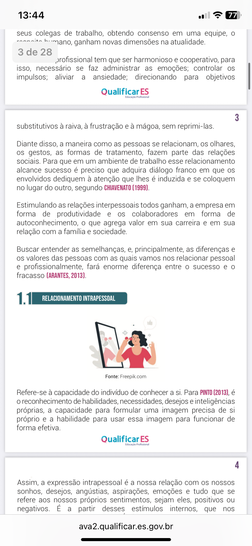 13:44 77 seus colegas de trabalho, obtendo consenso em uma equipe, humano, ganham novas dimensões na atualidade. 3 de 28 profissional tem que ser harmonioso e cooperativo, para isso, necessário se faz administrar as emoções; controlar os impulsos; aliviar a ansiedade; direcionando para objetivos Qualificar ES Educação Profissional 3 substitutivos à raiva, à frustração e à mágoa, sem reprimi-las. Diante disso, a maneira como as pessoas se relacionam, olhares, gestos, as formas de tratamento, fazem parte das relações sociais. Para que em um ambiente de trabalho esse relacionamento alcance sucesso é preciso que adquira diálogo franco em que os envolvidos dediquem à atenção que lhes é induzida e se coloquem no lugar do outro, segundo CHIAVENATO (1999). Estimulando as relações interpessoais todos ganham, a empresa em forma de produtividade e colaboradores em forma de autoconhecimento, que agrega valor em sua carreira e em sua relação com a família e sociedade. Buscar entender as semelhanças, e, principalmente, as diferenças e valores das pessoas com as quais vamos nos relacionar pessoal e profissionalmente, fará enorme diferença entre sucesso e fracasso (ARANTES, 2013). 1.1 RELACIONAMENTO INTRAPESSOAL Fonte: Freepik.com Refere-se à capacidade do indivíduo de conhecer a si. Para PINTO (2013), é reconhecimento de habilidades, necessidades, desejos e inteligências próprias, a capacidade para formular uma imagem precisa de si próprio e a habilidade para usar essa imagem para funcionar de forma efetiva. Qualificar ES Educação Profissional 4 Assim, a expressão intrapessoal é a nossa relação com os nossos sonhos, desejos, angústias, aspirações, emoções e tudo que se refere aos nossos próprios sentimentos, sejam eles, positivos ou negativos. É a partir desses estímulos internos, que nos ava2.qualificar.es.gov.br