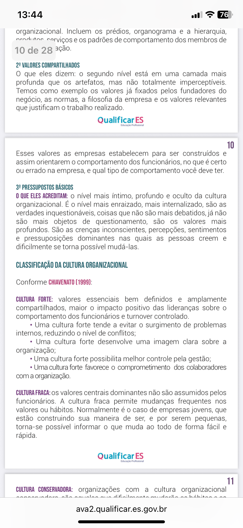 13:44 76 organizacional. Incluem os prédios, organograma e a hierarquia, e padrões de comportamento dos membros de 10 de 28 ação. VALORES COMPARTILHADOS 0 que eles dizem: segundo nível está em uma camada mais profunda que artefatos, mas não totalmente imperceptíveis. Temos como exemplo valores já fixados pelos fundadores do negócio, as normas, a filosofia da empresa e OS valores relevantes que justificam trabalho realizado. Qualificar ES Educação Profissional 10 Esses valores as empresas estabelecem para ser construídos e assim orientarem comportamento dos funcionários, no que é certo ou errado na empresa, e qual tipo de comportamento você deve ter. PRESSUPOSTOS BÁSICOS QUE ELES ACREDITAM: nível mais íntimo, profundo e oculto da cultura organizacional. É nível mais enraizado, mais internalizado, são as verdades inquestionáveis, coisas que não são mais debatidos, já não são mais objetos de questionamento, são valores mais profundos. São as crenças inconscientes, percepções, sentimentos e pressuposições dominantes nas quais as pessoas creem e dificilmente se torna possível mudá-las. CLASSIFICAÇÃO DA CULTURA ORGANIZACIONAL Conforme CHIAVENATO (1999): CULTURA FORTE: valores essenciais bem definidos e amplamente compartilhados, maior impacto positivo das lideranças sobre comportamento dos funcionários e turnover controlado. Uma cultura forte tende a evitar surgimento de problemas internos, reduzindo nível de conflitos; Uma cultura forte desenvolve uma imagem clara sobre a organização; Uma cultura forte possibilita melhor controle pela gestão; Uma cultura forte favorece comprometimento dos colaboradores com a organização. CULTURA FRACA: valores centrais dominantes não são assumidos pelos funcionários. A cultura fraca permite mudanças frequentes nos valores ou hábitos. Normalmente é caso de empresas jovens, que estão construindo sua maneira de ser, e por serem pequenas, torna-se possível informar que muda ao todo de forma fácil e rápida. Qualificar ES Educação Profissional 11 CULTURA CONSERVADORA: organizações com a cultura organizacional ava2.qualificar.es.gov.br