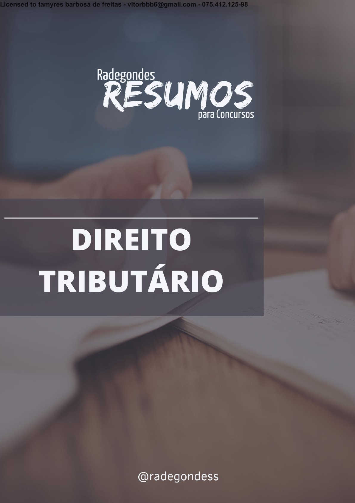 [Escolha a data] [Ano] Licensed to tamyres barbosa de freitas - vitorbbb6@gmail.com - 075.412.125-98 RESUMO 09 @RADEGONDESS 1 SUMÁRIO Suspensão do Crédito Tributário ........................................................................................................ 02 Moratória ........................................................................................................................................... 03 Parcelamento ..................................................................................................................................... 05 Reclamações e Recursos no âmbito do Processo Tributário Administrativo ..................................... 07 Concessão de Medida Liminar em Mandado de Segurança ou em outras Ações .............................. 07 Depósito do Montante Integral .......................................................................................................... 08 Suspensão x Extinção x Exclusão do Crédito Tributário .............................................................. 09 Jurisprudência .................................................................................................................................... 10 Considerações Finais ........................................................................................................................ 12 Caderno de Questões do TEC ............................................................................................................. 13 CONSIDERAÇÕES INICIAIS Pessoal, hoje daremos continuidade ao estudo do título “III” do livro segundo do Código Tributário Nacional (CTN). Essa parte do CTN trata do assunto “CRÉDITO TRIBUTÁRIO” e se subdivide em 6 capítulos, começando no art. 113 e terminando no art. 138. Capítulo I – Disposições Gerais (art. 139 ao art. 141) Capítulo II – Constituição do Crédito Tributário (art. 142 ao art. 150) Capítulo III – Suspensão do Crédito Tributário (art. 151 ao art. 155-A) Capítulo IV – Extinção do Crédito Tributário (art. 156 ao art. 174) Capítulo V – Exclusão do Crédito Tributário (art. 175 ao 182) Capítulo VI – Garantias e Privilégios do Crédito (art. 183 ao art. 193) Neste material abordaremos o capítulo III, SUSPENSÃO DO CRÉDITO TIBUTÁRIO, deixando os demais capítulos para os próximos PDF’s. Sugestão de estudo: Estude com calma este PDF. Leia-o devagar, mas não se preocupe em memorizar os detalhes, pois eles serão memorizados com a repetição do estudo desse conteúdo. Bons estudos! Licensed to tamyres barbosa de freitas - vitorbbb6@gmail.com - 075.412.125-98 RESUMO 09 @RADEGONDESS 2 SUSPENSÃO DO CRÉDITO TRIBUTÁRIO - CONTEXTUALIZAÇÃO A ideia principal sobre o tema “SUSPENSÃO DO CRÉDITO TRIBUTÁRIO” é fazer com que o Estado, por meio da sua Administração Tributária (Fazenda), fique impedido temporariamente de efetuar a cobrança dos tributos, ou seja, a exigibilidade do crédito fica suspensa. Agora vamos para o Código Tributário Nacional (CTN), pois a esmagadora maioria das questões são retiradas dele. SUSPENSÃO DO CRÉDITO TRIBUTÁRIO Art. 151. Suspendem a exigibilidade do crédito tributário: I - moratória; II - o depósito do seu montante integral; III - as reclamações e os recursos, nos termos das leis reguladoras do processo tributário administrativo; IV - a concessão de medida liminar em mandado de segurança. V – a concessão de medida liminar ou de tutela antecipada, em outras espécies de ação judicial; VI – o parcelamento. Parágrafo único. O disposto neste artigo não dispensa o cumprimento das obrigações assessórias dependentes da obrigação principal cujo crédito seja suspenso, ou dela consequentes. MNEMÔNICO: DEMORE a LIMPAR SUSPENDEM O CRÉDITO TRIBUTÁRIO DE Depósito do montante integral MO Moratória RE Reclamações e Recursos LIM Liminar ou Tutela Antecipada PAR Parcelamento Licensed to tamyres barbosa de freitas - vitorbbb6@gmail.com - 075.412.125-98 RESUMO 09 @RADEGONDESS 3 ATENÇÃO: Cabe liminar em Mandado de Segurança (MS), mas não cabe tutela antecipada (antecipação dos efeitos) em MS, apenas em outras espécies de ação judicial. MORATÓRIA Art. 152. A moratória somente pode ser concedida: I - em caráter geral: a) pela pessoa jurídica de direito público competente para instituir o tributo a que se refira; b) pela União, quanto a tributos de competência dos Estados, do Distrito Federal ou dos Municípios, quando simultaneamente concedida quanto aos tributos de competência federal e às obrigações de direito privado; II - em caráter individual, por despacho da autoridade administrativa, desde que autorizada por lei nas condições do inciso anterior. Parágrafo único. A lei concessiva de moratória pode circunscrever expressamente a sua aplicabilidade à determinada região do território da pessoa jurídica de direito público que a expedir, ou a determinada classe ou categoria de sujeitos passivos. O QUE É MORATÓRIA? É o aumento do prazo para pagamento de um tributo vencido ou por vencer. A moratória somente pode ser concedida Em caráter GERAL Pela pessoa jurídica de direito público competente para instituir o tributo Pela União, quanto a tributos de competência dos Estados, do DF ou dos Municípios, quando simultaneamente concedida quanto aos tributos de competência federal e às obrigações de direito privado Em caráter INDIVIDUAL Por despacho da autoridade administrativa, desde que autorizada por lei Licensed to tamyres barbosa de freitas - vitorbbb6@gmail.com - 075.412.125-98 RESUMO 09 @RADEGONDESS 4 EXEMPLO: No final do ano de 2021, o Município de Petrópolis foi gravemente afetado por fortes chuvas que causaram grandes estragos na localidade. Em razão disso, a Assembleia Legislativa do Estado do RJ, em que está localizado o Município de Petrópolis, aprovou lei estadual ordinária concedendo moratória quanto ao pagamento do Imposto Predi