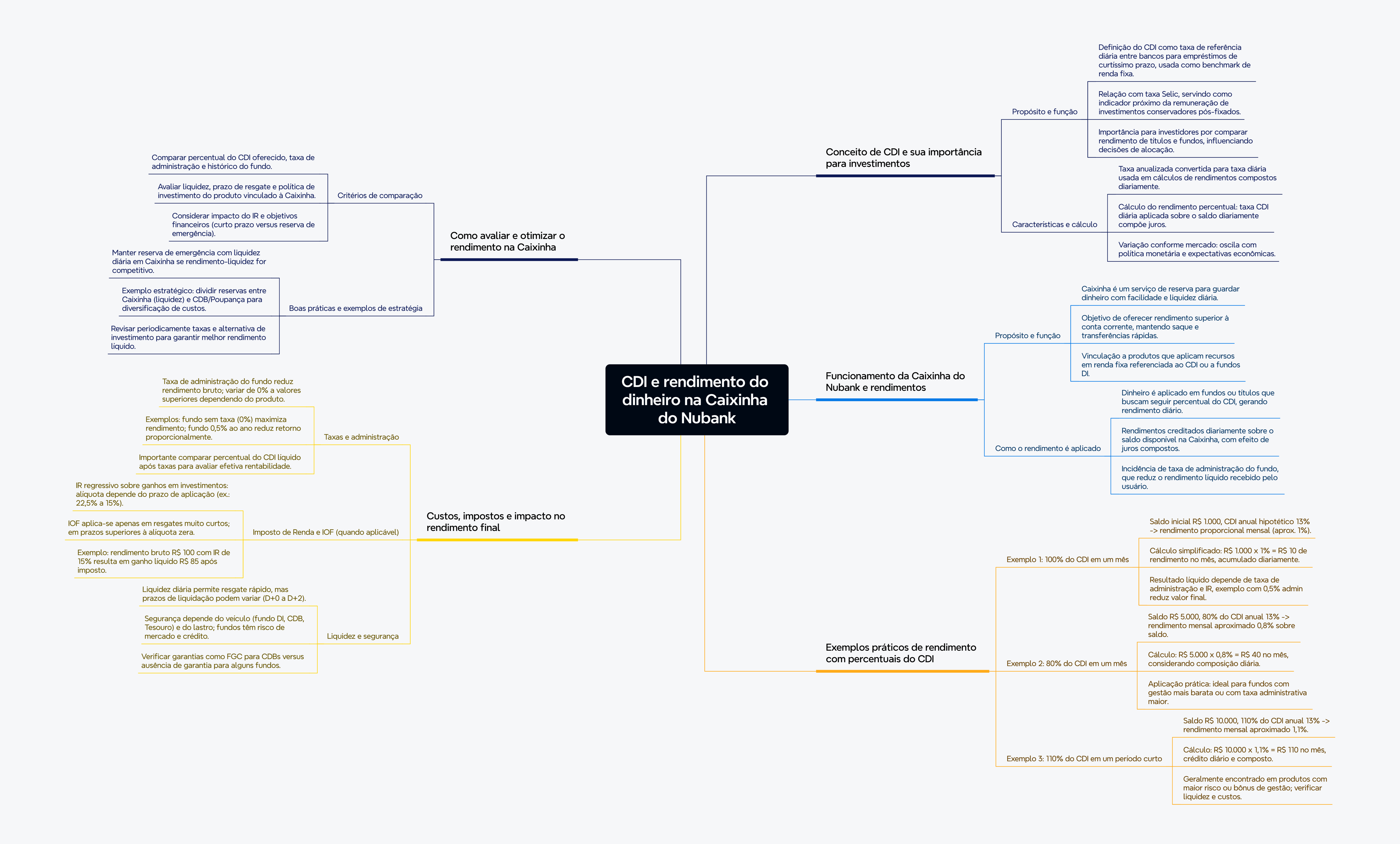 CDI e rendimento do dinheiro na Caixinha do Nubank Conceito de CDI e sua importância para investimentos Propósito e função Definição do CDI como taxa de referência diária entre bancos para empréstimos de curtíssimo prazo, usada como benchmark de renda fixa. Relação com taxa Selic, servindo como indicador próximo da remuneração de investimentos conservadores pós-fixados. Importância para investidores por comparar rendimento de títulos e fundos, influenciando decisões de alocação. Características e cálculo Taxa anualizada convertida para taxa diária usada em cálculos de rendimentos compostos diariamente. Cálculo do rendimento percentual: taxa CDI diária aplicada sobre o saldo diariamente compõe juros. Variação conforme mercado: oscila com política monetária e expectativas econômicas. Funcionamento da Caixinha do Nubank e rendimentos Propósito e função Caixinha é um serviço de reserva para guardar dinheiro com facilidade e liquidez diária. Objetivo de oferecer rendimento superior à conta corrente, mantendo saque e transferências rápidas. Vinculação a produtos que aplicam recursos em renda fixa referenciada ao CDI ou a fundos DI. Como o rendimento é aplicado Dinheiro é aplicado em fundos ou títulos que buscam seguir percentual do CDI, gerando rendimento diário. Rendimentos creditados diariamente sobre o saldo disponível na Caixinha, com efeito de juros compostos. Incidência de taxa de administração do fundo, que reduz o rendimento líquido recebido pelo usuário. Exemplos práticos de rendimento com percentuais do CDI Exemplo 1: 100% do CDI em um mês Saldo inicial R$ 1.000, CDI anual hipotético 13% -> rendimento proporcional mensal (aprox. 1%). Cálculo simplificado: R$ 1.000 x 1% = R$ 10 de rendimento no mês, acumulado diariamente. Resultado líquido depende de taxa de administração e IR, exemplo com 0,5% admin reduz valor final. Exemplo 2: 80% do CDI em um mês Saldo R$ 5.000, 80% do CDI anual 13% -> rendimento mensal aproximado 0,8% sobre saldo. Cálculo: R$ 5.000 x 0,8% = R$ 40 no mês, considerando composição diária. Aplicação prática: ideal para fundos com gestão mais barata ou com taxa administrativa maior. Exemplo 3: 110% do CDI em um período curto Saldo R$ 10.000, 110% do CDI anual 13% -> rendimento mensal aproximado 1,1%. Cálculo: R$ 10.000 x 1,1% = R$ 110 no mês, crédito diário e composto. Geralmente encontrado em produtos com maior risco ou bônus de gestão; verificar liquidez e custos. Custos, impostos e impacto no rendimento final Taxas e administração Taxa de administração do fundo reduz rendimento bruto; variar de 0% a valores superiores dependendo do produto. Exemplos: fundo sem taxa (0%) maximiza rendimento; fundo 0,5% ao ano reduz retorno proporcionalmente. Importante comparar percentual do CDI líquido após taxas para avaliar efetiva rentabilidade. Imposto de Renda e IOF (quando aplicável) IR regressivo sobre ganhos em investimentos: alíquota depende do prazo de aplicação (ex.: 22,5% a 15%). IOF aplica-se apenas em resgates muito curtos; em prazos superiores à alíquota zera. Exemplo: rendimento bruto R$ 100 com IR de 15% resulta em ganho líquido R$ 85 após imposto. Liquidez e segurança Liquidez diária permite resgate rápido, mas prazos de liquidação podem variar (D+0 a D+2). Segurança depende do veículo (fundo DI, CDB, Tesouro) e do lastro; fundos têm risco de mercado e crédito. Verificar garantias como FGC para CDBs versus ausência de garantia para alguns fundos. Como avaliar e otimizar o rendimento na Caixinha Critérios de comparação Comparar percentual do CDI oferecido, taxa de administração e histórico do fundo. Avaliar liquidez, prazo de resgate e política de investimento do produto vinculado à Caixinha. Considerar impacto do IR e objetivos financeiros (curto prazo versus reserva de emergência). Boas práticas e exemplos de estratégia Manter reserva de emergência com liquidez diária em Caixinha se rendimento-liquidez for competitivo. Exemplo estratégico: dividir reservas entre Caixinha (liquidez) e CDB/Poupança para diversificação de custos. Revisar periodicamente taxas e alternativa de investimento para garantir melhor rendimento líquido.