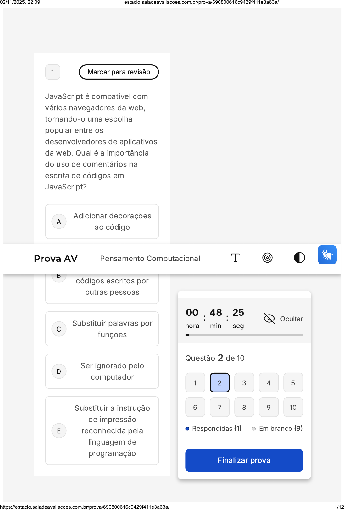 A B C D E 1 Marcar para revisão JavaScript é compatível com vários navegadores da web, tornando-o uma escolha popular entre os desenvolvedores de aplicativos da web. Qual é a importância do uso de comentários na escrita de códigos em JavaScript? Adicionar decorações ao código Ajudar o programador a compreender códigos escritos por outras pessoas Substituir palavras por funções Ser ignorado pelo computador Substituir a instrução de impressão reconhecida pela linguagem de programação 00 hora : 48 min : 25 seg Ocultar Questão 2 de 10 Respondidas (1) Em branco (9) Finalizar prova 1 2 3 4 5 6 7 8 9 10 Prova AV Pensamento Computacional 02/11/2025, 22:09 estacio.saladeavaliacoes.com.br/prova/690800616c9429f411e3a63a/ https://estacio.saladeavaliacoes.com.br/prova/690800616c9429f411e3a63a/ 1/12 A B C D E 2 Marcar para revisão O Pensamento Computacional apresenta alguns pilares fundamentais. Qual a definição de Decomposição, um dos pilares do Pensamento Computacional? A capacidade de criar soluções utilizando uma única linguagem de programação. A habilidade de decompor um problema em partes menores e mais simples. A técnica para otimizar o tempo de execução de um algoritmo. A capacidade de entender e manipular circuitos eletrônicos. A habilidade de criar interfaces gráficas para softwares. 3 Marcar para revisão 02/11/2025, 22:09 estacio.saladeavaliacoes.com.br/prova/690800616c9429f411e3a63a/ https://estacio.saladeavaliacoes.com.br/prova/690800616c9429f411e3a63a/ 2/12 A B C O pensamento lógico desempenha um papel fundamental em diversos aspectos da vida, incluindo tomada de decisões, resolução de problemas, raciocínio crítico e compreensão de conceitos complexos. É uma habilidade cognitiva essencial que permite analisar informações de forma estruturada, identificar padrões, estabelecer relações causais e chegar a conclusões fundamentadas. Em programação, qual das seguintes afirmações define corretamente um algoritmo? Um conjunto de instruções escritas sem um padrão claro. Um dispositivo de hardware que executa operações matemáticas complexas. Um modelo matemático utilizado para representar problemas do mundo real. 02/11/2025, 22:09 estacio.saladeavaliacoes.com.br/prova/690800616c9429f411e3a63a/ https://estacio.saladeavaliacoes.com.br/prova/690800616c9429f411e3a63a/ 3/12 D E A B C Um sistema automatizado que realiza tarefas sem intervenção humana. Uma sequência de passos lógicos e bem definidos para resolver um problema. 4 Marcar para revisão O pensamento computacional está intimamente ligado à interconexão de seus pilares para a resolução de problemas complexos. Assinale a alternativa que apresenta a(s) área(s) na(s) qual(is) o pensamento computacional pode ser aplicado: I. Ciências Exatas. II. Ciências Sociais. III. Ciências Jurídicas. IV. Ciências Biológicas. I e II, apenas. I e IV, apenas. I, II e IV, apenas. 02/11/2025, 22:09 estacio.saladeavaliacoes.com.br/prova/690800616c9429f411e3a63a/ https://estacio.saladeavaliacoes.com.br/prova/690800616c9429f411e3a63a/ 4/12 D E A B C II, III e IV, apenas. I, II, III e IV. 5 Marcar para revisão A Internet é uma rede global de computadores interconectados que permite a comunicação e o compartilhamento de informações em escala mundial. Ela desempenha um papel fundamental na vida moderna, afetando quase todos os aspectos da sociedade, da comunicação à educação, ao comércio e à cultura. Qual foi o projeto pioneiro que deu origem à internet, permitindo a comunicação entre computadores distantes geograficamente? Projeto Starlink. ARPANET. LAN Houses. 02/11/2025, 22:09 estacio.saladeavaliacoes.com.br/prova/690800616c9429f411e3a63a/ https://estacio.saladeavaliacoes.com.br/prova/690800616c9429f411e3a63a/ 5/12 D E A B C IRC. World Wide Web. 6 Marcar para revisão Em termos de comunicação visual, a cor é uma ferramenta poderosa para atrair a atenção, transmitir mensagens e criar identidade visual. As cores podem evocar diferentes emoções e sentimentos, como tranquilidade, felicidade, tristeza, raiva, entre outros. Por exemplo, o vermelho é frequentemente associado a paixão, energia e excitação, enquanto o azul é visto como uma cor mais calma e serena. No padrão RGB as cores variam numericamente de: 0 a 255. 0 a 128. 0 a 64. 02/11/2025, 22:09 estacio.saladeavaliacoes.com.br/prova/690800616c9429f411e3a63a/ https://estacio.saladeavaliacoes.com.br/prova/690800616c9429f411e3a63a/ 6/12 D E 0 a 32. 0 a 16. 7 Marcar para revisão (IBFC/2019 - Adaptada) O sistema de cor RGB (vermelho, verde e azul, na sigla em inglês) é utilizado para descrever cores luminosas. No século 17, o físico Isaac Newton realizou um experimento para comprovar a dispersão da luz, utilizando um prisma de vidro e a luz do sol. Com isto, foi possível observar um arco-íris. Sobre esse fenômeno, assinale a alternativa correta. 02/11/2025, 22:09 estacio.saladeavaliacoes.com.br/prova/690800616c9429f411e3a63a/ https://estacio.saladeavaliacoes.com.br/prova/690800616c9429f411e3a63a/ 7/12 A B C D E A luz proveniente do sol é a ausência de outras cores. Por isso ela é branca. O experimento de Isaac Newton provou que as cores da luz e os pigmentos têm o mesmo sistema de cores. A dispersão da luz branca prova que ela é a junção de todas as cores. A junção de todos os pigmentos no sistema CMYK (ciano, magenta, amarelo e preto, na sigla em inglês) resulta na cor branca. Em computação as cores são divididas em VGA. 8 Marcar para revisão Sobre algoritmos e códigos de computador, analise as afirmações abaixo, e marque a opção correta. 02/11/2025, 22:09 estacio.saladeavaliacoes.com.br/prova/690800616c9429f411e3a63a/ https://estacio.saladeavaliacoes.com.br/prova/690800616c9429f411e3a63a/ 8/12 A B I - Códigos de computadores e algoritmos são a mesma coisa. II - Códigos são sequências de passos simples e bem projetados para realizar uma tarefa ou resolver um problema. Algoritmos são i