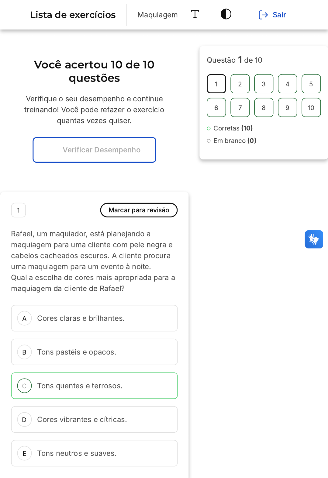 Você acertou 10 de 10 questões Verifique o seu desempenho e continue treinando! Você pode refazer o exercício quantas vezes quiser. Verificar Desempenho A B C D E 1 Marcar para revisão Rafael, um maquiador, está planejando a maquiagem para uma cliente com pele negra e cabelos cacheados escuros. A cliente procura uma maquiagem para um evento à noite. Qual a escolha de cores mais apropriada para a maquiagem da cliente de Rafael? Cores claras e brilhantes. Tons pastéis e opacos. Tons quentes e terrosos. Cores vibrantes e cítricas. Tons neutros e suaves. Questão 1 de 10 Corretas (10) Em branco (0) 1 2 3 4 5 6 7 8 9 10 Lista de exercícios Maquiagem Sair A B C Resposta correta Parabéns, você selecionou a alternativa correta. Confira o gabarito comentado! Gabarito Comentado Usar tons quentes de maquiagem para pele escura, com cabelos escuros e olhos escuros (amarelo, laranja, marrom e vermelho). 2 Marcar para revisão Pensando nas orientações sobre biossegurança, marque a resposta que corresponde aos cuidados que a cliente deverá observar quando for ser atendida por um profissional. Se o maquiador está bem-vestido. Se os objetos estão limpos e esterilizados e se os produtos químicos têm procedência e estão dentro do prazo de validade. Se o maquiador é pontual e usa uniforme. D E Se o profissional é atencioso e educado. Nenhuma das alternativas. Resposta correta Parabéns, você selecionou a alternativa correta. Confira o gabarito comentado! Gabarito Comentado A alternativa correta é a B, que menciona a importância de verificar se os objetos estão limpos e esterilizados e se os produtos químicos têm procedência e estão dentro do prazo de validade. Isso é crucial para a biossegurança, pois a limpeza e esterilização dos objetos utilizados evitam a transmissão de doenças e infecções. Além disso, a procedência e a validade dos produtos químicos são importantes para garantir a eficácia dos mesmos e evitar possíveis reações adversas. 3 Marcar para revisão Ana, uma maquiadora, está se preparando para atender uma cliente que tem uma pele morena e olhos castanhos. A cliente deseja uma maquiagem para um casamento ao final da tarde. Qual é a melhor estratégia de cores para a maquiagem de Ana? A B C D E Cores frias e brilhantes. Tons neutros e matte. Tons quentes e terrosos. Cores pastéis e suaves. Tons escuros e opacos. Resposta correta Parabéns, você selecionou a alternativa correta. Confira o gabarito comentado! Gabarito Comentado Usar tons quentes de maquiagem para pele escura, com cabelos escuros e olhos escuros (amarelo, laranja, marrom e vermelho). 4 Marcar para revisão Um maquiador profissional está preparando uma cliente com pele morena para um evento noturno. Ele quer garantir que a maquiagem realce sua beleza natural, considerando a temperatura e o tom da pele da cliente. Qual é a escolha mais adequada para a base da maquiagem dessa cliente? A B C D E Base com subtom frio. Base com subtom neutro. Base com subtom quente. Base translúcida. Base com acabamento matte. Resposta correta Parabéns, você selecionou a alternativa correta. Confira o gabarito comentado! Gabarito Comentado Para uma cliente com pele morena, uma base com subtom quente é a escolha mais adequada. Isso porque os subtons quentes complementam melhor a pele morena, realçando sua naturalidade e evitando um contraste desarmônico que poderia ser causado por bases de subtons frios ou neutros. 5 Marcar para revisão Joana, uma maquiadora profissional, está preparando sua paleta de maquiagem para uma cliente com tom de pele frio. Ela precisa escolher cores que realcem a beleza natural da cliente, levando em consideração a teoria das A B C D E cores e a temperatura das cores na maquiagem. Considerando o texto, analise as afirmativas abaixo: I - Cores quentes devem ser prioritárias para clientes com tom de pele frio. II - Cores frias são mais adequadas para realçar a beleza de clientes com tom de pele frio. III - A escolha de cores para a maquiagem não depende da temperatura da pele do cliente. Marque a alternativa que apresenta a(s) afirmativa(s) correta(s). Apenas as afirmativas I e II estão corretas. Apenas a afirmativa II está correta. Apenas a afirmativa III está correta. Apenas as afirmativas I e III estão corretas. Apenas as afirmativas II e III estão corretas. Resposta correta Parabéns, você selecionou a alternativa correta. Confira o gabarito comentado! Gabarito Comentado A escolha das cores na maquiagem deve considerar a temperatura da pele do cliente. Para clientes com tom de pele frio, cores frias são mais indicadas, pois realçam a beleza natural, mantendo a A B C D E harmonia com a temperatura da pele. Portanto, a afirmativa II é a única correta, pois as cores quentes não são prioritárias para clientes com tom de pele frio, e a escolha de cores na maquiagem depende sim da temperatura da pele do cliente. 6 Marcar para revisão Durante um curso de maquiagem, um instrutor destaca a importância do atendimento personalizado. Ele explica que entender as preferências e características individuais do cliente é essencial. Sobre o atendimento personalizado, analise as afirmativas abaixo. I - Avaliar o tipo de pele do cliente. II - Seguir rigorosamente as tendências atuais. III - Considerar a ocasião para a qual a maquiagem é aplicada. Marque a alternativa que apresenta a(s) afirmativa(s) correta(s). Apenas a afirmativa II está correta. Apenas as afirmativas I e III estão corretas. Apenas as afirmativas I e II estão corretas. Apenas a afirmativa III está correta. As afirmativas I, II e III estão corretas. Resposta correta Parabéns, você selecionou a alternativa correta. Confira o gabarito comentado! Gabarito Comentado A afirmativa II está incorreta, pois seguir rigorosamente as tendências atuais pode não atender às necessidades ou gostos específicos de um cliente, portanto, não é um aspecto essencial do atendimento personalizado. 7 Mar