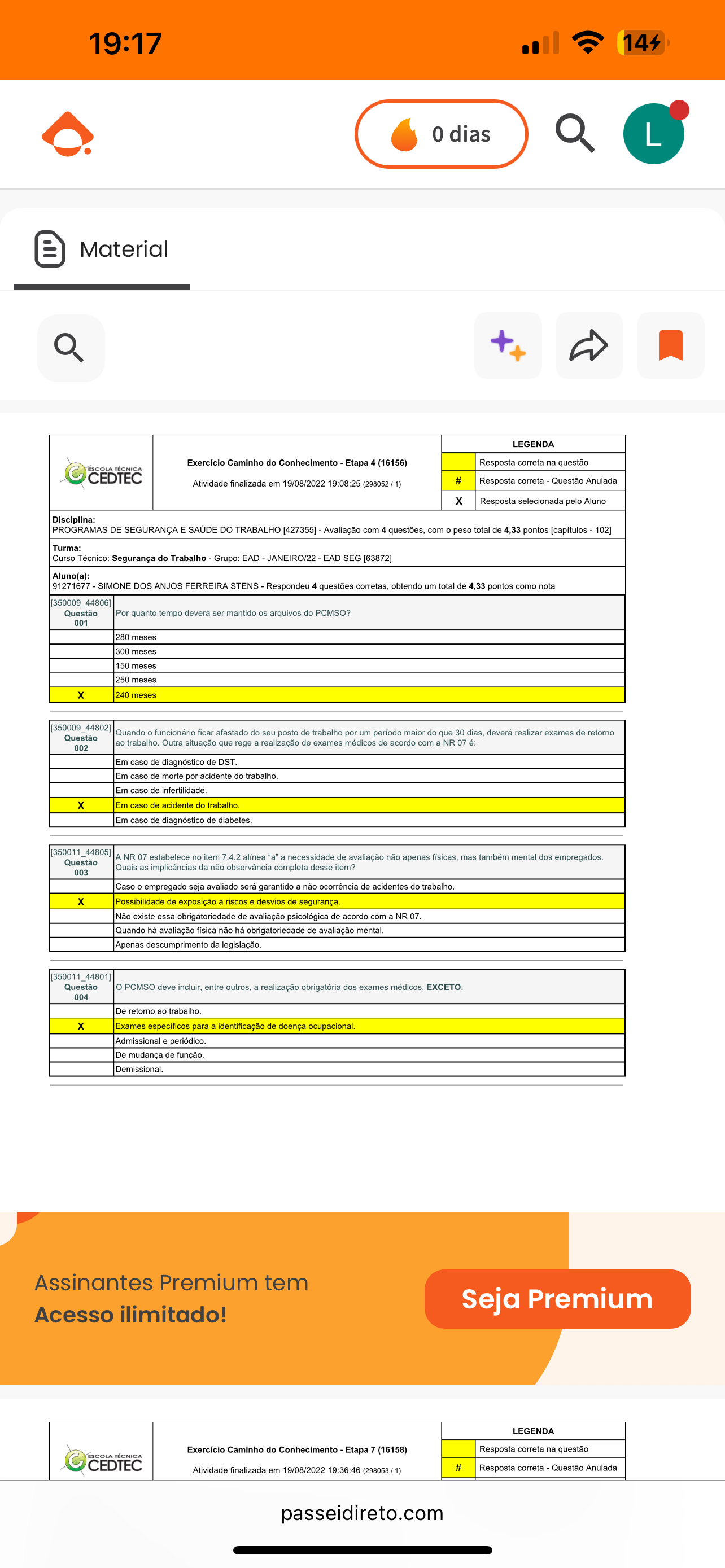 19:17 144 0 dias L Material LEGENDA Exercício Caminho do Conhecimento Etapa 4 (16156) Resposta correta na questão ESCOLA TÉCNICA CEDTEC Atividade finalizada em 19/08/2022 19:08:25 (298052 1) # Resposta correta Questão Anulada X Resposta selecionada pelo Aluno Disciplina: PROGRAMAS DE SEGURANÇA E SAÚDE DO TRABALHO [427355] Avaliação com 4 questões, com O peso total de 4,33 pontos [capítulos 102] Turma: Curso Técnico: Segurança do Trabalho Grupo: EAD JANEIRO/22 EAD SEG [63872] Aluno(a): 91271677 SIMONE DOS ANJOS FERREIRA STENS Respondeu 4 questões corretas, obtendo um total de 4,33 pontos como nota Questão Por quanto tempo deverá ser mantido arquivos do PCMSO? 001 280 meses 300 meses 150 meses 250 meses 240 meses Quando funcionário ficar afastado do seu posto de trabalho por um período maior do que 30 dias, deverá realizar exames de retorno Questão ao trabalho. Outra situação que rege realização de exames médicos de acordo com a NR 07 002 Em caso de diagnóstico de DST. Em caso de morte por acidente do Em caso de Em caso de acidente do trabalho. Em caso de diagnóstico de 35001 A NR 07 estabelece no item 7.4.2 alínea "a" a necessidade de avaliação não apenas físicas, mas também mental dos empregados. Questão Quais as implicâncias da não observância completa desse item? 003 Caso empregado seja avaliado será garantido a não ocorrência de acidentes do trabalho. Possibilidade de exposição a riscos e desvios de segurança. Não existe essa obrigatoriedade de avaliação psicológica de acordo com a NR 07. Quando há avaliação física não há obrigatoriedade de avaliação mental. Apenas descumprimento da legislação. Questão PCMSO deve incluir, entre outros, a realização obrigatória dos exames médicos, EXCETO: 004 De retorno ao trabalho. X Exames específicos para a identificação de doença ocupacional. Admissional periódico. De mudança de função. Assinantes Premium tem Acesso ilimitado! Seja Premium LEGENDA Exercício Caminho do Conhecimento Etapa 7 (16158) Resposta correta na questão ESCOLA TÉCNICA CEDTEC Atividade finalizada em 19/08/2022 19:36:46 (298053 # Resposta correta Questão Anulada passeidireto.com