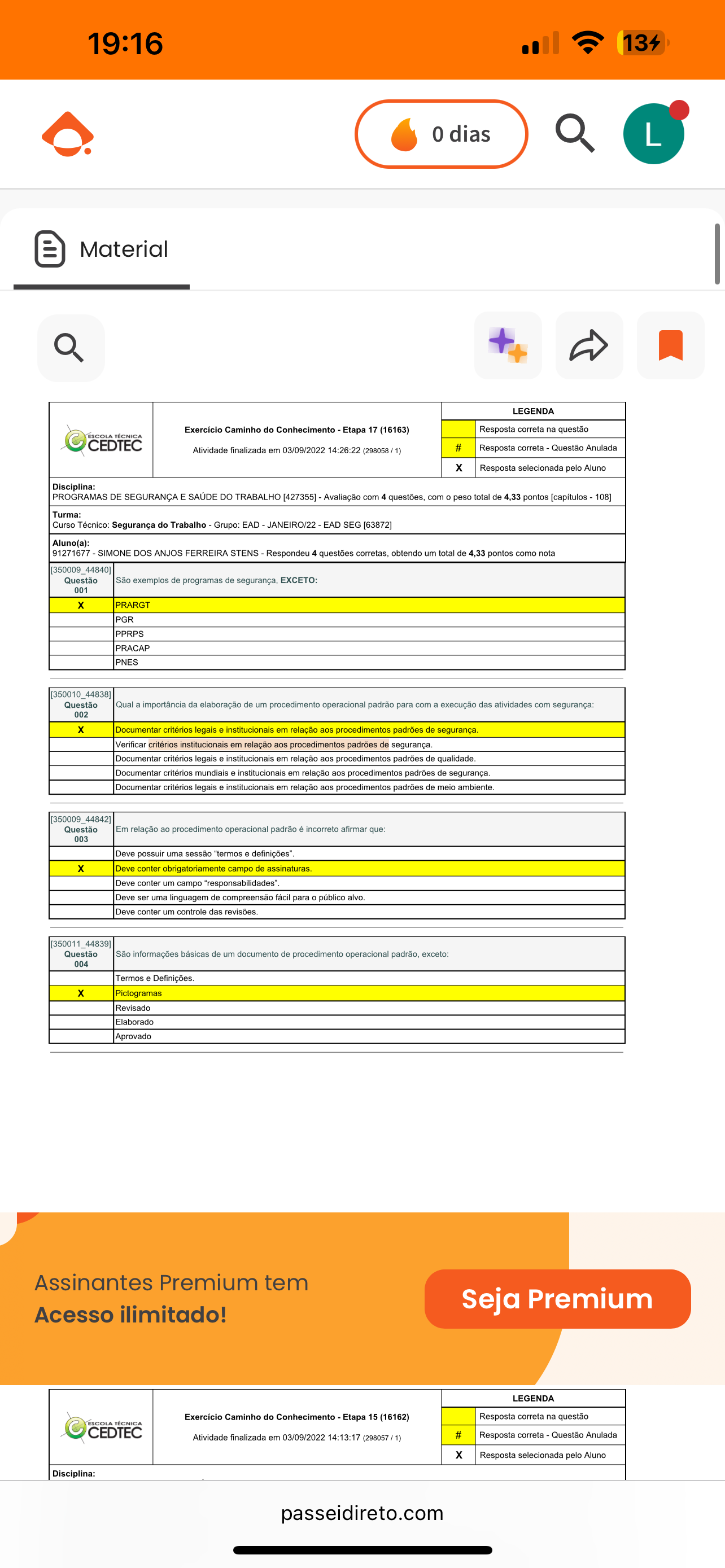 19:16 134 0 dias L Material LEGENDA Exercício Caminho do Conhecimento Etapa 17 (16163) Resposta correta na questão ESCOLA TÉCNICA CEDTEC Atividade finalizada em 03/09/2022 14:26:22 (298058 1) # Resposta correta Questão Anulada X Resposta selecionada pelo Aluno Disciplina: PROGRAMAS DE SEGURANÇA E SAÚDE DO TRABALHO [427355] Avaliação com 4 questões, com O peso total de 4,33 pontos [capítulos 108] Turma: Curso Técnico: Segurança do Trabalho Grupo: EAD JANEIRO/22 EAD SEG [63872] Aluno(a): 91271677 SIMONE DOS ANJOS FERREIRA STENS Respondeu 4 questões corretas, obtendo um total de 4,33 pontos como nota Questão São exemplos de programas de segurança, EXCETO: 001 PRARGT PGR PPRPS PRACAP PNES [350010_44838] Questão Qual a importância da elaboração de um procedimento operacional padrão para com a execução das atividades com segurança: 002 Documentar critérios legais e institucionais em relação aos procedimentos padrões de segurança. Verificar critérios institucionais em relação aos procedimentos padrões de segurança. Documentar critérios legais e institucionais em relação aos procedimentos padrões de qualidade. Documentar critérios mundiais e institucionais em relação aos procedimentos padrões de segurança. Documentar critérios legais e institucionais em relação aos procedimentos padrões de meio ambiente. [350009_44842] Questão Em relação ao procedimento operacional padrão é incorreto afirmar que: 003 Deve possuir uma sessão "termos e definições" Deve conter obrigatoriamente campo de Deve conter um campo "responsabilidades". Deve ser uma linguagem de compreensão para O público alvo. Deve conter um controle das revisões. [350011_44839] Questão São informações básicas de um documento de procedimento operacional padrão, exceto: 004 Termos Definições. Pictogramas Revisado Elaborado Aprovado Assinantes Premium tem Acesso ilimitado! Seja Premium LEGENDA Exercício Caminho do Conhecimento Etapa 15 (16162) Resposta correta na questão ESCOLA TÉCNICA CEDTEC Atividade finalizada em 03/09/2022 14:13:17 (298057 # Resposta correta Questão Anulada X Resposta selecionada pelo Aluno Disciplina: passeidireto.com