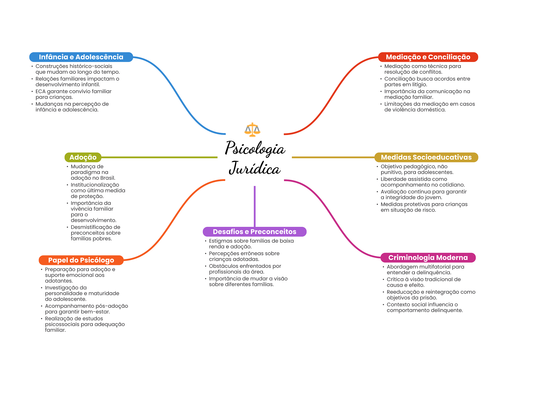 Infância e Adolescência Mediação e Conciliação Construções histórico-sociais Mediação como técnica para que mudam ao longo do tempo. resolução de conflitos. Relações familiares impactam Conciliação busca acordos entre desenvolvimento infantil. partes em litígio. ECA garante convívio familiar Importância da comunicação na para crianças. mediação familiar. Mudanças na percepção de Limitações da mediação em casos infância e adolescência. de violência doméstica. Psicologia Adoção Medidas Socioeducativas Mudança de paradigma na Jurídica Objetivo pedagógico, não punitivo, para adolescentes. adoção no Brasil. Liberdade assistida como Institucionalização acompanhamento no cotidiano. como última medida Avaliação contínua para garantir de proteção. a integridade do jovem. Importância da Medidas protetivas para crianças vivência familiar em situação de risco. para Desmistificação de preconceitos sobre Desafios e Preconceitos famílias pobres. Estigmas sobre famílias de baixa renda e adoção. Percepções errôneas sobre Papel do Psicólogo crianças adotadas. Criminologia Moderna Obstáculos enfrentados por Preparação para adoção e Abordagem multifatorial para profissionais da área. suporte emocional aos entender a delinquência. adotantes. Importância de mudar a visão Crítica à visão tradicional de sobre diferentes famílias. causa e efeito. Investigação da personalidade e maturidade Reeducação e reintegração como do adolescente. objetivos da prisão. Acompanhamento pós-adoção Contexto social influencia O para garantir bem-estar. comportamento delinquente. Realização de estudos psicossociais para adequação familiar.