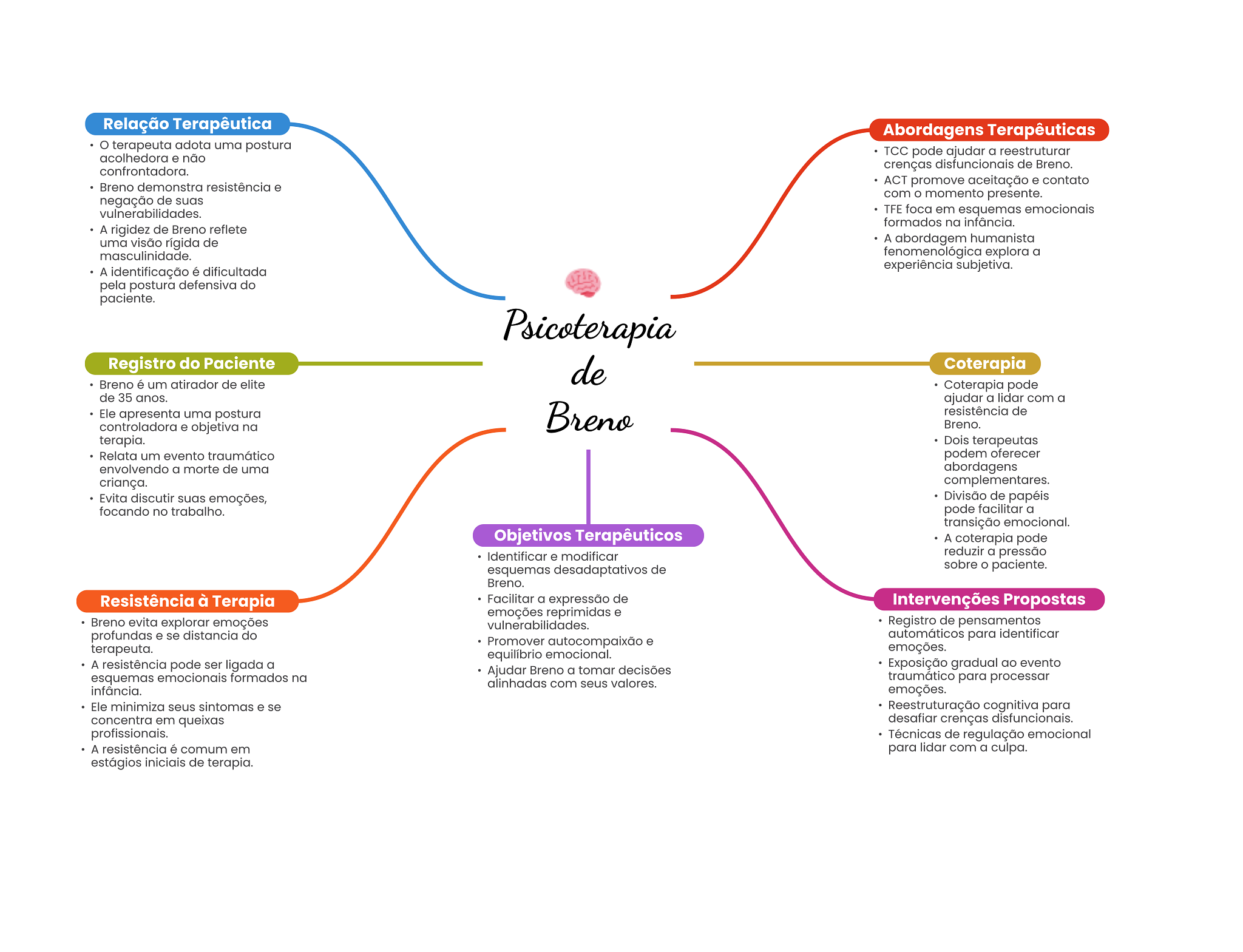 Relação Terapêutica Abordagens Terapêuticas terapeuta adota uma postura acolhedora e não TCC pode ajudar a reestruturar confrontadora. crenças disfuncionais de Breno. Breno demonstra resistência e ACT promove aceitação e contato com momento presente. negação de suas vulnerabilidades. TFE foca em esquemas emocionais formados na infância. A rigidez de Breno reflete uma visão rígida de A abordagem humanista masculinidade. fenomenológica explora a A identificação é dificultada experiência subjetiva. pela postura defensiva do paciente. Psicoterapia Registro do Paciente de Coterapia Breno é um atirador de elite Coterapia pode de 35 anos. ajudar a lidar com a Ele apresenta uma postura Breno resistência de controladora e objetiva na Breno. terapia. Dois terapeutas Relata um evento traumático podem oferecer envolvendo a morte de uma abordagens criança. complementares. Evita discutir suas emoções, Divisão de papéis focando no trabalho. pode facilitar a transição emocional. Objetivos Terapêuticos A coterapia pode Identificar e modificar reduzir a pressão esquemas desadaptativos de sobre O paciente. Breno. Resistência à Terapia Facilitar a expressão de Intervenções Propostas emoções reprimidas e Breno evita explorar emoções vulnerabilidades. Registro de pensamentos profundas e se distancia do automáticos para identificar Promover autocompaixão e terapeuta. emoções. equilíbrio emocional. A resistência pode ser ligada a Ajudar Breno a tomar decisões Exposição gradual ao evento esquemas emocionais formados na alinhadas com seus valores. traumático para processar infância. emoções. Ele minimiza seus sintomas e se Reestruturação cognitiva para concentra em queixas desafiar crenças disfuncionais. profissionais. Técnicas de regulação emocional A resistência é comum em para lidar com a culpa. estágios iniciais de terapia.