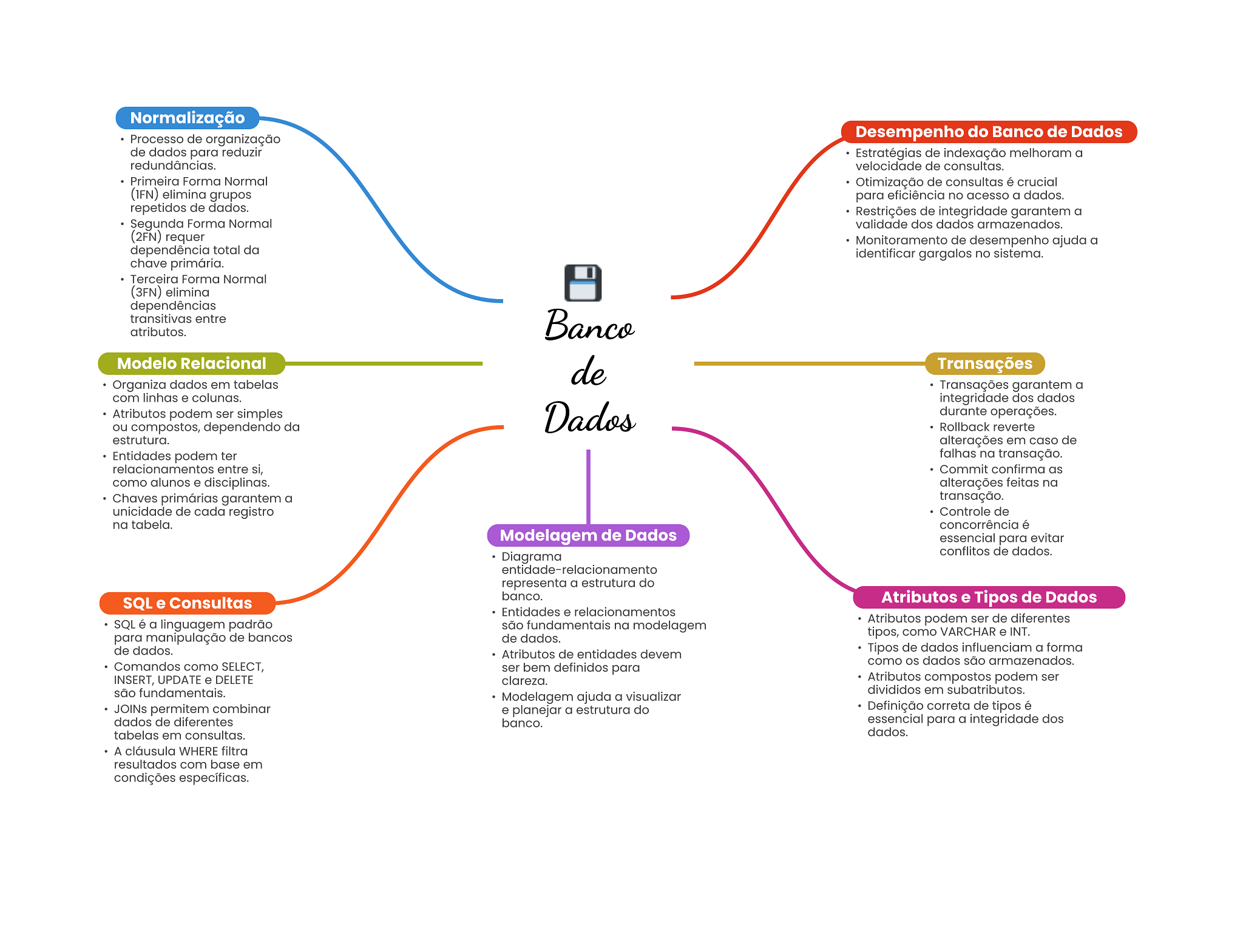 Normalização Processo de organização Desempenho do Banco de Dados de dados para reduzir Estratégias de indexação melhoram a redundâncias. velocidade de consultas. Primeira Forma Normal Otimização de consultas é crucial (1FN) elimina grupos para eficiência no acesso a dados. repetidos de dados. Restrições de integridade garantem a Segunda Forma Normal validade dos dados armazenados. (2FN) requer Monitoramento de desempenho ajuda a dependência total da identificar gargalos no sistema. chave primária. Terceira Forma Normal (3FN) elimina dependências transitivas entre atributos. Banco Modelo Relacional de Transações Organiza dados em tabelas Transações garantem a com linhas e colunas. integridade dos dados Atributos podem ser simples Dados durante operações. ou compostos, dependendo da Rollback reverte estrutura. alterações em caso de Entidades podem ter falhas na transação. relacionamentos entre si, Commit confirma as como alunos e disciplinas. alterações feitas na Chaves primárias garantem a transação. unicidade de cada registro Controle de na tabela. concorrência é Modelagem de Dados essencial para evitar conflitos de dados. Diagrama entidade-relacionamento representa a estrutura do banco. SQL e Consultas Atributos e Tipos de Dados Entidades e relacionamentos SQL é a linguagem padrão Atributos podem ser de diferentes são fundamentais na modelagem para manipulação de bancos de dados. tipos, como VARCHAR e INT. de dados. Atributos de entidades devem Tipos de dados influenciam a forma como OS dados são armazenados. Comandos como SELECT, ser bem definidos para INSERT, UPDATE e DELETE clareza. Atributos compostos podem ser são fundamentais. divididos em subatributos. Modelagem ajuda a visualizar JOINs permitem combinar e planejar a estrutura do Definição correta de tipos é dados de diferentes banco. essencial para a integridade dos tabelas em consultas. dados. A cláusula WHERE filtra resultados com base em condições específicas.