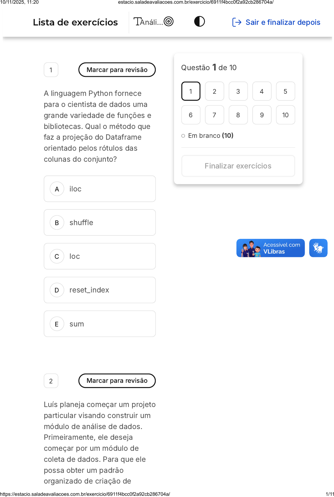 A B C D E 1 Marcar para revisão A linguagem Python fornece para o cientista de dados uma grande variedade de funções e bibliotecas. Qual o método que faz a projeção do Dataframe orientado pelos rótulos das colunas do conjunto? iloc shuffle loc reset_index sum 2 Marcar para revisão Luís planeja começar um projeto particular visando construir um módulo de análise de dados. Primeiramente, ele deseja começar por um módulo de coleta de dados. Para que ele possa obter um padrão organizado de criação de Questão 1 de 10 Em branco (10) 1 2 3 4 5 6 7 8 9 10 Finalizar exercícios Lista de exercícios Análi… Sair e finalizar depois 10/11/2025, 11:20 estacio.saladeavaliacoes.com.br/exercicio/6911f4bcc0f2a92cb286704a/ https://estacio.saladeavaliacoes.com.br/exercicio/6911f4bcc0f2a92cb286704a/ 1/11 A B projeto, qual é a sequência desejável de passos que esperamos que Luís siga? Criar uma pasta para acomodar seu projeto; Levantar um virtualenv através do venv; Instalar as dependências com as quais ele quer trabalhar através do pip install; congelar as mesmas no requirements.txt através do pip freeze; criar uma pasta para o módulo de coleta e dentro dela criar um arquivo __init__.py em branco e outro para a lógica do módulo. Criar uma pasta para acomodar seu projeto; Instalar as dependências com as quais ele quer trabalhar através do pip install; congelar as mesmas no requirements.txt através do pip freeze; criar uma pasta para o módulo de coleta e dentro dela criar um arquivo __init__.py em branco e outro para a lógica do módulo. 10/11/2025, 11:20 estacio.saladeavaliacoes.com.br/exercicio/6911f4bcc0f2a92cb286704a/ https://estacio.saladeavaliacoes.com.br/exercicio/6911f4bcc0f2a92cb286704a/ 2/11 C D Criar uma pasta para acomodar seu projeto; Instalar as dependências com as quais ele quer trabalhar através do pip install; criar uma pasta para o módulo de coleta e dentro dela criar um arquivo __init__.py em branco e outro para a lógica do módulo. Criar uma pasta para acomodar seu projeto; Levantar um virtualenv através do venv; Instalar as dependências com as quais ele quer trabalhar através do pip install; congelar as mesmas no requirements.txt através do pip freeze; criar uma pasta para o módulo de coleta e dentro dela criar um para a lógica do módulo. 10/11/2025, 11:20 estacio.saladeavaliacoes.com.br/exercicio/6911f4bcc0f2a92cb286704a/ https://estacio.saladeavaliacoes.com.br/exercicio/6911f4bcc0f2a92cb286704a/ 3/11 E A B Criar uma pasta para acomodar seu projeto; Levantar um virtualenv através do venv; Instalar as dependências com as quais ele quer trabalhar através do pip install; congelar as mesmas no requirements.txt através do pip freeze; criar uma pasta para o módulo de coleta e dentro dela criar um arquivo __init__.py com a lógica do módulo. 3 Marcar para revisão A função de agrupamento do Pandas é o groupby, responsável por influenciar a indexação das colunas. O que acontece ao aplicarmos o método reset_index() no resultado de uma agregação? Nada, o DataFrame fica imutável. Os índices não são deletados, evitando a perda de colunas no DataFrame da agregação. 10/11/2025, 11:20 estacio.saladeavaliacoes.com.br/exercicio/6911f4bcc0f2a92cb286704a/ https://estacio.saladeavaliacoes.com.br/exercicio/6911f4bcc0f2a92cb286704a/ 4/11 C D E A B C As colunas de agrupamento somem, e o DataFrame passa a ser indexado pelo número da linha. O DataFrame é indexado pelas suas colunas. O DataFrame é embaralhado. 4 Marcar para revisão A visualização dos dados é fundamental no processo de análise, interpretação e obtenção de conhecimento. Dentre as visualizações mais adequadas para dados numéricos estão: I - Histograma II - Gráfico de Dispersão III - Gráfico de Pizza Analisem as alternativas listadas e assinalem a correta. Apenas I e III Apenas II e III Apenas I e II 10/11/2025, 11:20 estacio.saladeavaliacoes.com.br/exercicio/6911f4bcc0f2a92cb286704a/ https://estacio.saladeavaliacoes.com.br/exercicio/6911f4bcc0f2a92cb286704a/ 5/11 D E A B C Apenas III As alternativas I, II e III 5 Marcar para revisão A linguagem Python se destaca como intuitiva e de fácil aprendizagem. Analise o código abaixo que apresenta laços condicionais e instruções de repetição. for i in range(10): if (i%2==0): print(i) Qual a saída esperada após a execução do programa? Serão impressos no console os números ímpares entre 0 e 9. Serão impressos no console os números ímpares entre 0 e 10. Serão impressos no console os números pares entre 1 e 10. 10/11/2025, 11:20 estacio.saladeavaliacoes.com.br/exercicio/6911f4bcc0f2a92cb286704a/ https://estacio.saladeavaliacoes.com.br/exercicio/6911f4bcc0f2a92cb286704a/ 6/11 D E A B C D E Serão impressos no console os números pares entre 0 e 9. Serão impressos no console os números racionais entre 0 e 9. 6 Marcar para revisão Dados categóricos são aqueles normalmente expressos por texto, que representam rótulos, nomes e símbolos. Qual tipo de visualização de dados abaixo é recomendado para dados categóricos? Gráficos de Linha. Gráficos de Barra. Gráfico de Matriz de Dispersão. Gráfico de Faces de Chernoff. Gráfico de Estrela. 10/11/2025, 11:20 estacio.saladeavaliacoes.com.br/exercicio/6911f4bcc0f2a92cb286704a/ https://estacio.saladeavaliacoes.com.br/exercicio/6911f4bcc0f2a92cb286704a/ 7/11 A B C 7 Marcar para revisão Gabriel entrou recentemente em uma empresa de gestão de fundos de investimento. No seu primeiro dia de trabalho, lhe é conferida a tarefa de buscar os relatórios do pessoal da contabilidade para fazer suas análises exploratórias. O departamento de contabilidade extrai os dados de seus relatórios de um SAP que retorna valores brutos de compras, quantidades de produtos etc. Então os contadores organizam, por agregação, informação relevante no relatório em planilhas por eles desenvolvidos. Por questões de acesso e segurança, Gabriel só pode lidar com essas planil