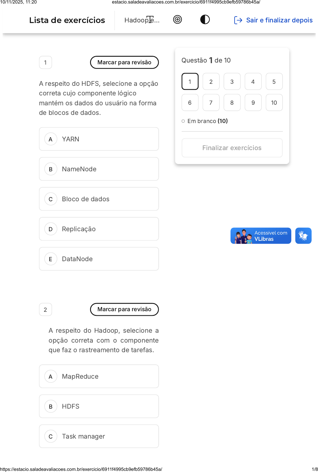 A B C D E A B C 1 Marcar para revisão A respeito do HDFS, selecione a opção correta cujo componente lógico mantém os dados do usuário na forma de blocos de dados. YARN NameNode Bloco de dados Replicação DataNode 2 Marcar para revisão A respeito do Hadoop, selecione a opção correta com o componente que faz o rastreamento de tarefas. MapReduce HDFS Task manager Questão 1 de 10 Em branco (10) 1 2 3 4 5 6 7 8 9 10 Finalizar exercícios Lista de exercícios Hadoop e… Sair e finalizar depois 10/11/2025, 11:20 estacio.saladeavaliacoes.com.br/exercicio/6911f4995cb9efb59786b45a/ https://estacio.saladeavaliacoes.com.br/exercicio/6911f4995cb9efb59786b45a/ 1/8 D E A B C D E Camada de ingestão Mrjob 3 Marcar para revisão Em relação ao Data Lake, selecione a opção correta que contenha o(s) formato(s) de dados que pode(m) ser armazenado(s) nele. Apenas estruturado Estruturado e semiestruturado Estruturado, não estruturado e semiestruturado Apenas não estruturado Apenas tabelas relacionais 4 Marcar para revisão Reconhecer os conceitos de Data Lake é fundamental para o profissional de Tecnologia da Informação. Selecione a opção correta que define resumidamente o que é o Data Lake. 10/11/2025, 11:20 estacio.saladeavaliacoes.com.br/exercicio/6911f4995cb9efb59786b45a/ https://estacio.saladeavaliacoes.com.br/exercicio/6911f4995cb9efb59786b45a/ 2/8 A B C D E A B C É um repositório para tratamento dos dados. É uma tecnologia de armazenamento e processamento de dados. É um repositório centralizado para armazenamento de dados. É um ambiente para tratamento e armazenamento apenas de dados relacionais. Trata-se de um componente do HDFS responsável pela implementação do mecanismo MapReduce para fazer o gerenciamento dos dados. 5 Marcar para revisão Reconhecer os conceitos de Data Lake é fundamental para o profissional de Tecnologia da Informação. Selecione a opção correta a respeito do Data Lake. Possui alta latência para acesso dos dados. Aplica processos de tratamento nos dados. Armazena os dados de modo eficiente. 10/11/2025, 11:20 estacio.saladeavaliacoes.com.br/exercicio/6911f4995cb9efb59786b45a/ https://estacio.saladeavaliacoes.com.br/exercicio/6911f4995cb9efb59786b45a/ 3/8 D E A B C Demanda por equipamentos especiais. São exclusivos da distribuição Hadoop Apache. 6 Marcar para revisão Organizações que lidam com grandes volumes de dados, como redes sociais e plataformas de streaming, frequentemente adotam soluções específicas para garantir desempenho, escalabilidade e tolerância a falhas. Uma dessas soluções é o Hadoop, cuja arquitetura é composta por diversos componentes que trabalham em conjunto. Considerando a função desses componentes, qual deles é responsável por armazenar os dados efetivos dentro do cluster Hadoop? YARN, por ser o componente responsável pelo agendamento e gerenciamento de tarefas distribuídas NameNode, por conter os metadados que descrevem a localização dos arquivos armazenados MapReduce, por possibilitar a divisão das tarefas em pares chave-valor para processamento paralelo 10/11/2025, 11:20 estacio.saladeavaliacoes.com.br/exercicio/6911f4995cb9efb59786b45a/ https://estacio.saladeavaliacoes.com.br/exercicio/6911f4995cb9efb59786b45a/ 4/8 D E A B C DataNode, por ser o responsável direto pelo armazenamento físico dos dados no cluster Hadoop Common, por fornecer bibliotecas e scripts necessários à execução dos demais componentes 7 Marcar para revisão Durante a execução de aplicações com Hadoop, a fase de redução desempenha papel fundamental no processamento final dos dados. Essa etapa é precedida por um processo que organiza e redistribui os pares chave-valor gerados pelas tarefas de mapeamento, otimizando a carga de trabalho entre os nós. Qual é o nome desse processo e qual é sua principal contribuição? Combinação – reduz a quantidade de tarefas no redutor ao eliminar duplicatas Classificação – organiza os dados em ordem alfabética antes da gravação final Embaralhamento – redistribui os dados intermediários para os redutores corretos 10/11/2025, 11:20 estacio.saladeavaliacoes.com.br/exercicio/6911f4995cb9efb59786b45a/ https://estacio.saladeavaliacoes.com.br/exercicio/6911f4995cb9efb59786b45a/ 5/8 D E A B C D E Particionamento – divide os dados em grupos com base em similaridade semântica Agendamento – determina quais tarefas devem ser executadas com prioridade 8 Marcar para revisão O Hadoop é uma tecnologia especializada em atender as demandas de Big Data. Selecione a opção correta que contenha a linguagem de programação utilizada para o desenvolvimento e implementação do Hadoop. Python Java Lua JavaScript Perl 9 Marcar para revisão O Hadoop é um framework de código aberto voltado para aplicações de Big Data. Neste sentido, selecione a alternativa 10/11/2025, 11:20 estacio.saladeavaliacoes.com.br/exercicio/6911f4995cb9efb59786b45a/ https://estacio.saladeavaliacoes.com.br/exercicio/6911f4995cb9efb59786b45a/ 6/8 A B C D E correta que apresenta um grande desafio no processo de configuração e gerenciamento do Hadoop. Processos de extração, transformação e carregamento dos dados. Mecanismo para melhorar o processamento dos dados. Aplicar políticas de segurança. Gerenciamento do armazenamento de dados. Tratar dados não- estruturados. 10 Marcar para revisão A arquitetura do Hadoop é projetada para garantir alto desempenho na manipulação de grandes volumes de dados distribuídos. Um de seus principais diferenciais é a capacidade de dividir tarefas entre diversos nós do cluster. Qual componente da arquitetura Hadoop é responsável por gerenciar os recursos computacionais disponíveis e monitorar o uso de CPU, memória e disco em cada máquina do cluster? 10/11/2025, 11:20 estacio.saladeavaliacoes.com.br/exercicio/6911f4995cb9efb59786b45a/ https://estacio.saladeavaliacoes.com.br/exercicio/6911f4995cb9efb59786b45a/ 7/8 A B C D E NameNode NodeManager DataNode TaskTrac